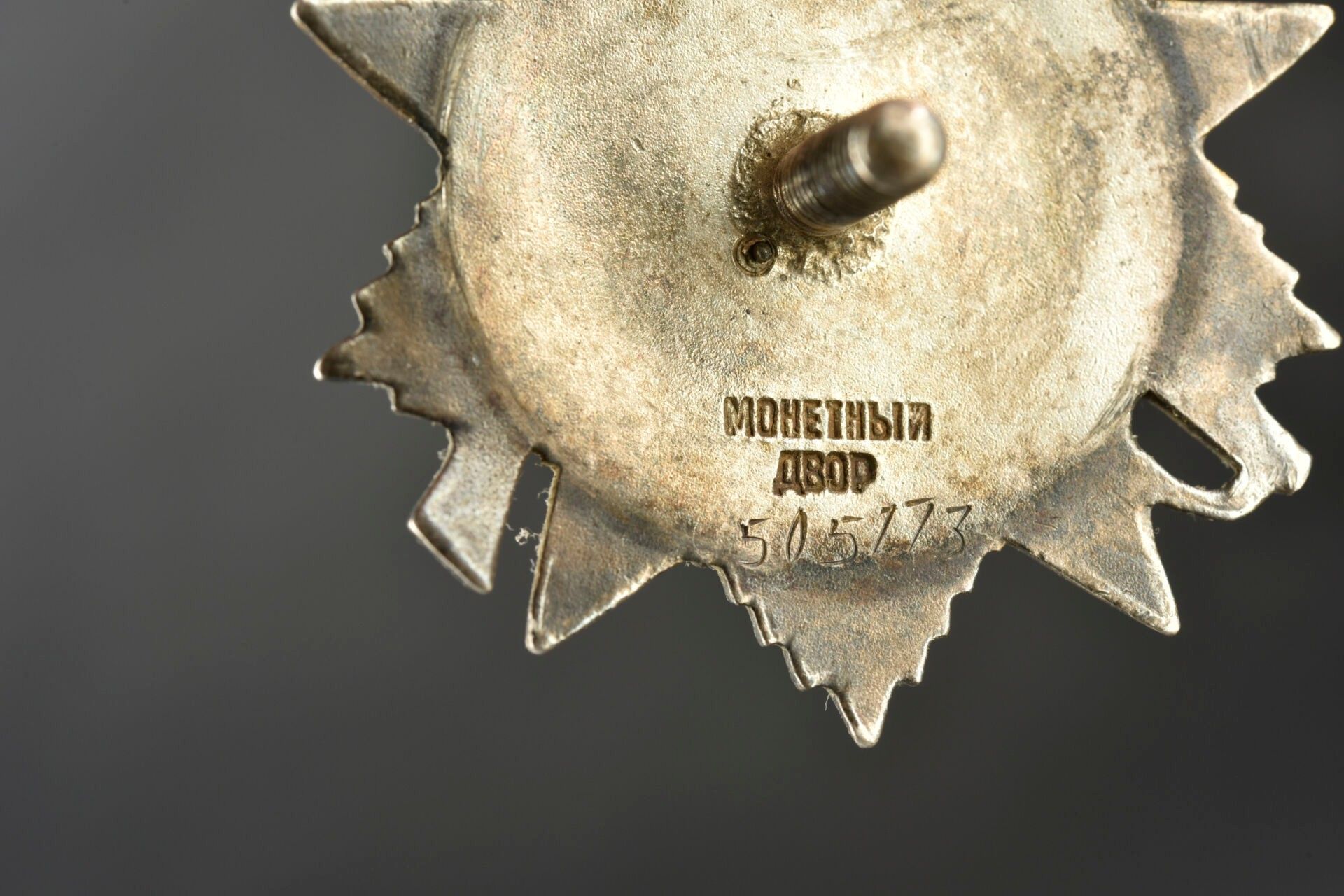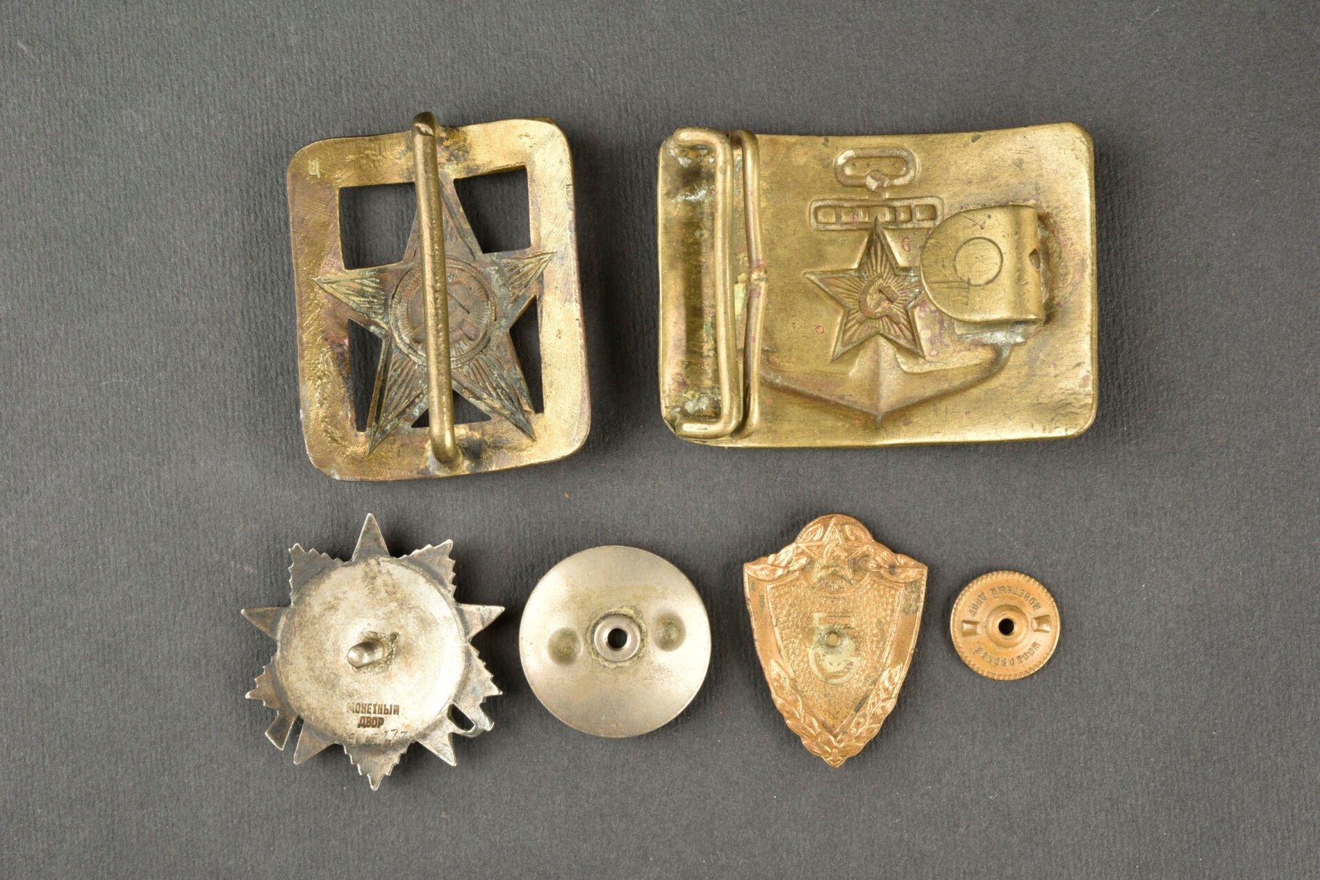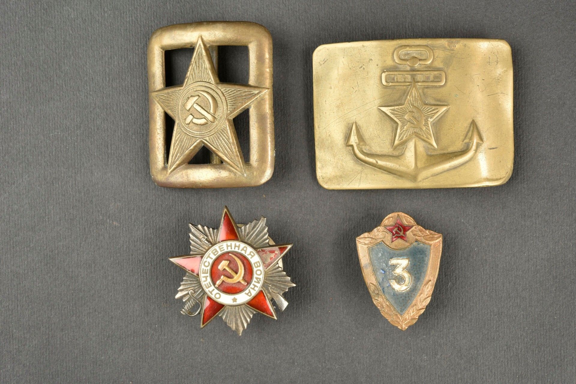 Set of Russian insignia. Including an order of the patriotic war of second class. Enamelled metal. Complete screw fastening. Number 505773 engraved on the back. Made by the Moscow mint. A third class soldier's badge, painted pattern and metal. Complete screw fastener, made by the Moscow State Mint. A Russian Navy belt buckle. A Russian officer's belt buckle. Some wear and patina. Condition II+. 2+