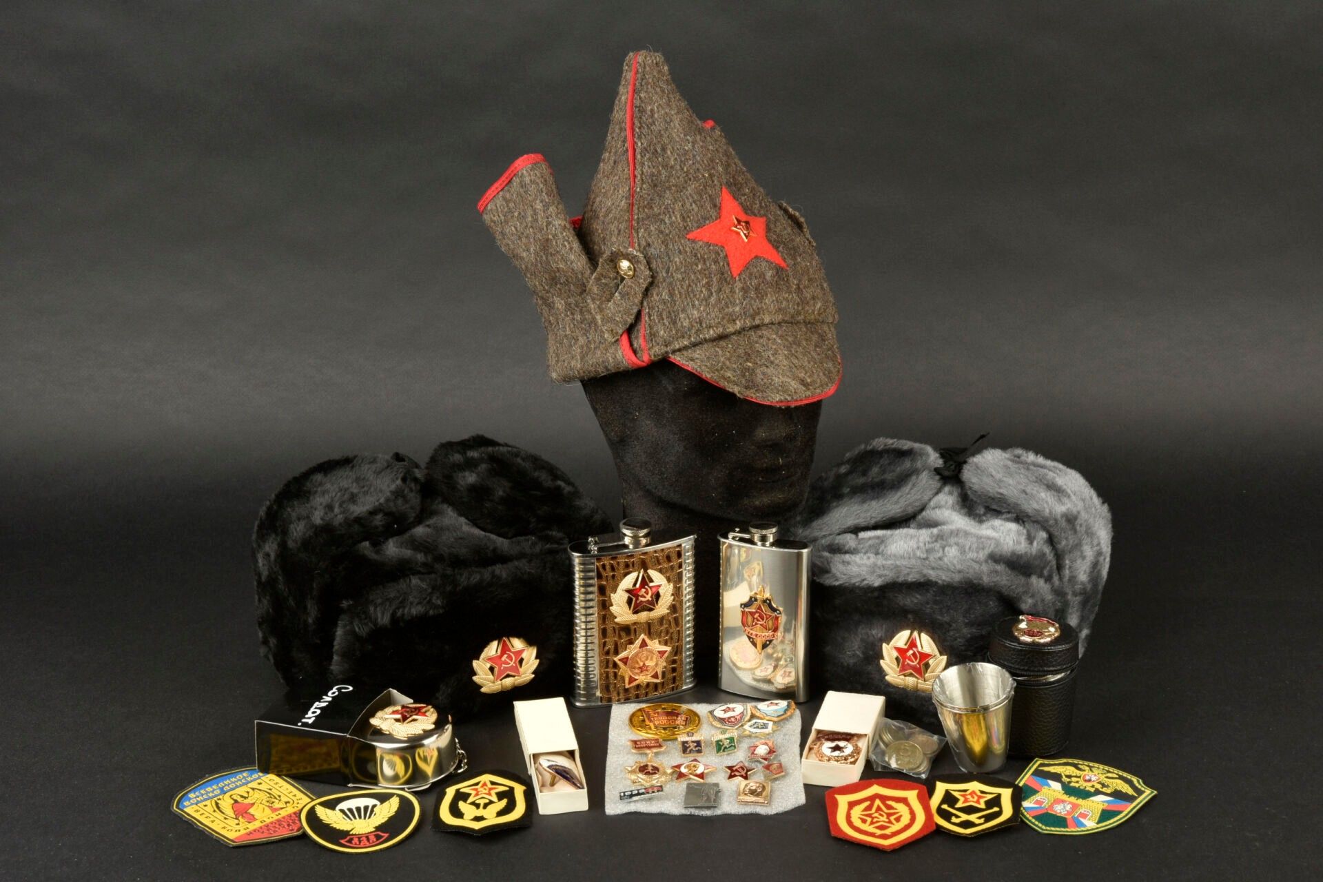 Russian lot. Comprising three different models of headdress. 14 metal badges. Six sleeve badges. Two metal flasks. A set of coins. One parachutist badge in box. One Russian insignia in box. A folding cup, in its box. A set of cups in a box. Some wear and patina on the coins. Condition I-. 1-