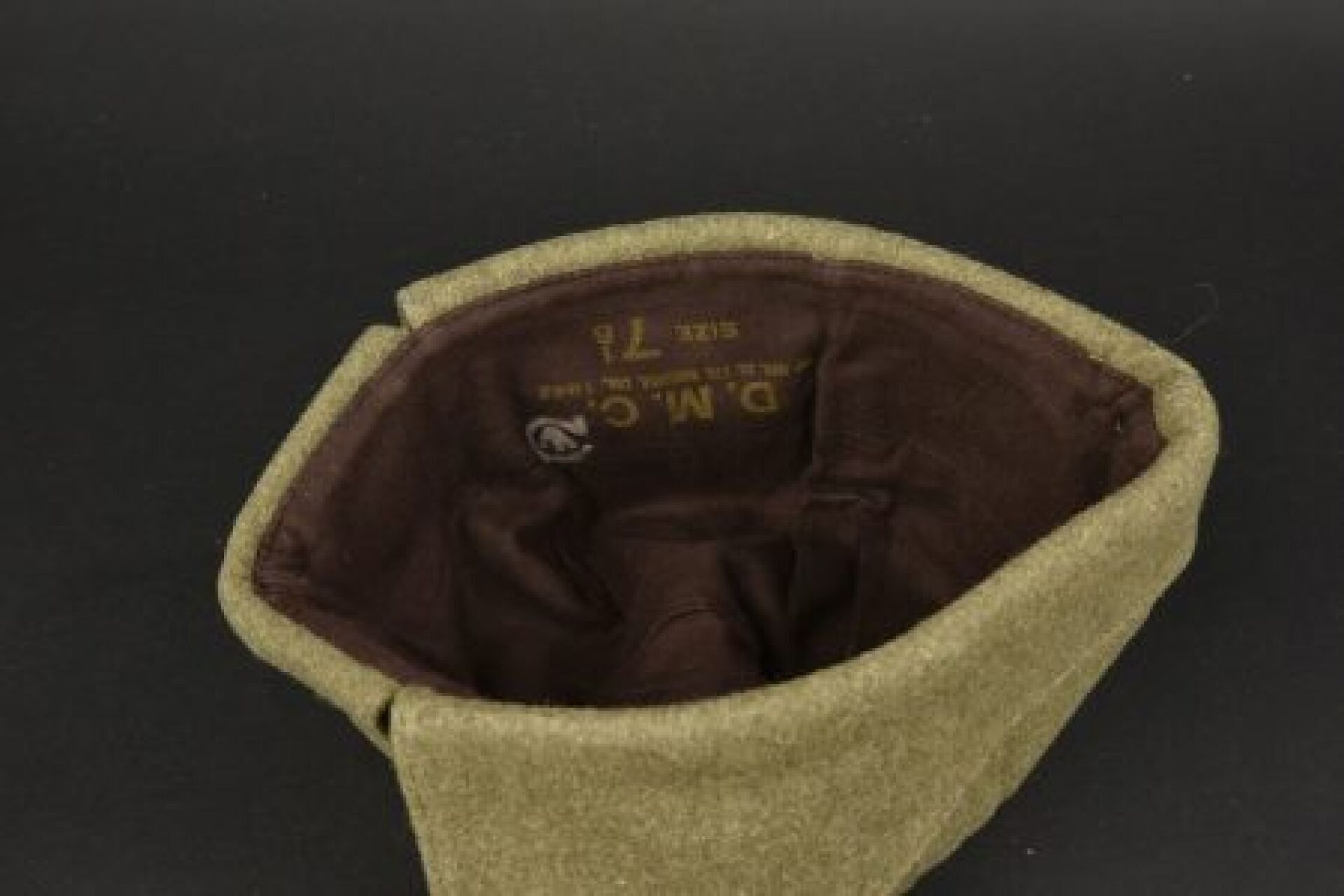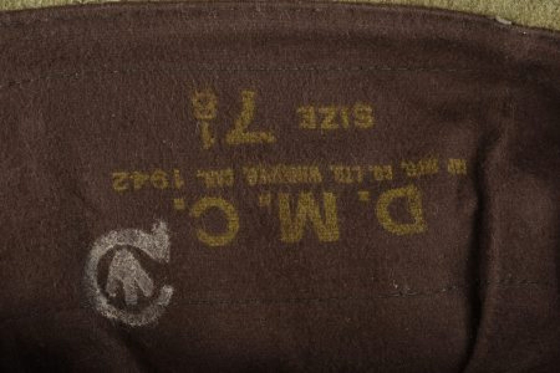 Canadian cap. Thick khaki cloth. Canvas chinstrap holding the flaps. The earflaps are partially frayed. Lined with brown cloth. Nice Canadian marking. Manufactured by DMC Cap MFG Co Ltd Winnipeg Can. Size 7 1/8 1942. To note a light wear and patina of the piece. Condition I-. 1-