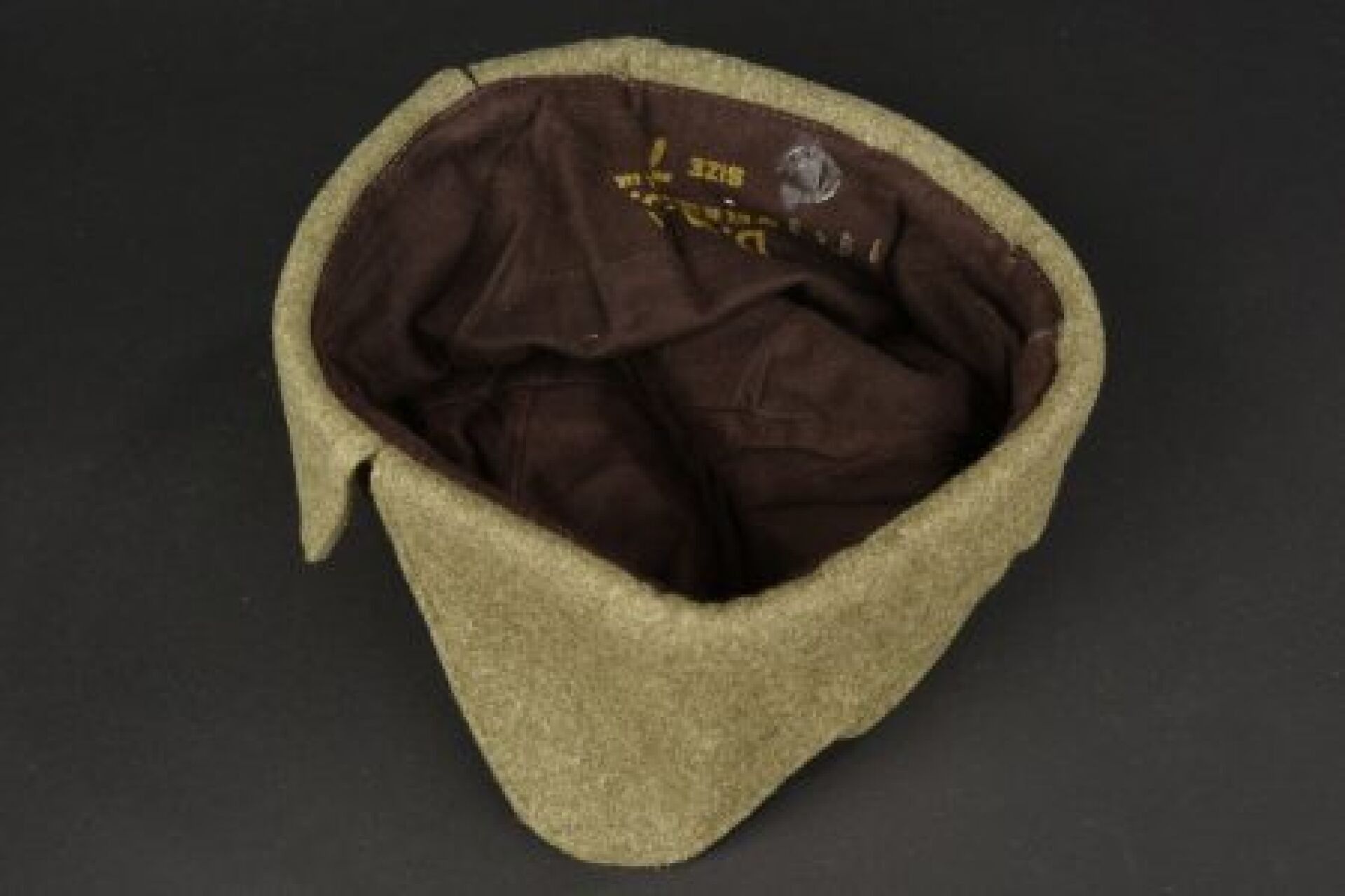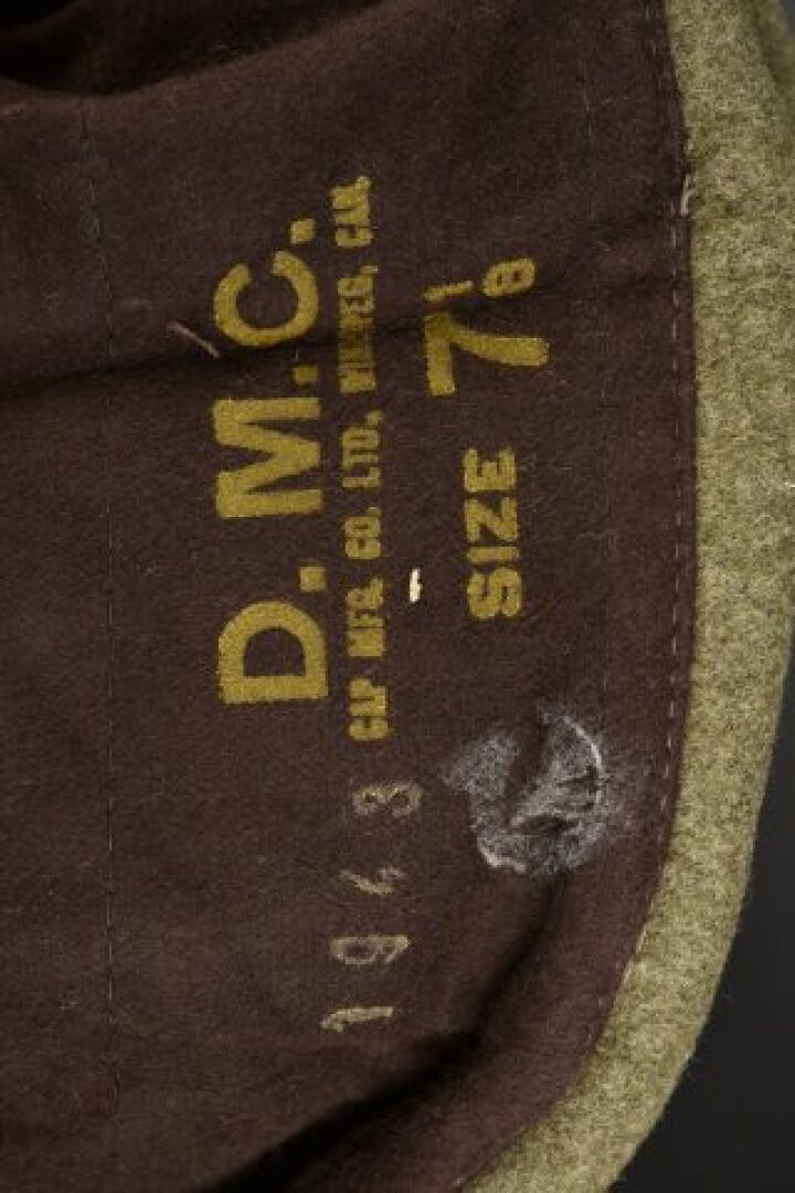 Canadian cap. Thick khaki cloth. Canvas chinstrap holding the flaps. The earflaps are partially frayed. Lined with brown cloth. Nice Canadian marking. Manufactured by DMC Cap MFG Co Ltd Winnipeg Can. Size 7 1/8 1943. To note a light wear and patina of the piece. Condition I-. 1-