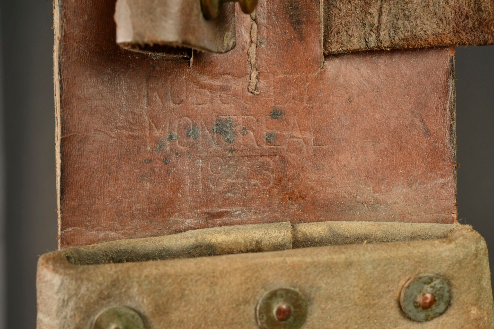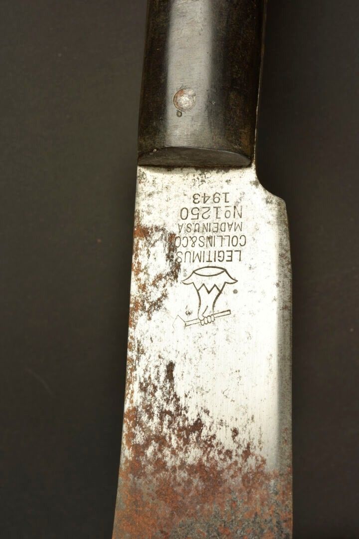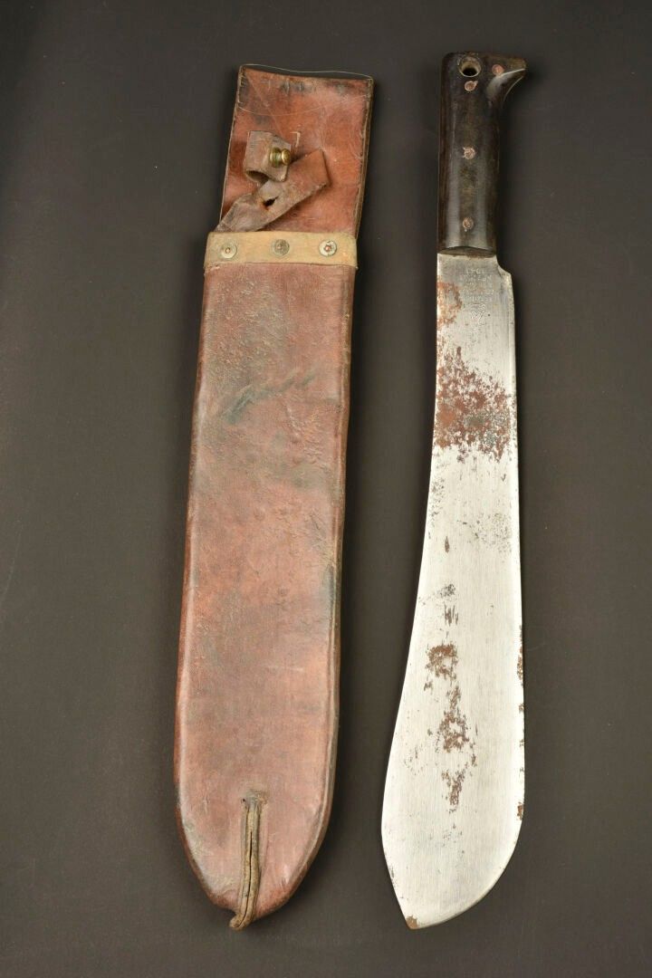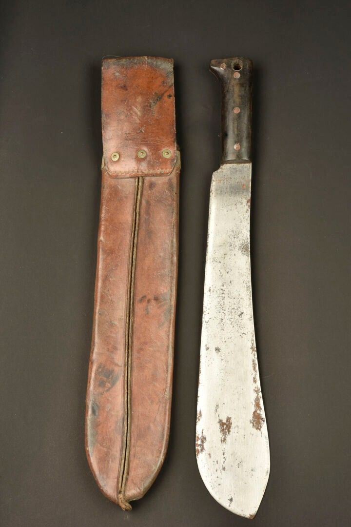 US Canadian machete. Brown leather sheath. Made by Robco LTD Montreal 1943. The closing strap is cracked and very fragile. American machete. Plates held in place by four rivets. Blade in good condition, but with traces of oxidation. Made by Legitimus Collins & Co Made in USA no 1250 1943. Blade length 37 cm. Some wear and oxidation. Condition II+. For adults only.