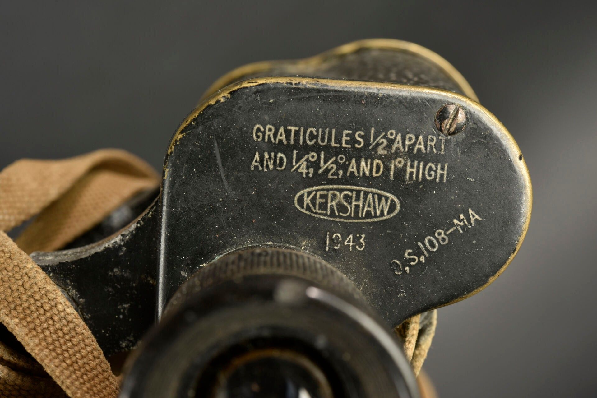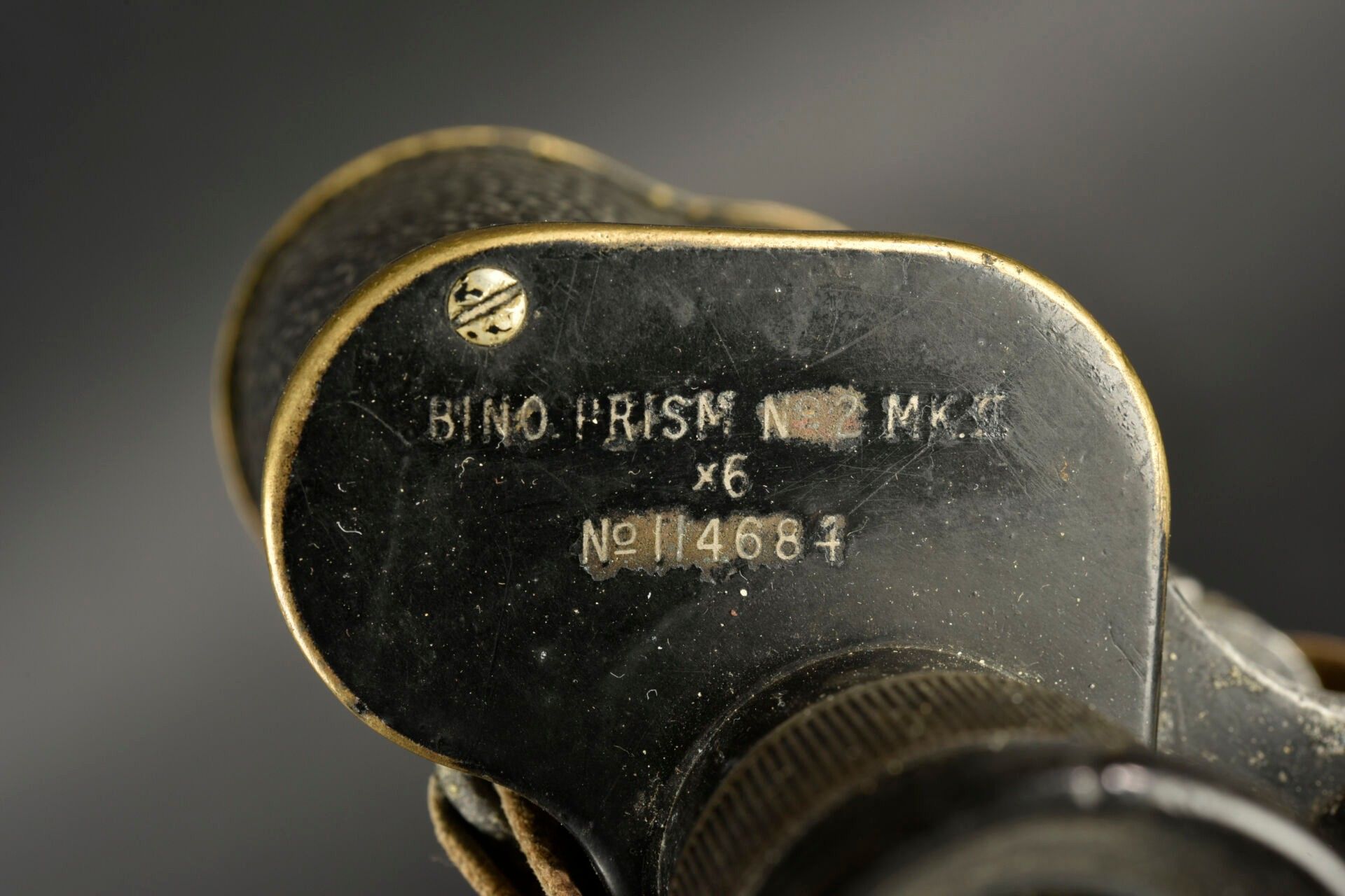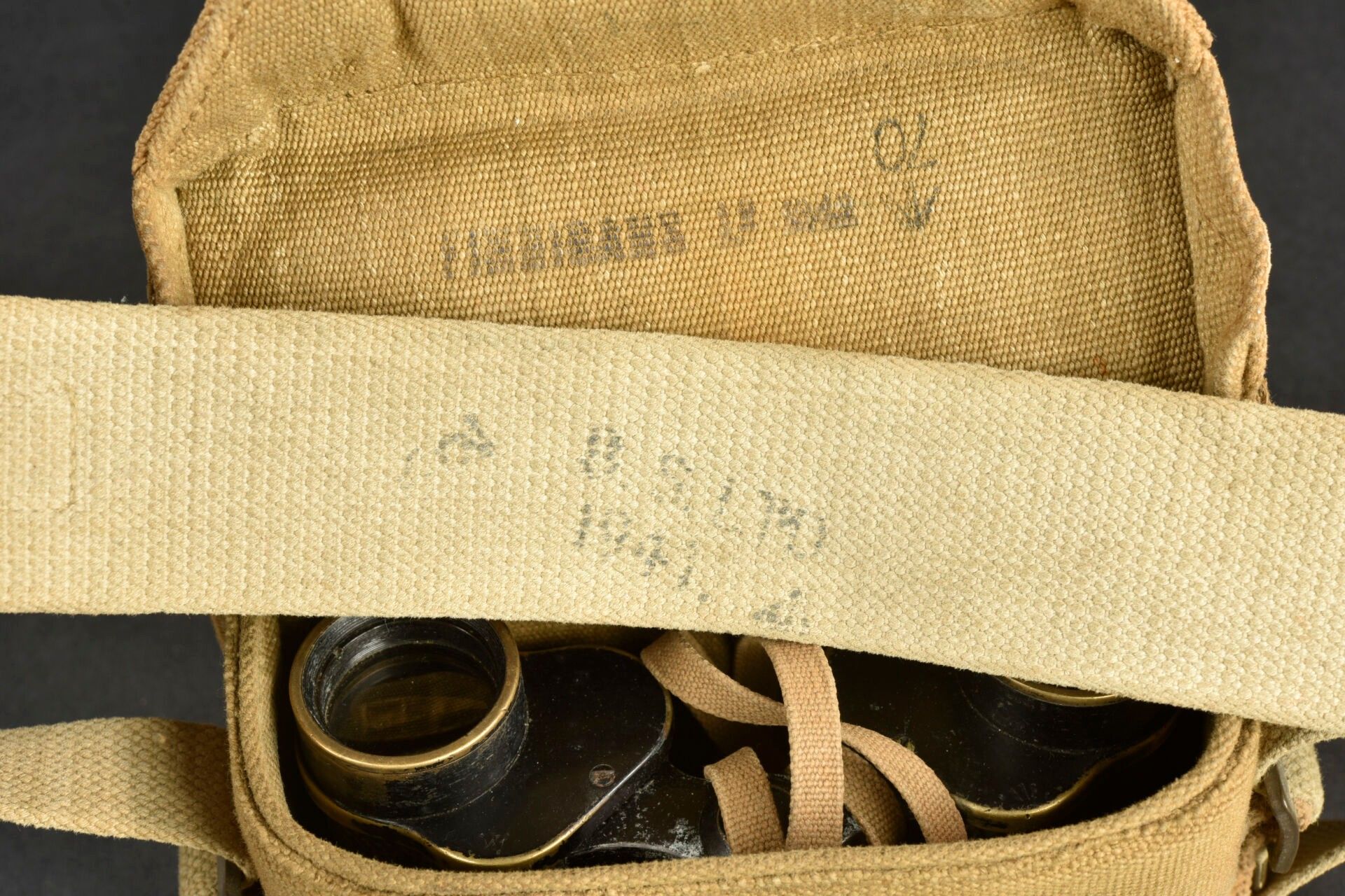 British binoculars. Thick web cover. Complete snap fastener. The carrying strap is present, but in a different colour. Dated 1944. Pair of Bino Prism N°2 MKII X6 binoculars Number 114687, Kershaw 1943 graticules. The carrying strap is present. Clear graduated optics with a few stains. Some wear, patina and stains. Condition II+. 2+