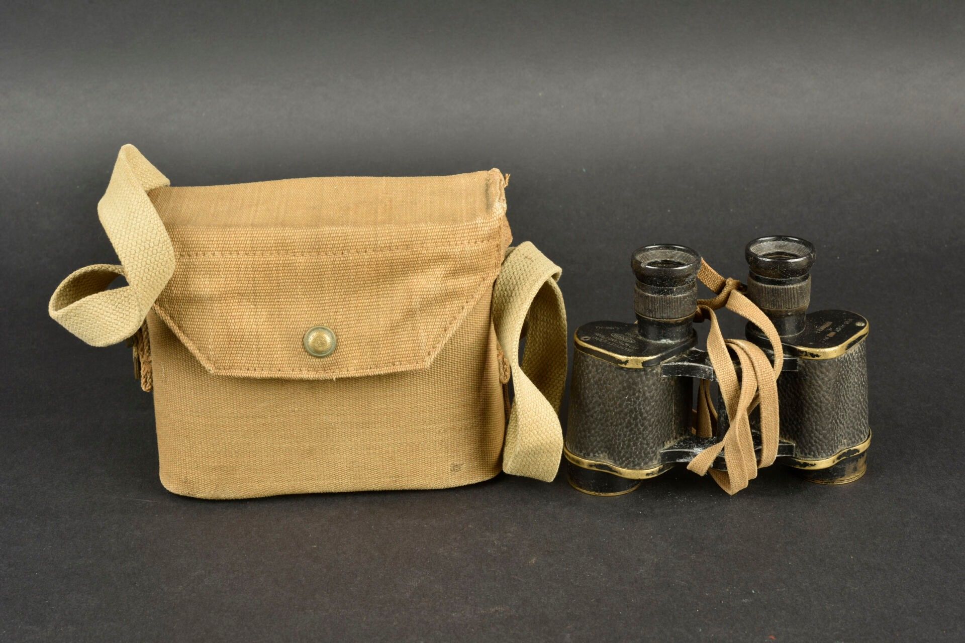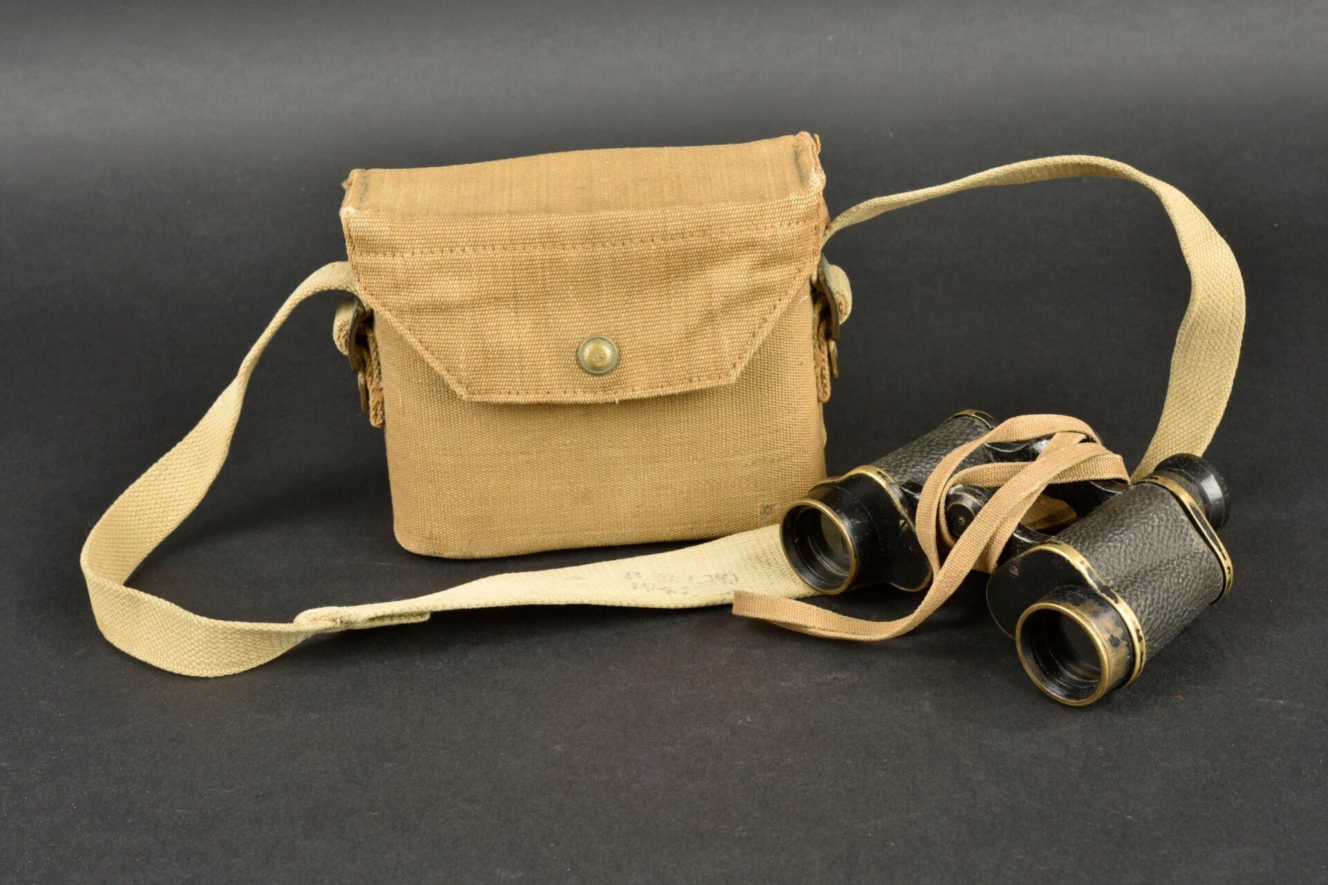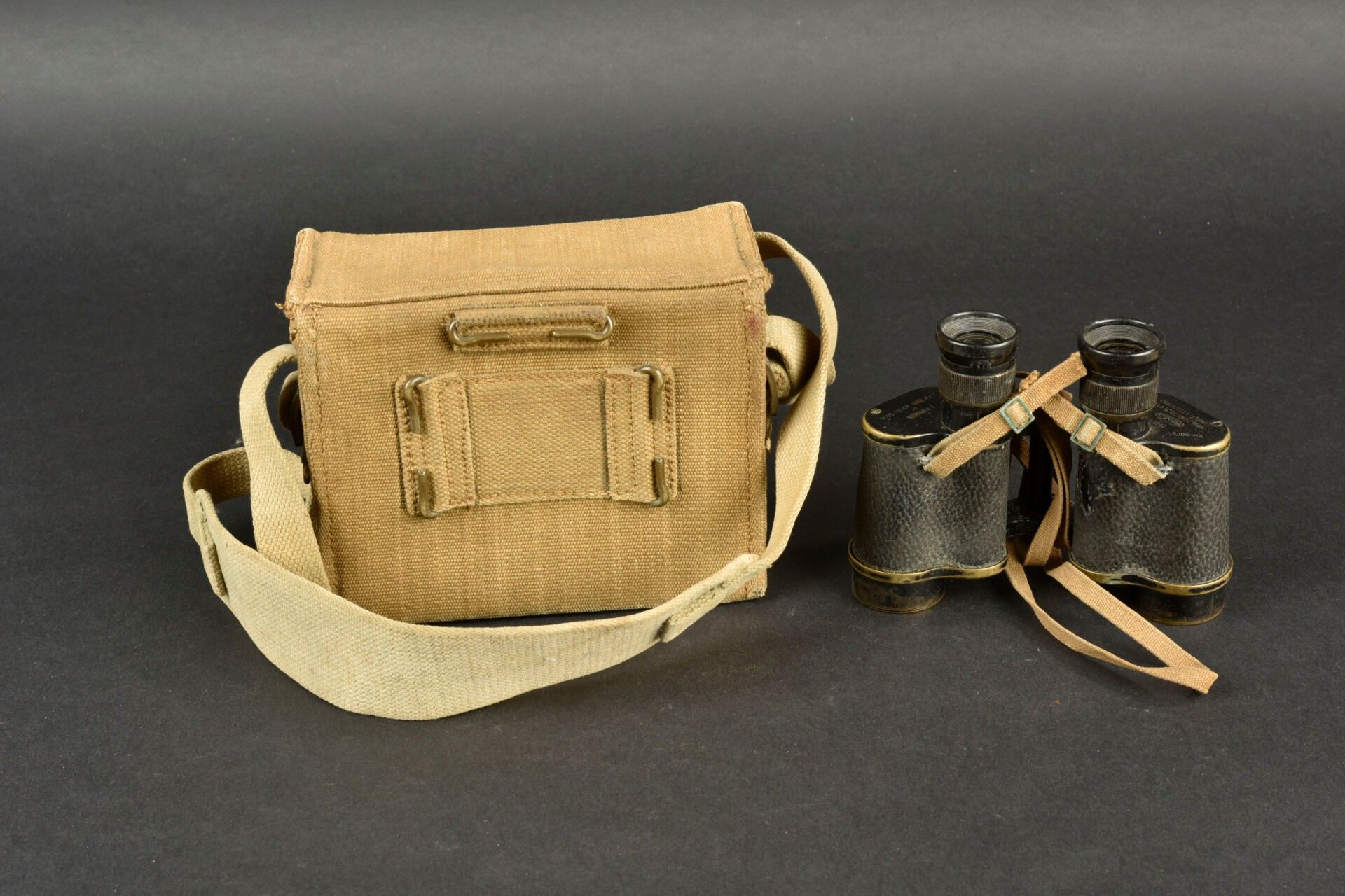 British binoculars. Thick web cover. Complete snap fastener. The carrying strap is present, but in a different colour. Dated 1944. Pair of Bino Prism N°2 MKII X6 binoculars Number 114687, Kershaw 1943 graticules. The carrying strap is present. Clear graduated optics with a few stains. Some wear, patina and stains. Condition II+. 2+