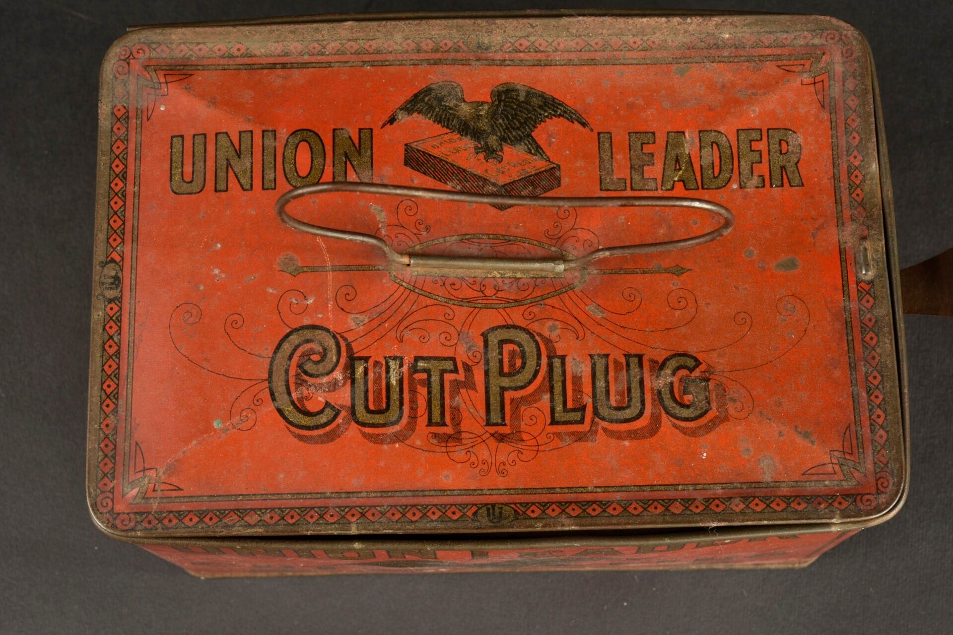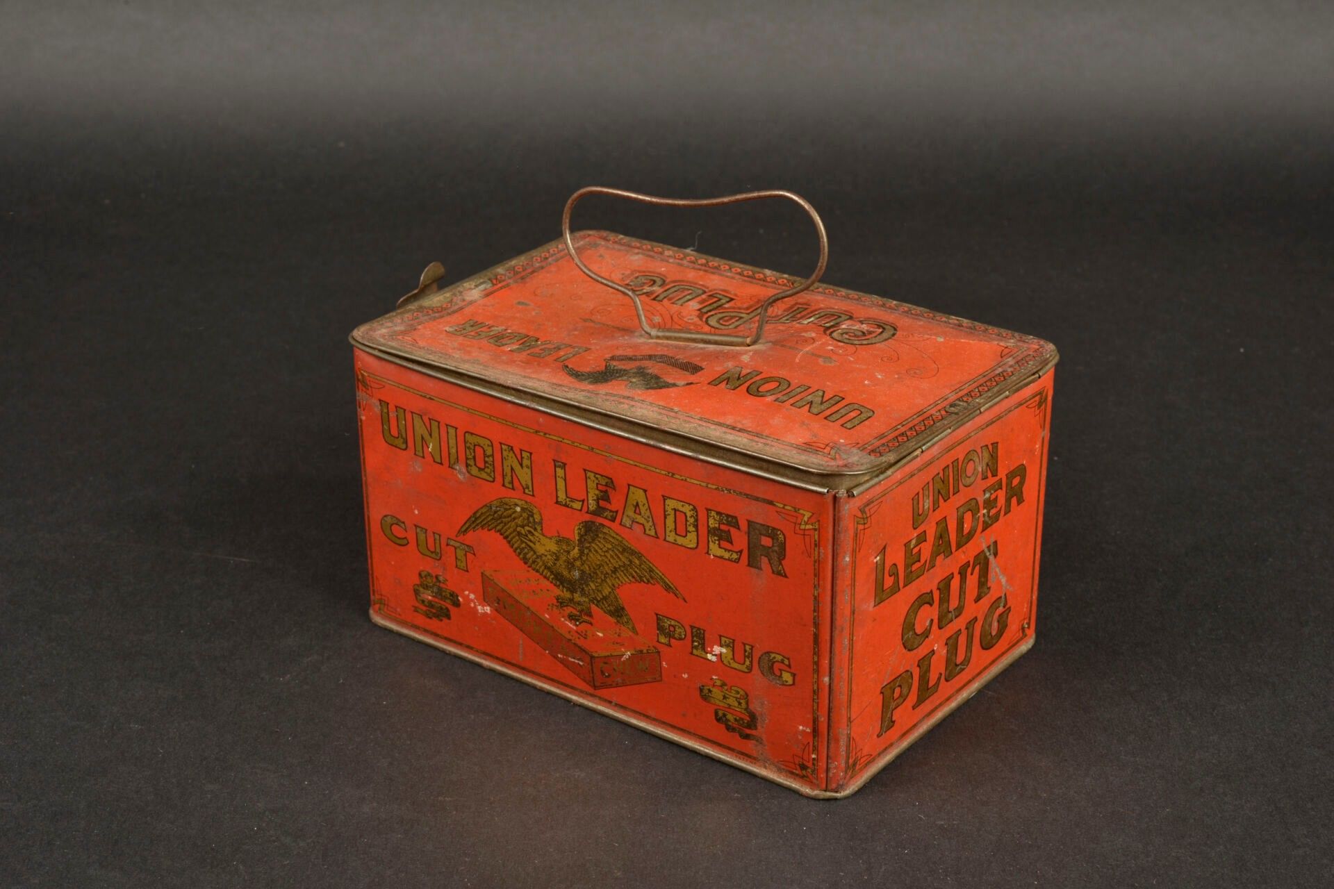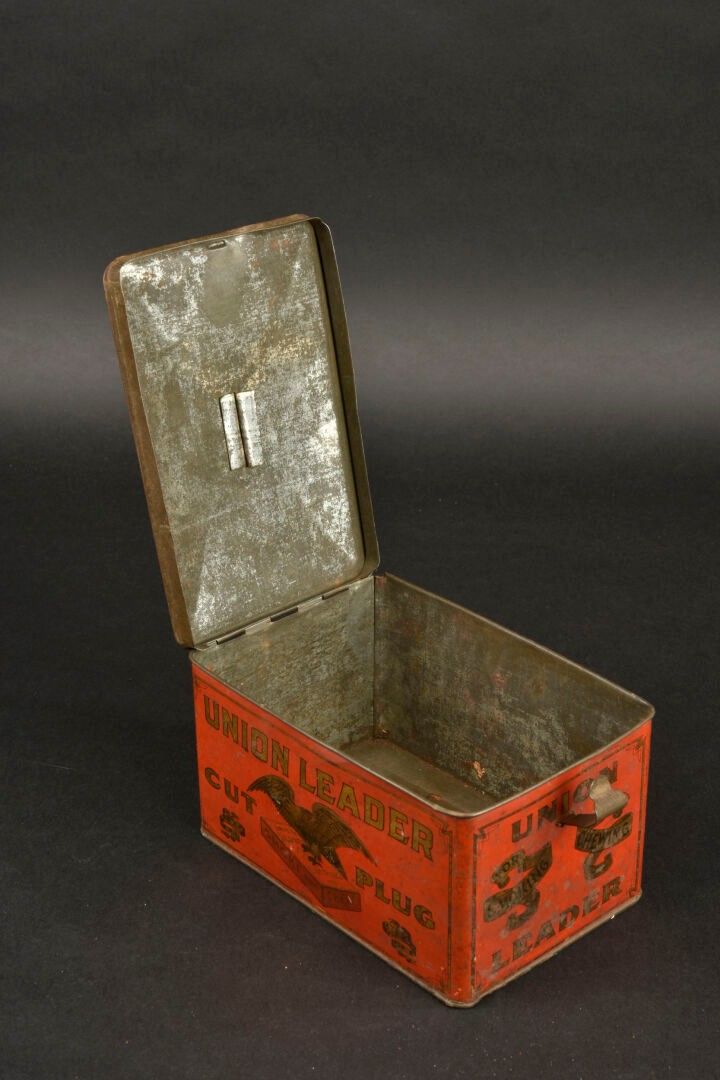 Union Leader box. Metal, empty. The carrying handle is present, as are the closing hooks. The decorations are in very good condition. Some wear and patina. Condition II+. 2+