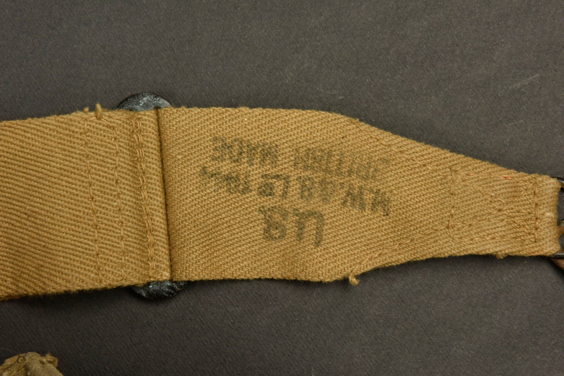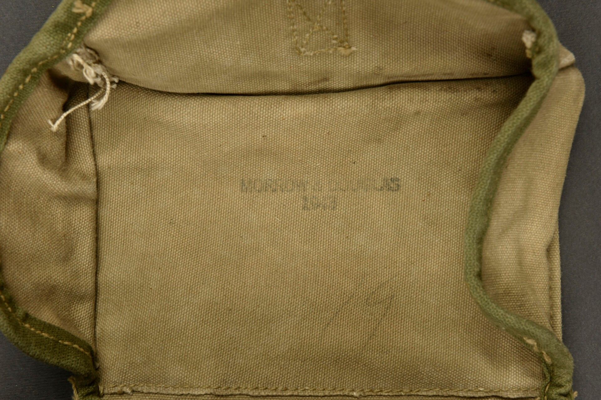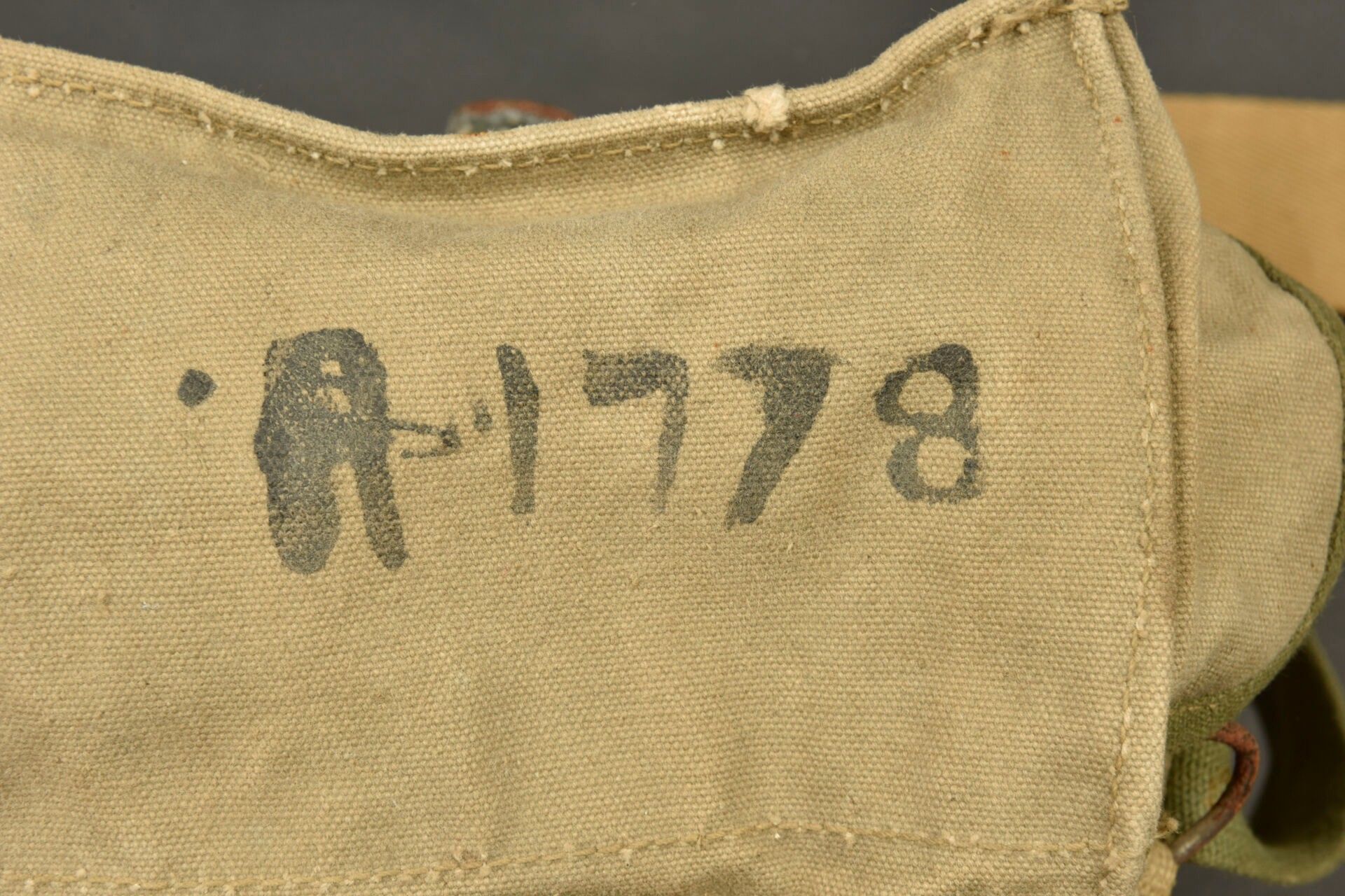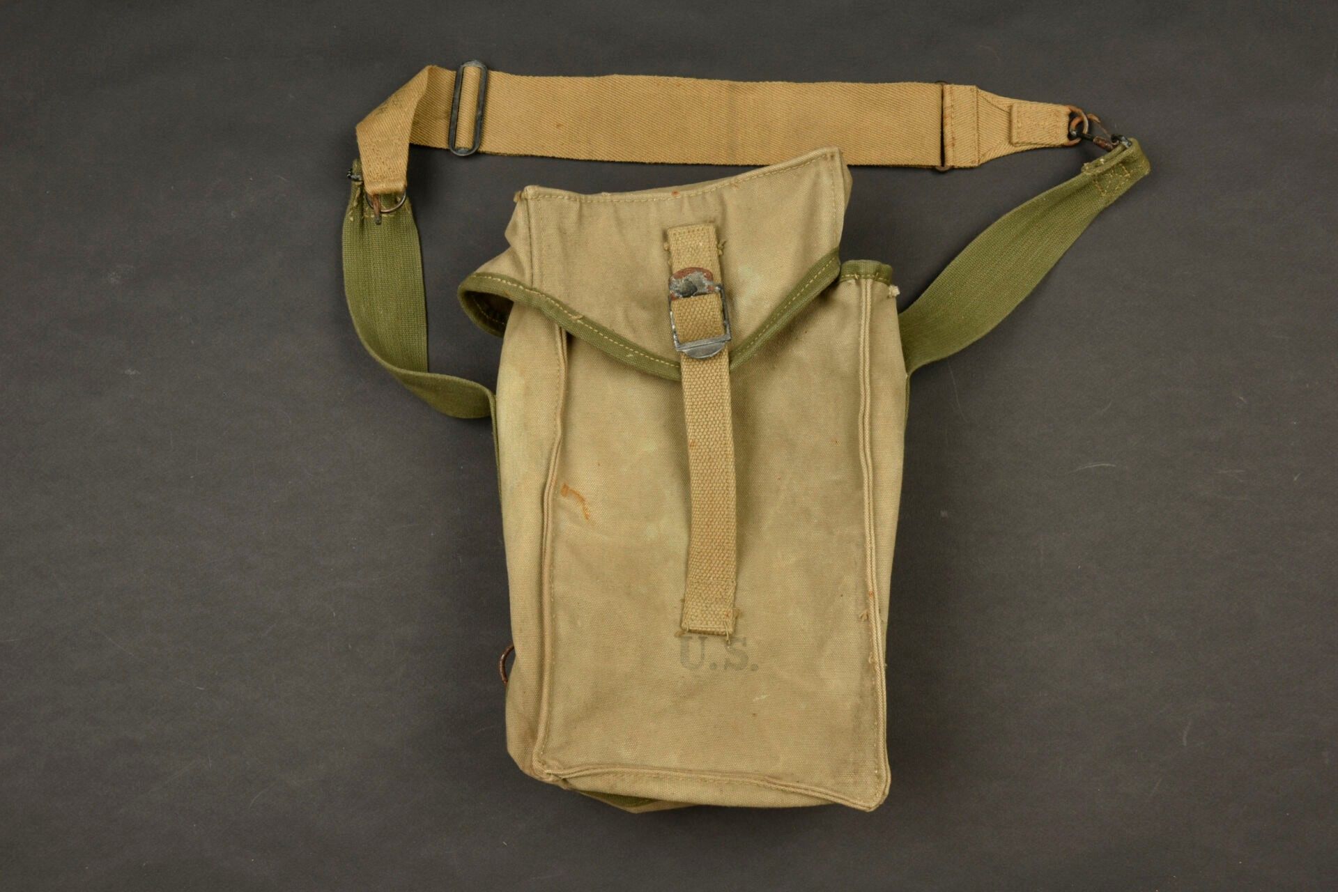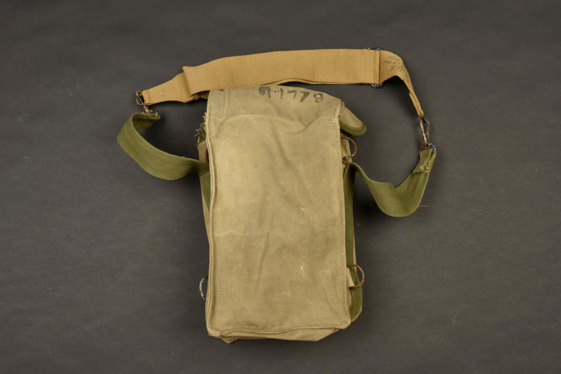General Purpose US musette bag. Heavy OD canvas. Remains of US markings visible. Illegible manufacturer markings dated 1943. Carrying strap present, US MW & Ltd 1944 British Made. The metal parts are heavily oxidised. Heavily worn with stains. Condition II+. 2+