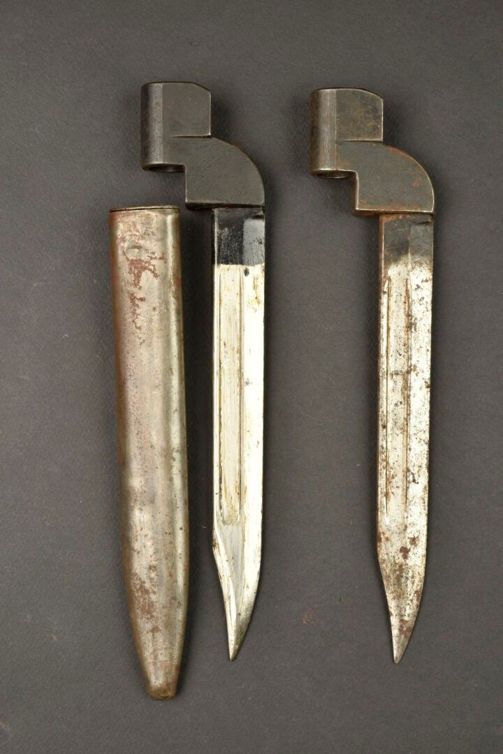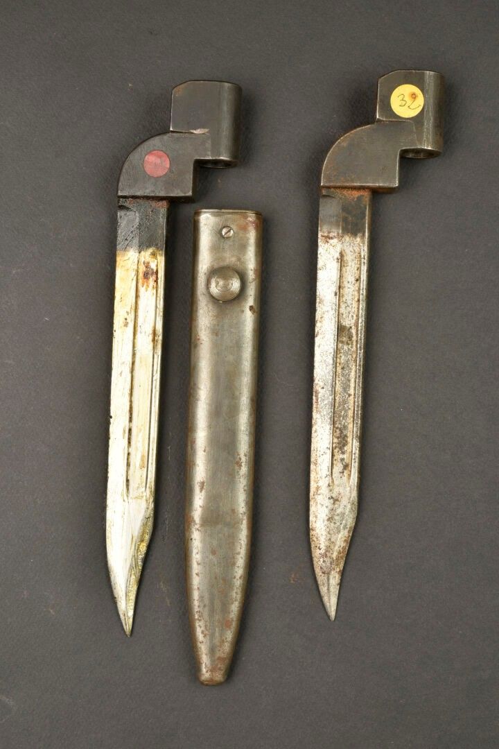 Lot of 2 English bayonets number 9. 2 bayonets N°9 MkI, one with scabbard, dated 1949, the other without scabbard, date not legible. Wear and tear, patina II.