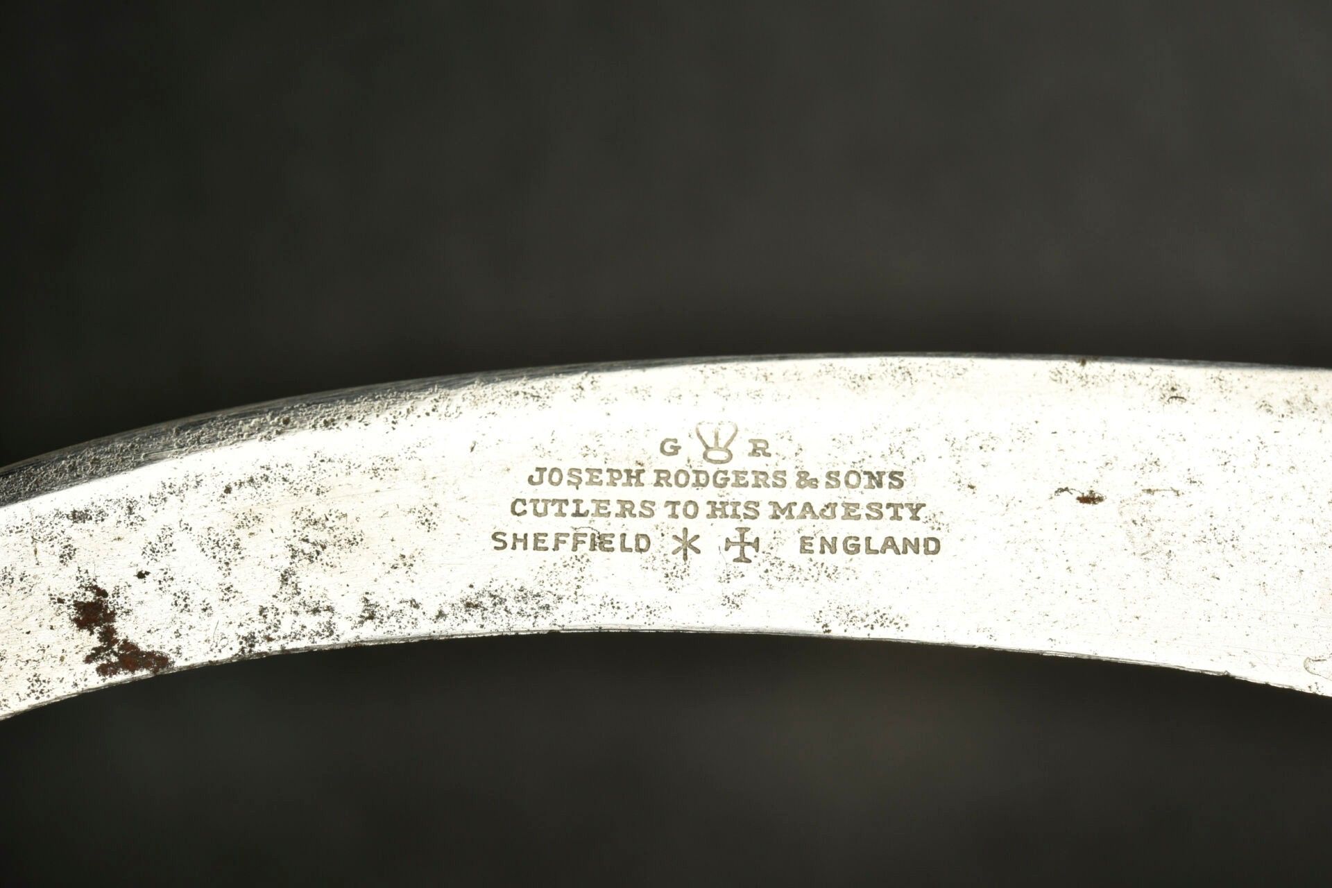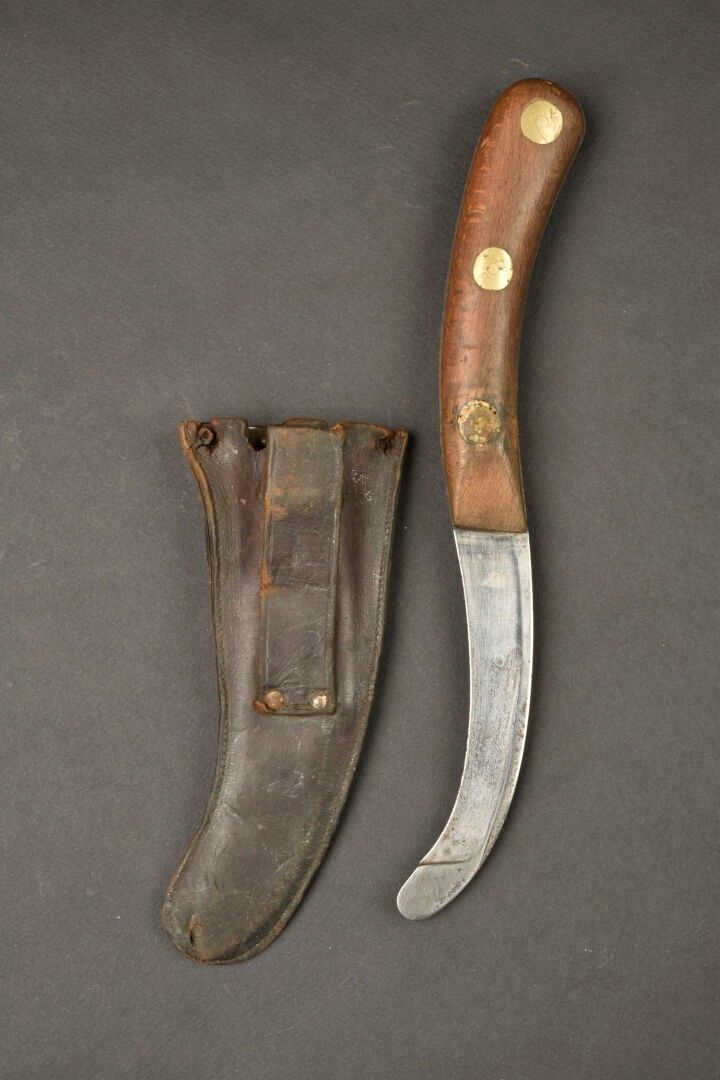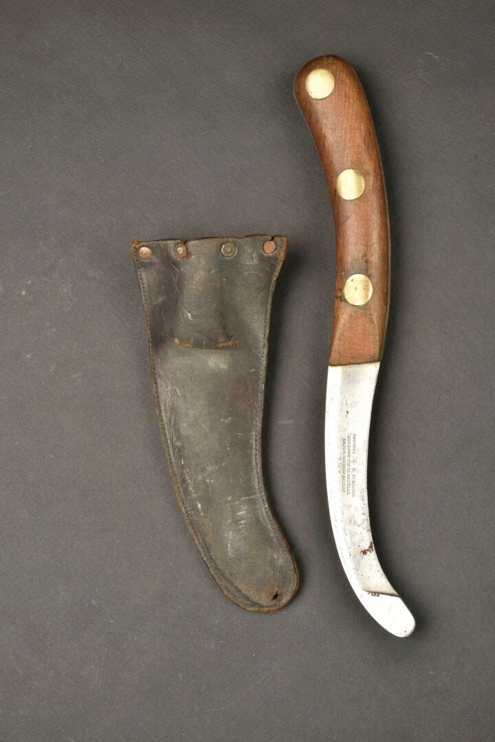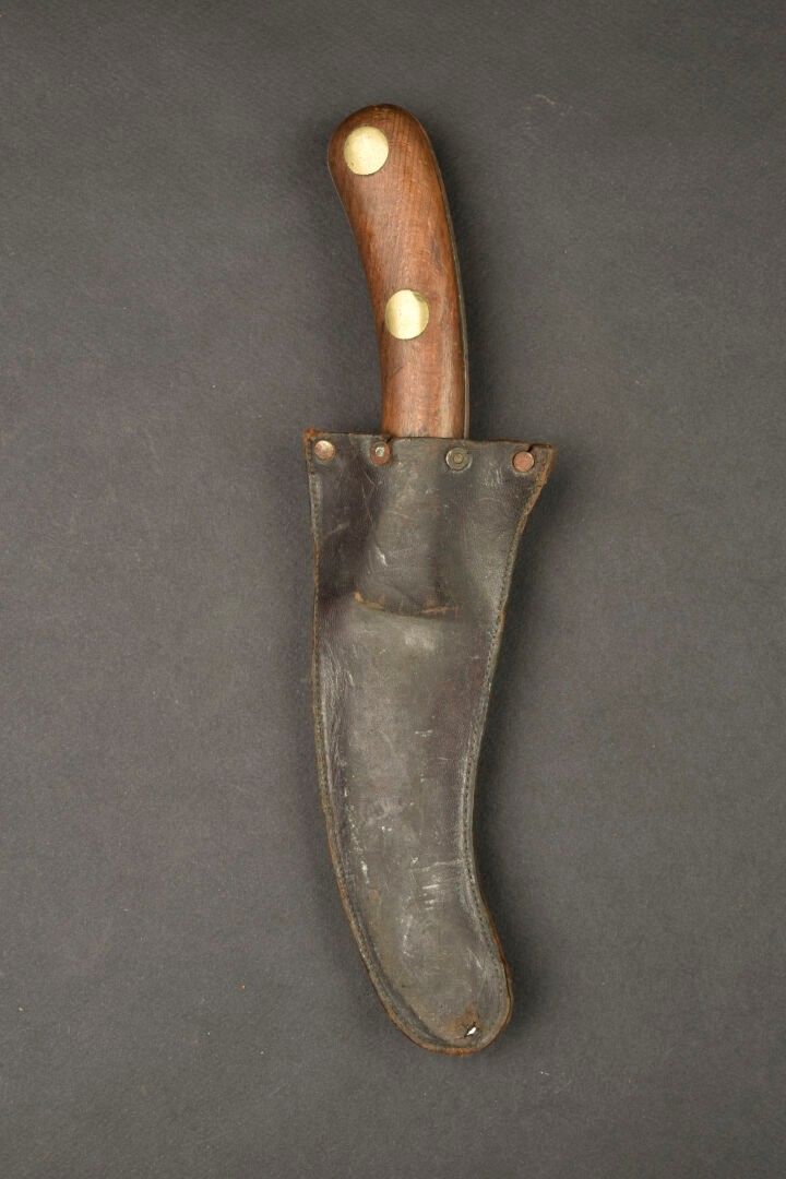 British knife. Metal fittings, curved blade in very good condition. Wooden plates held in place by three rivets. Joseph Rodgers Sons Sheffield markings. Black leather scabbard, very damaged. Some wear and patina to parts. Condition II+. For adults only.
