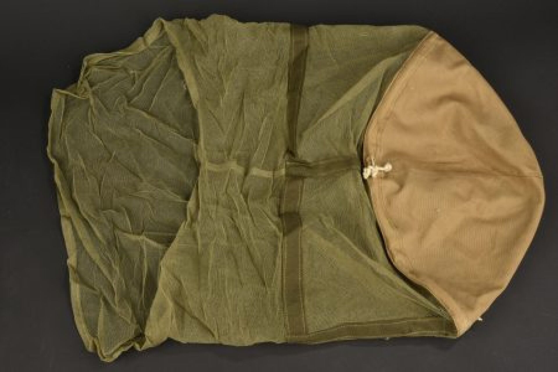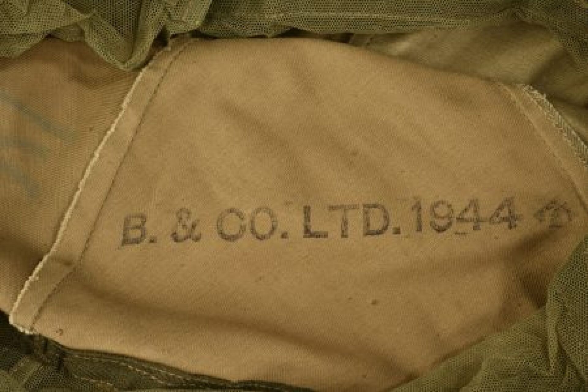 British helmet mosquito net. Upper part in thick beige fabric, two different coupons have been used to make the mosquito net. Drawstring. Part of the mosquito net in thin khaki honeycomb fabric. B& Co Ltd 1944 markings with broad arrow. Some wear, patina and stains. Condition II+. 2+