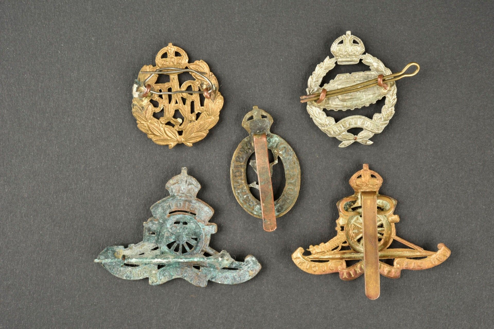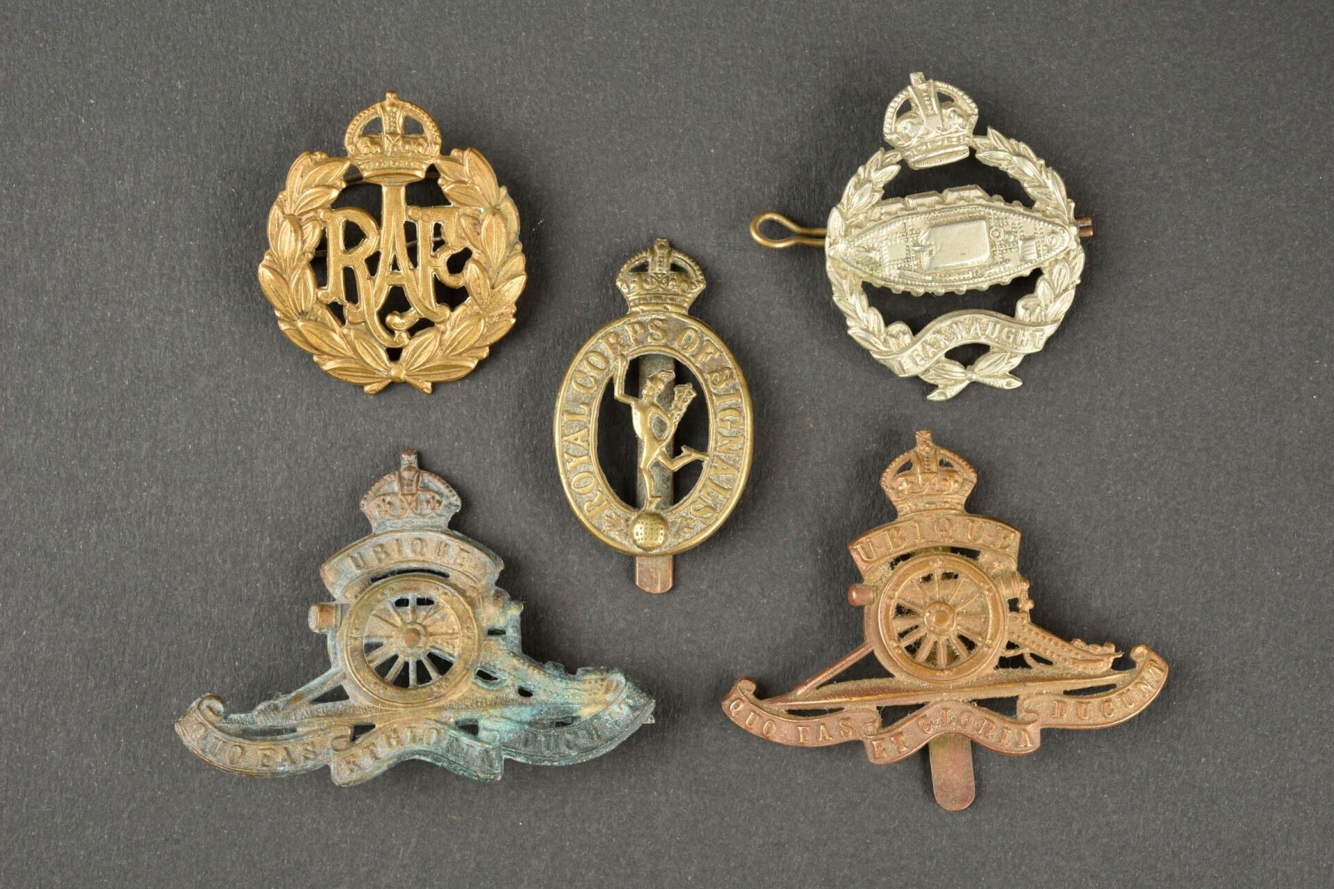British cap badges. Comprising a metal RAF cap badge. A Royal Corps of Signal cap badge. One cap badge, armoured units. Two artillery cap badges. The fasteners are present. Some wear and patina. Condition II+. 2+