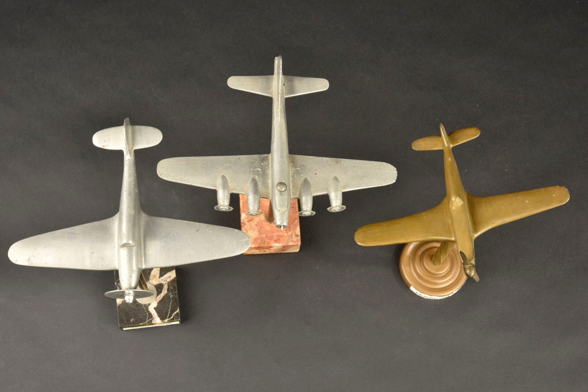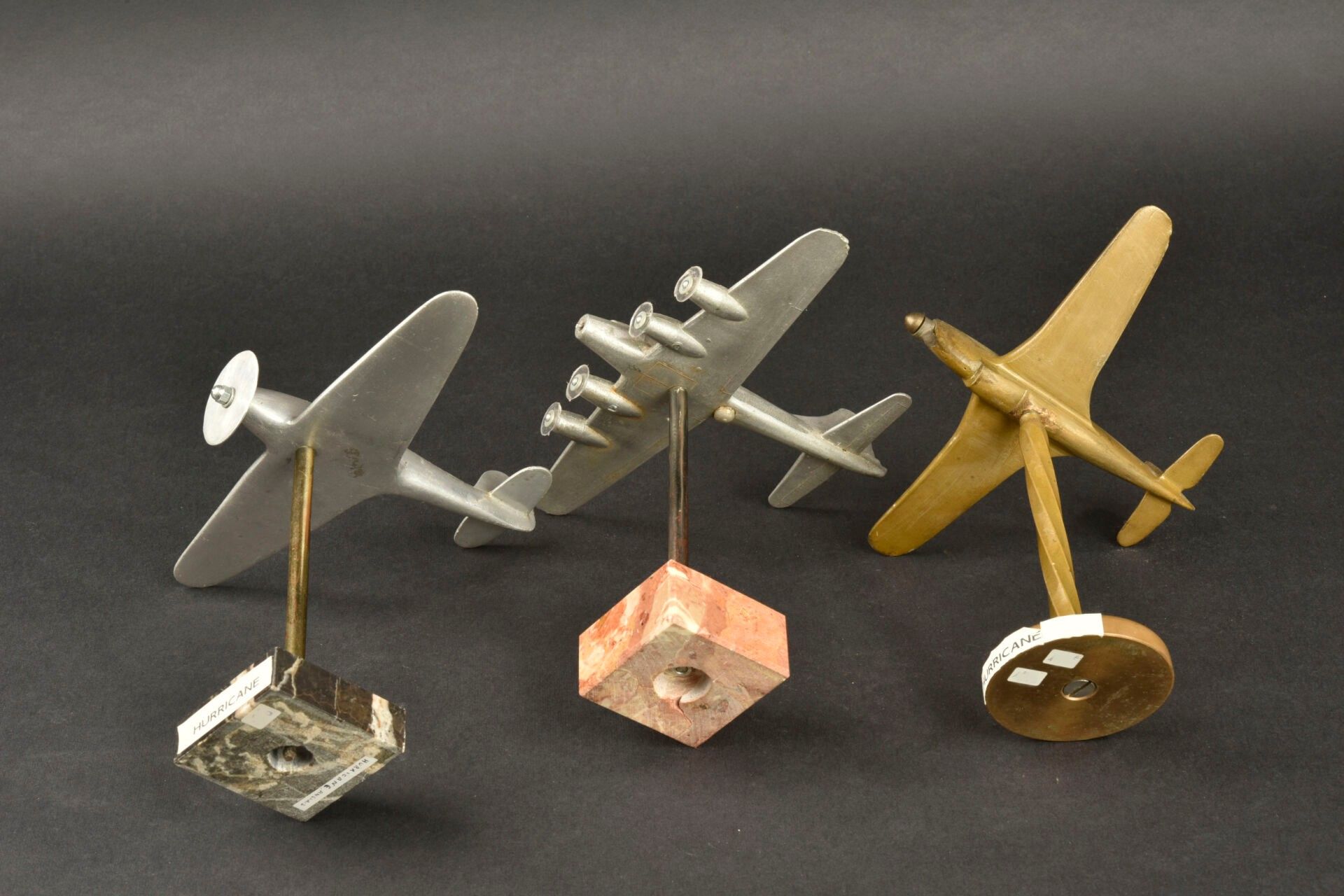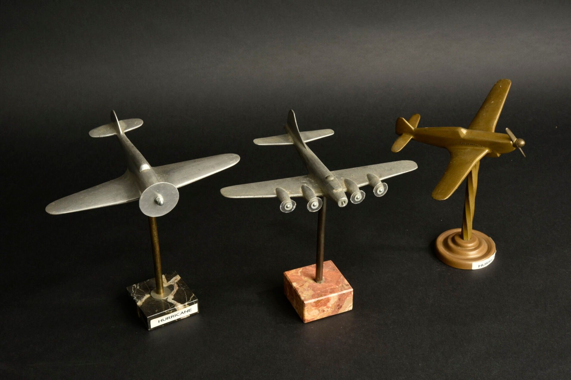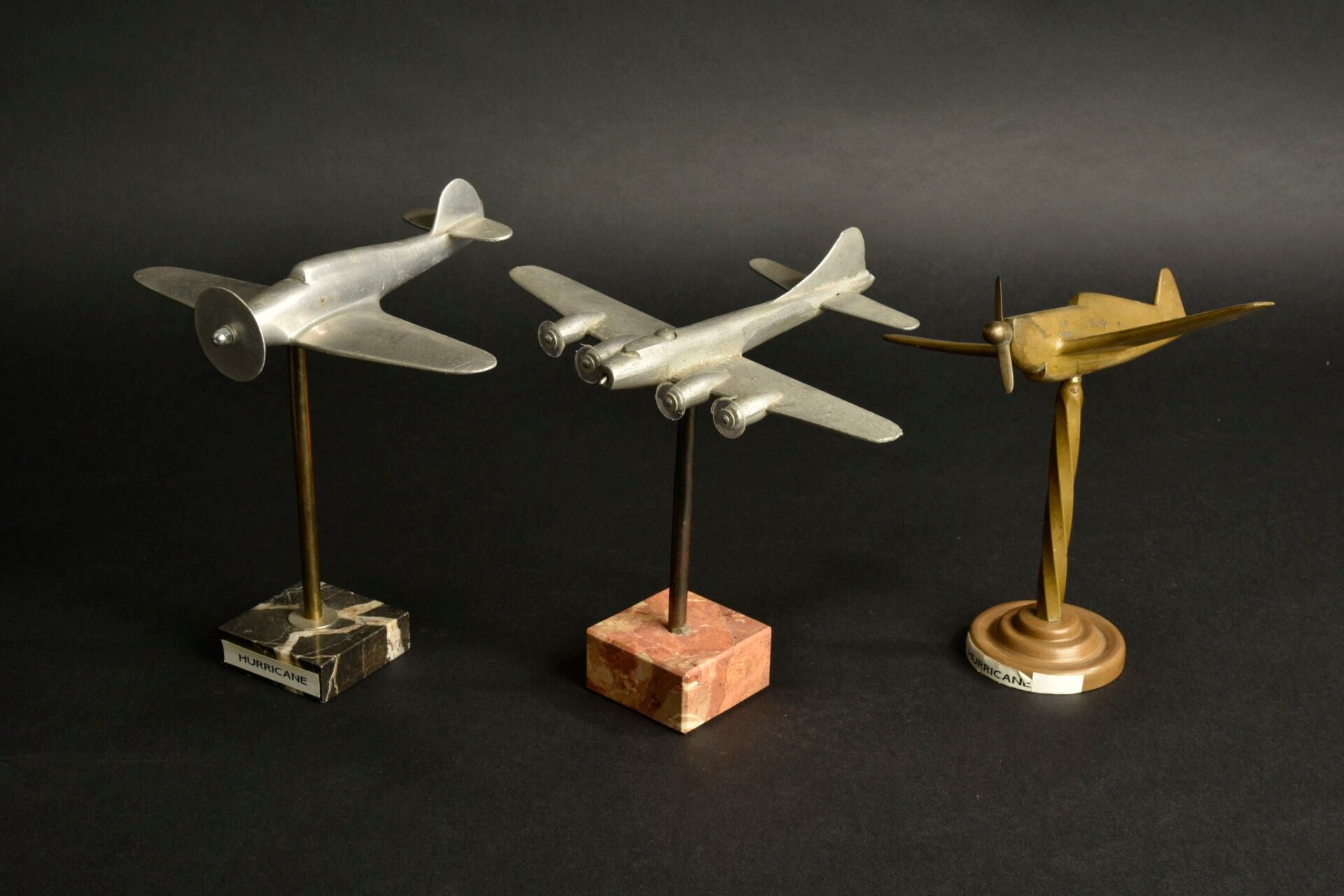Set of 2 English Hurricane aircraft models in bronze and aluminium. In bronze 16 cm long x 19.4 cm wingspan x height with bronze foot approximately 17.5 cm, and in aluminium 16.5 cm long x 20.4 cm wingspan x height with stone foot approximately 19.5 cm. A model of a white metal four-motor on a stand is also included. very decorative II+