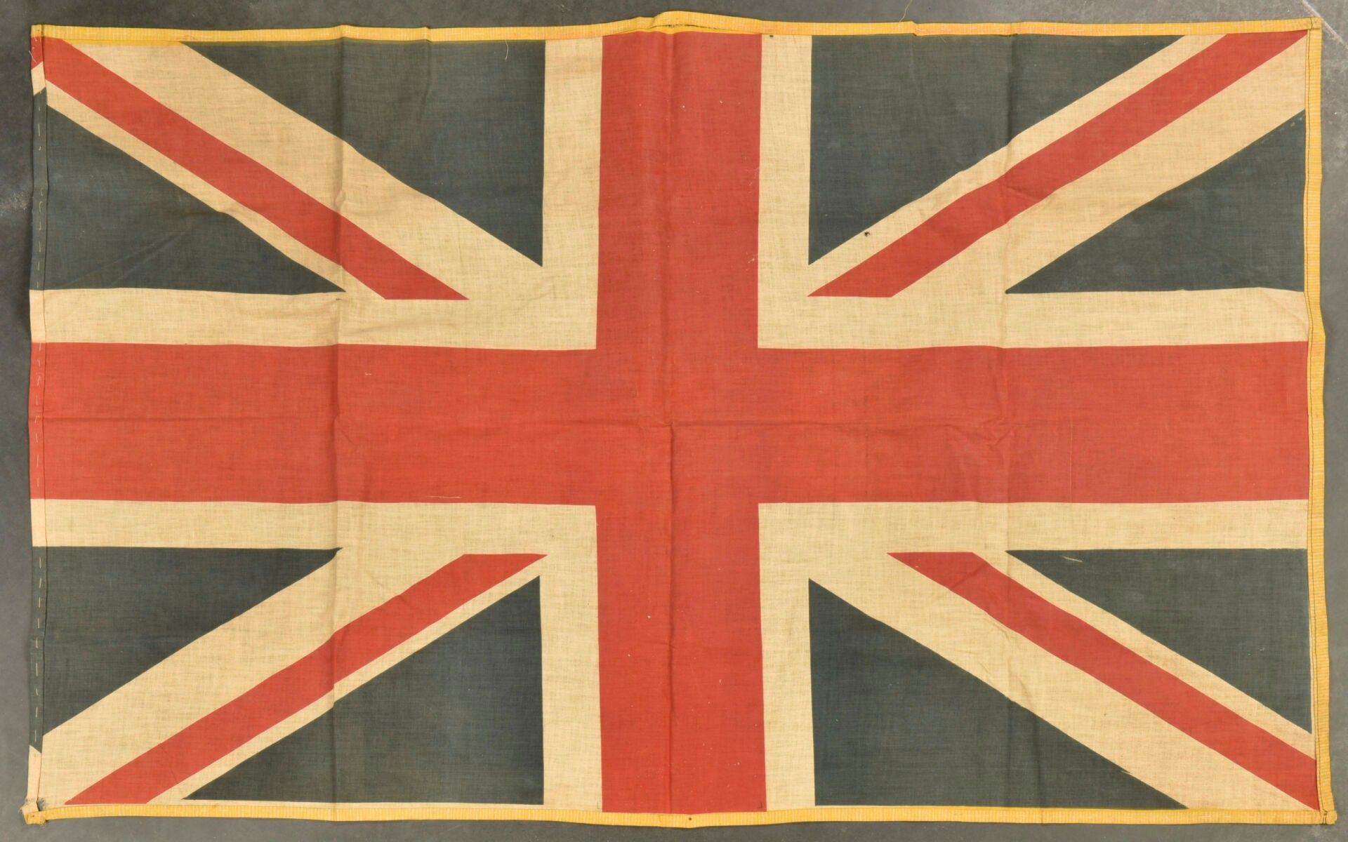 British flag. Printed Union Jack, double-sided. Relatively stiff fabric. The edges are yellow. No visible markings. Dimensions 75 x 110 cm. The colours are partially sun faded. There is some wear and patina, as well as stains and tears. Condition II+. 2+