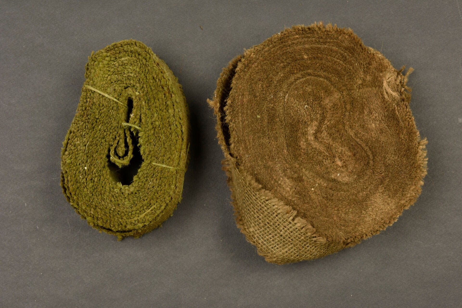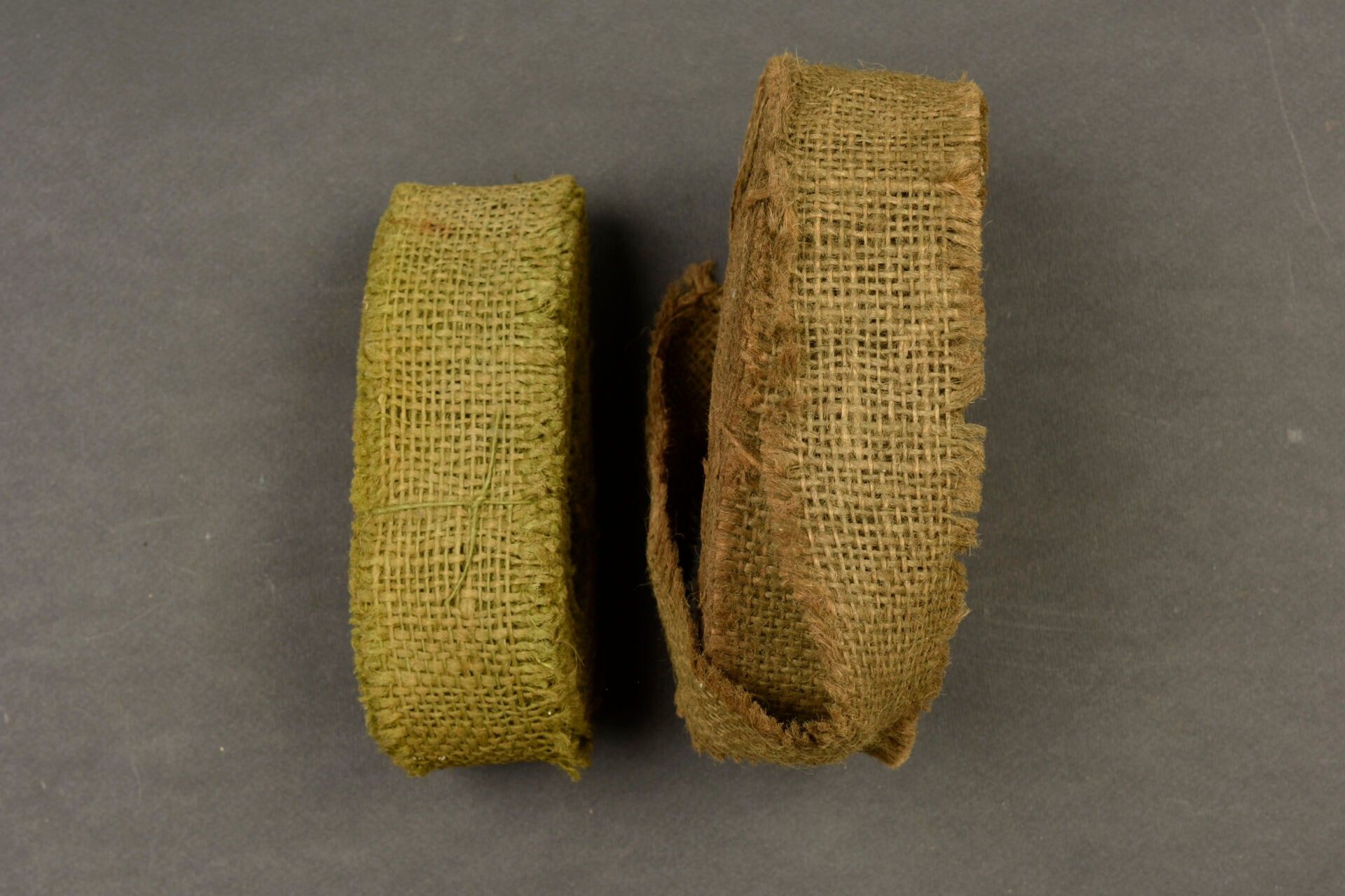 Hessian rolls. Two incomplete rolls, used to make camouflage strips for helmets. Some wear and patina to be noted. Condition II+. 2+