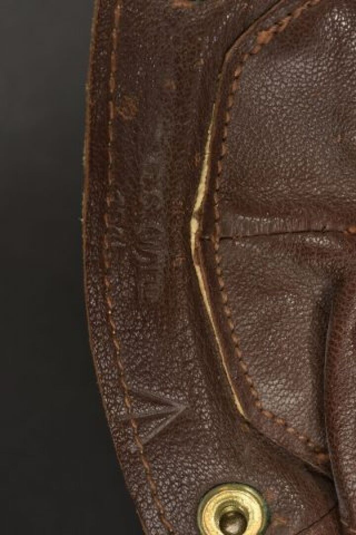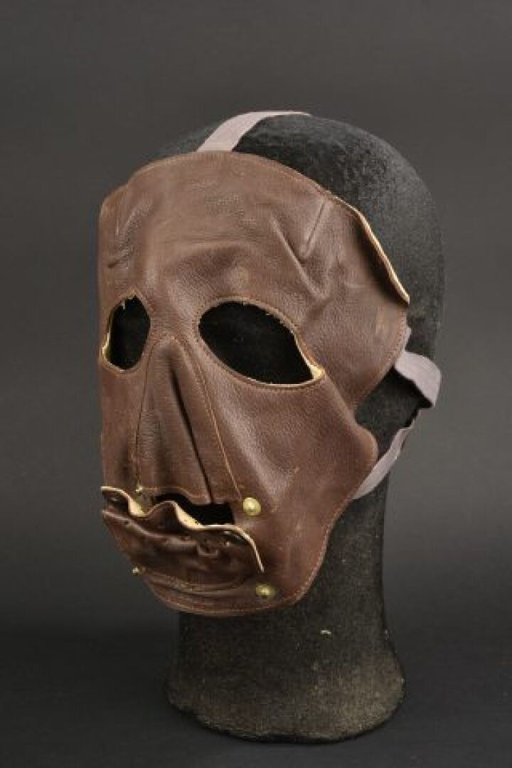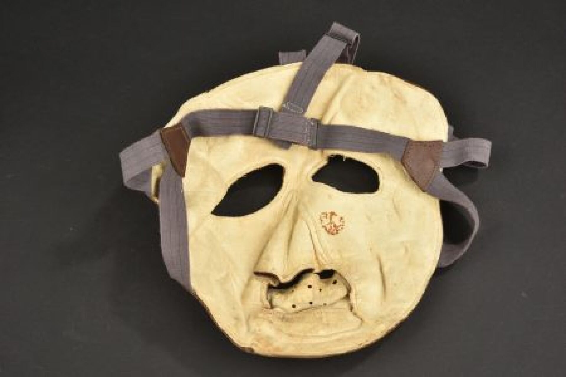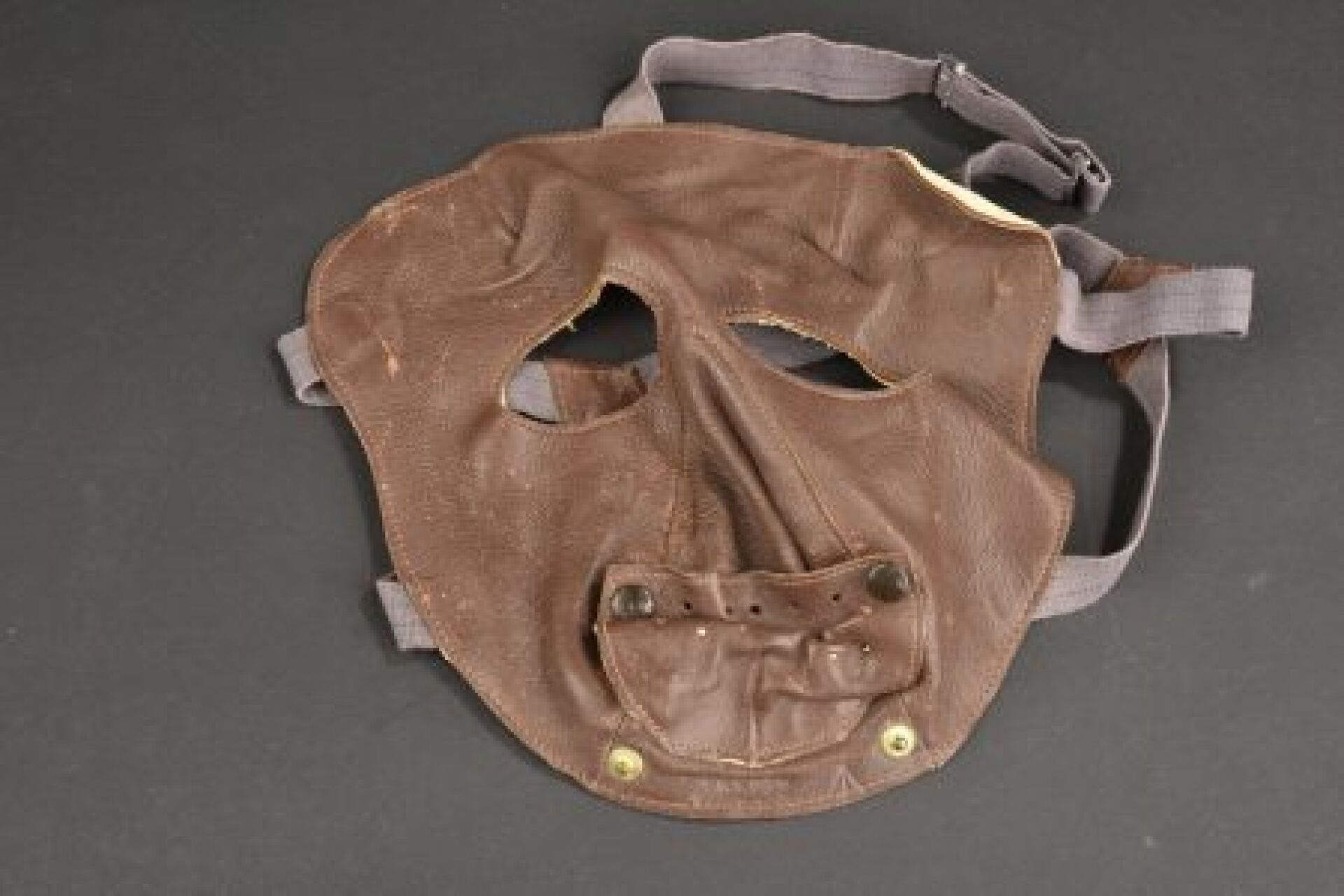British face mask. Supple brown leather, lined with chamois leather. The elastic bands are present. The press studs are functional. Remains of illegible markings. Some wear and patina. Condition II+. 2+