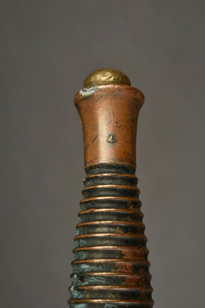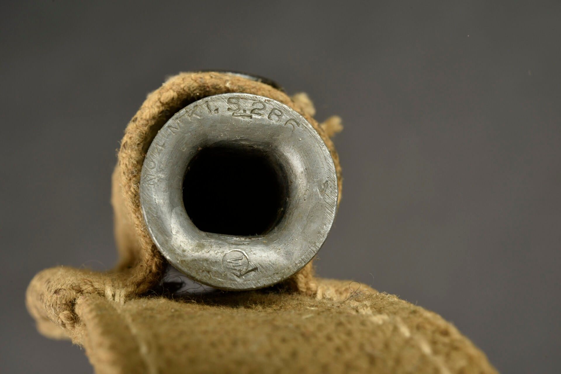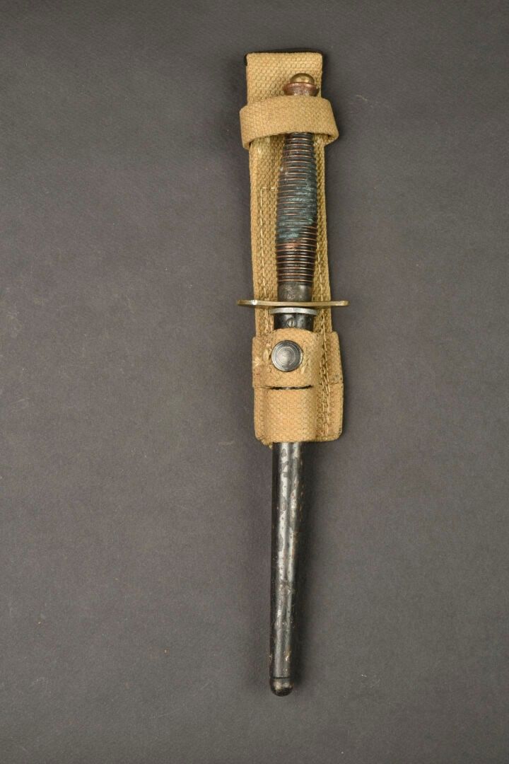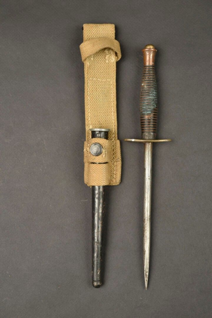 Fairbairnsykes type dagger. Ringed metal handles. Pommel with mould number 4. Unmarked hilt. Nail bayonet blade, obviously a period modification. Nail bayonet scabbard, 70% black paint. Heavy web gusset, unmarked. Some wear and patina. Condition II+. For adults only.