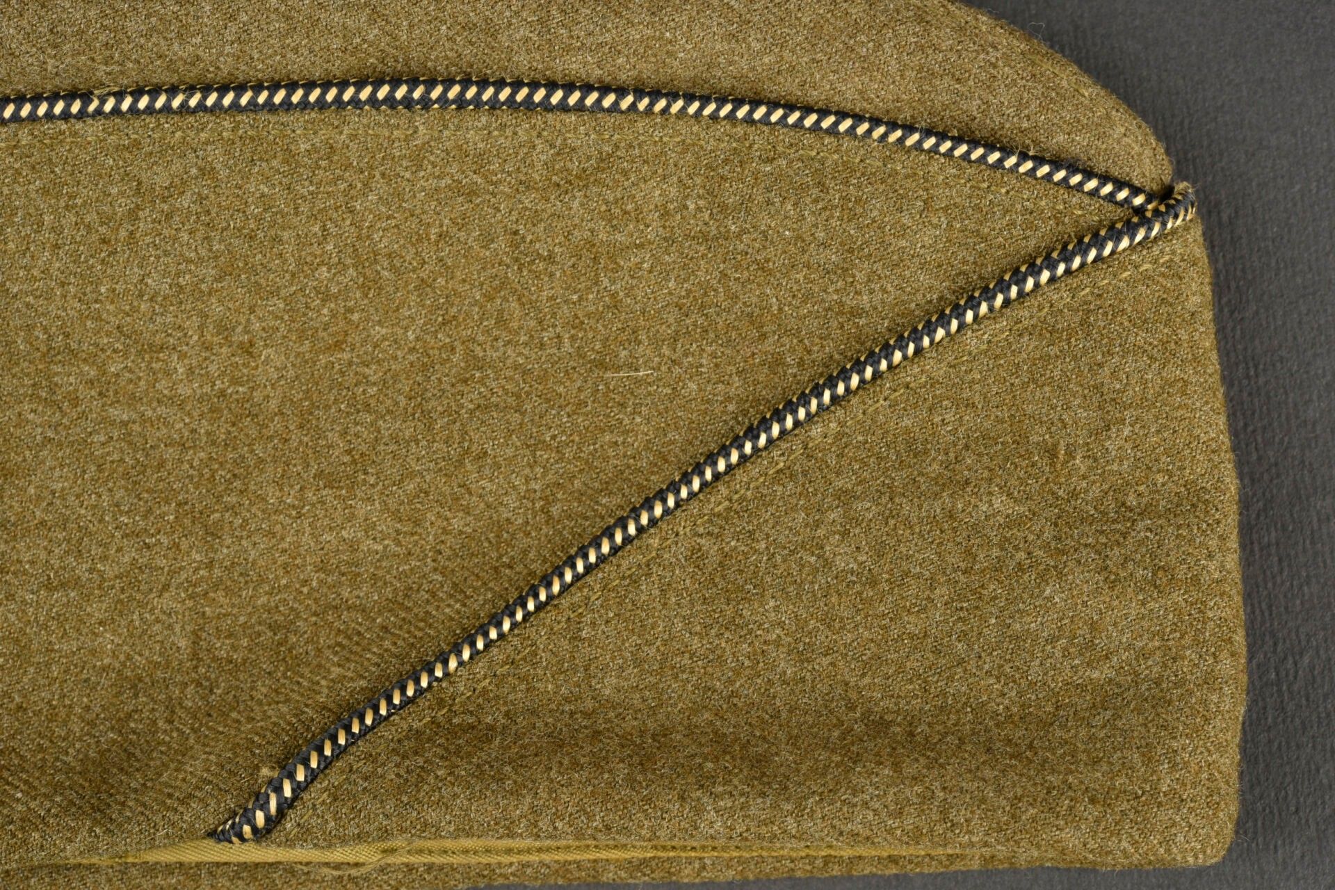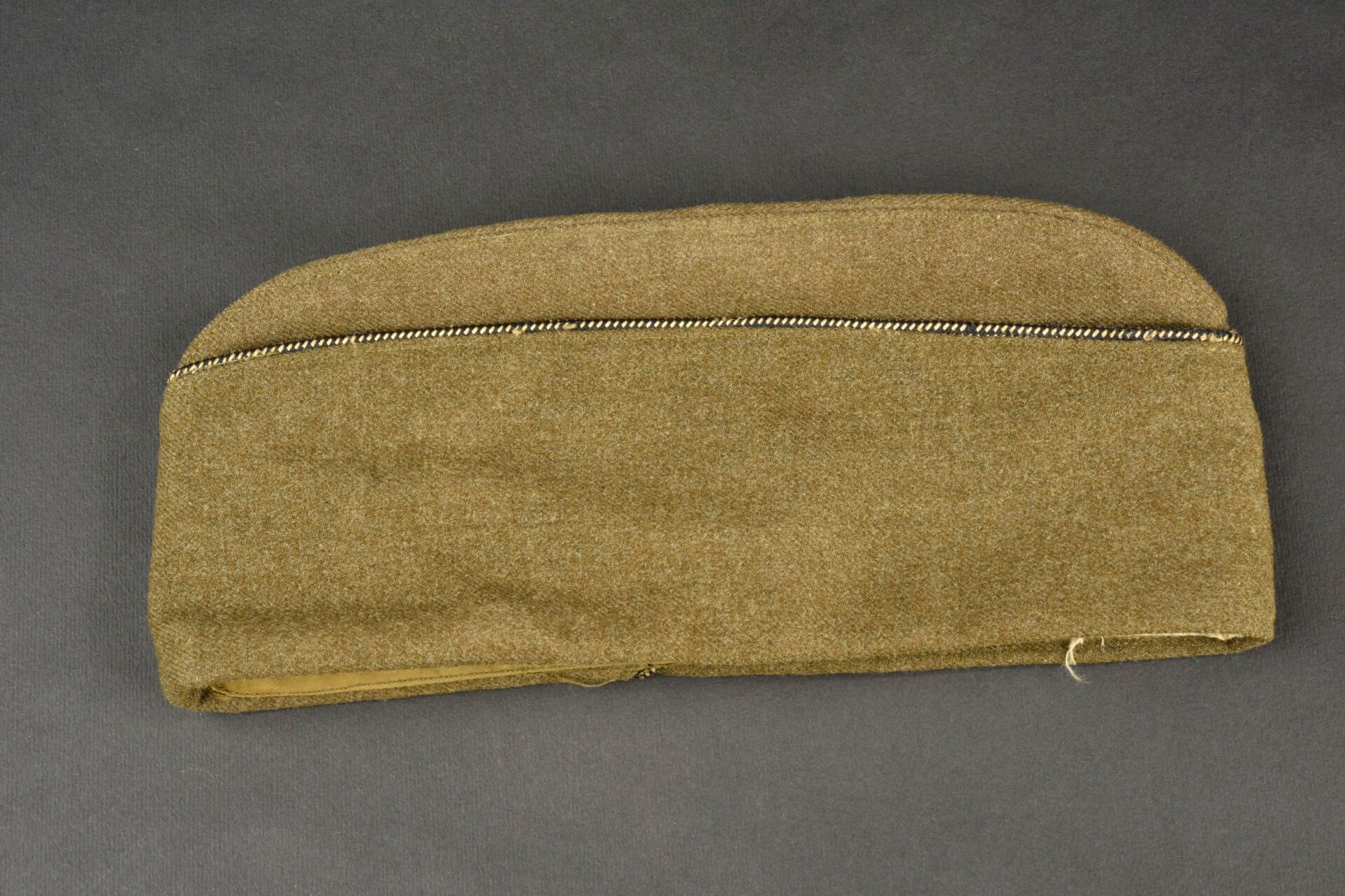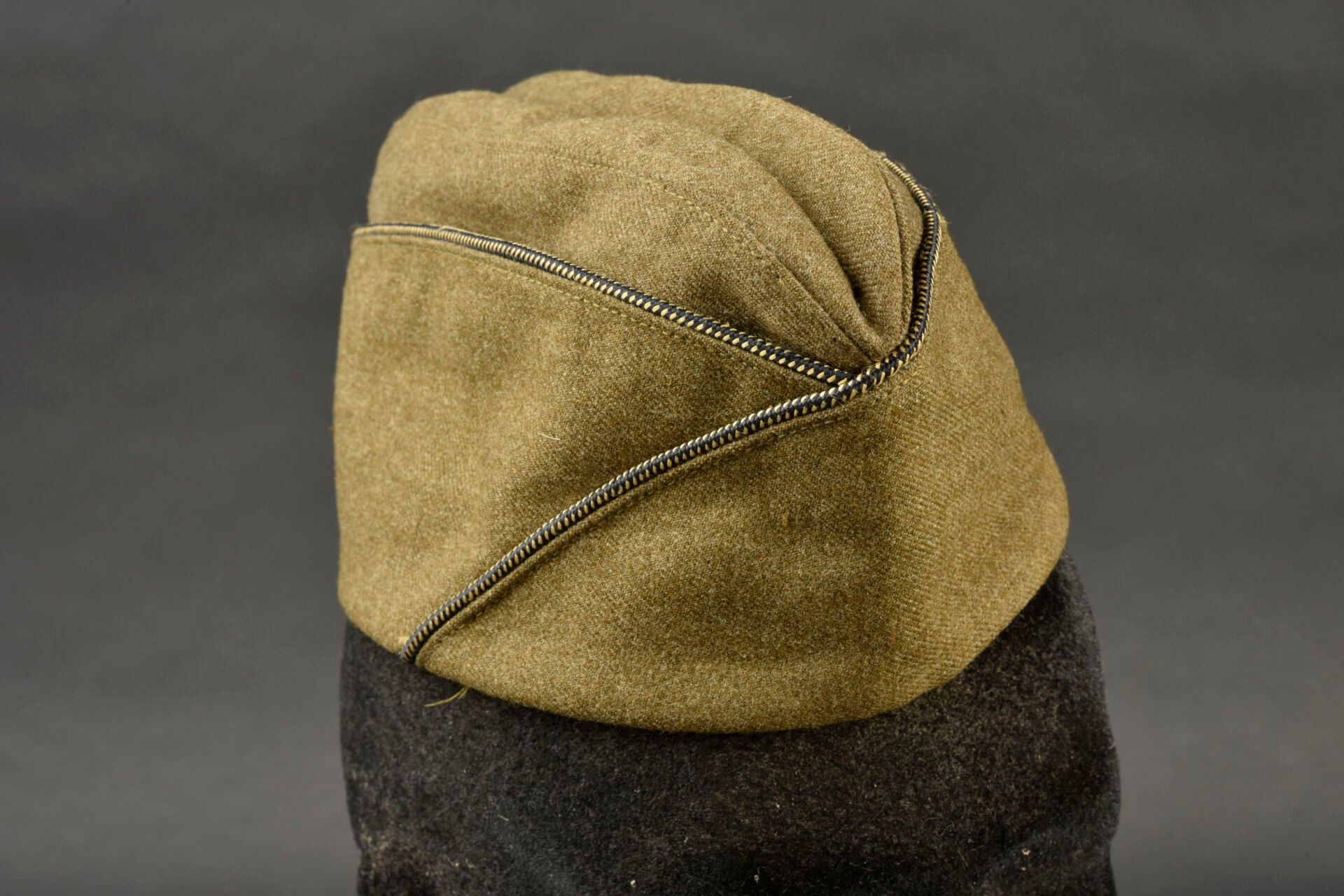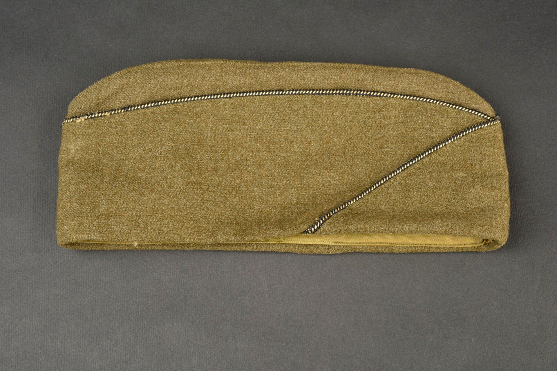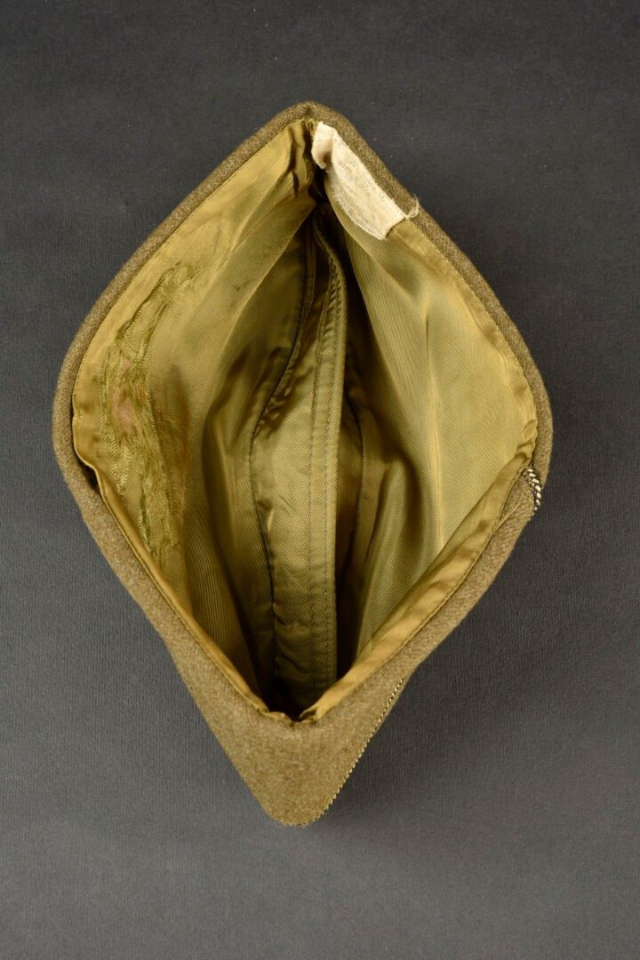 US officer's cap. In khaki cloth. Black and gold piping typical of the US officer corps. Lined with khaki sateen. Tailor's label obviously torn off. Manufacturer's label partially illegible. Size 6 3/4. Some wear and patina, as well as a few tears and stains. Condition II+. 2+
