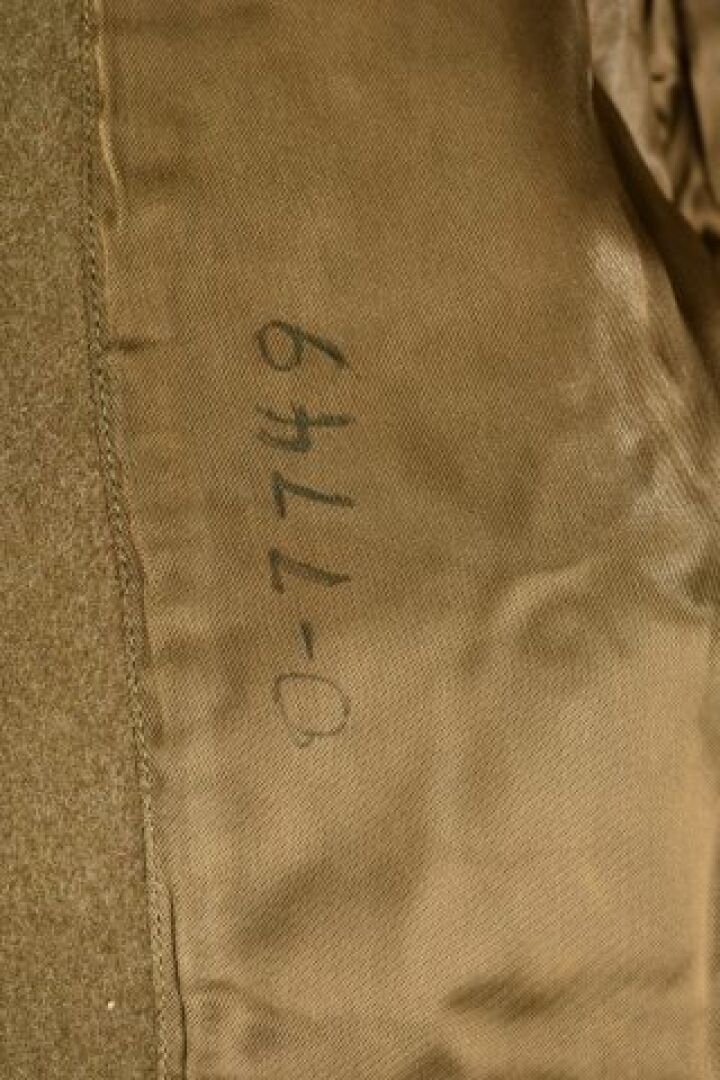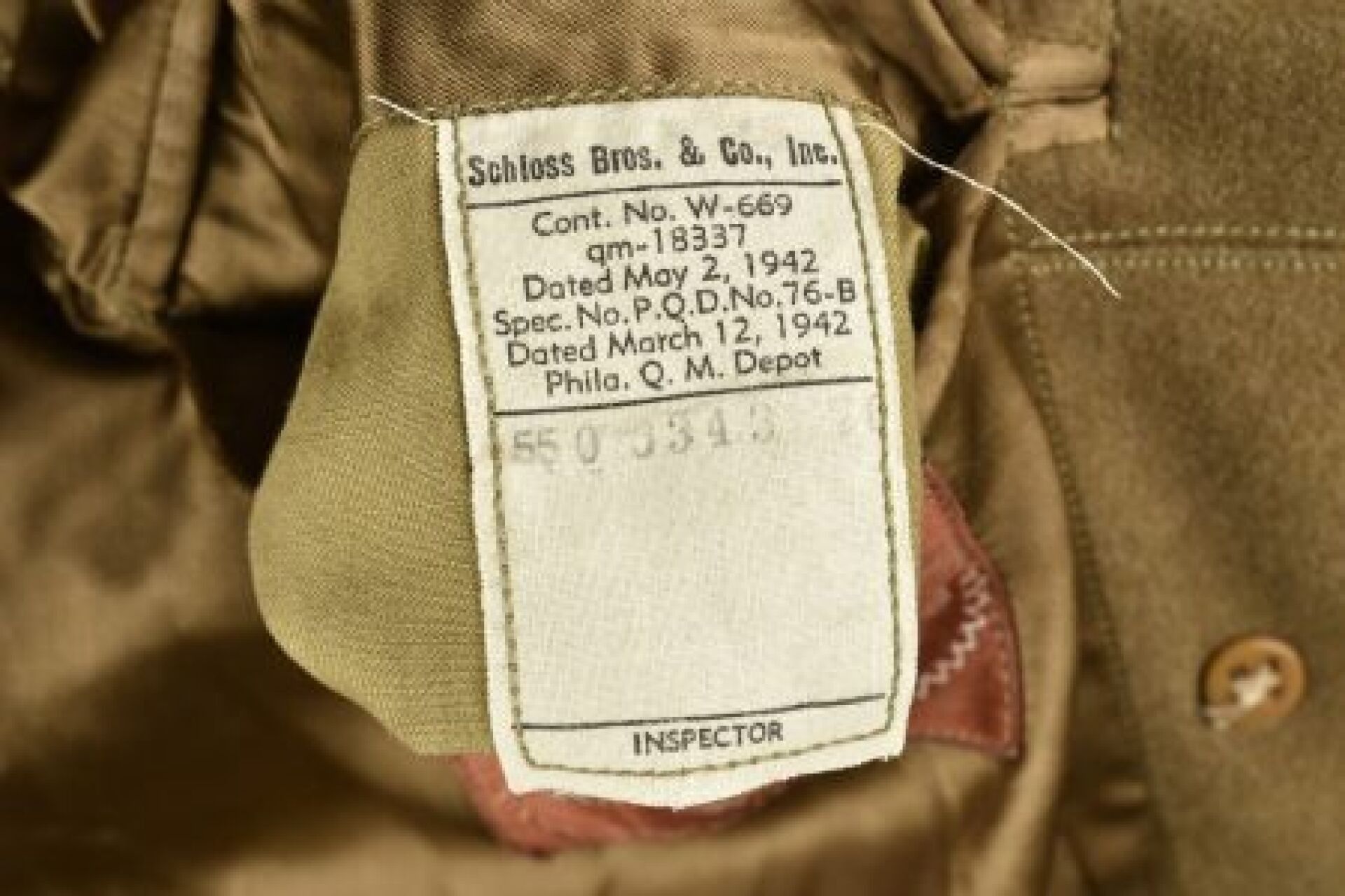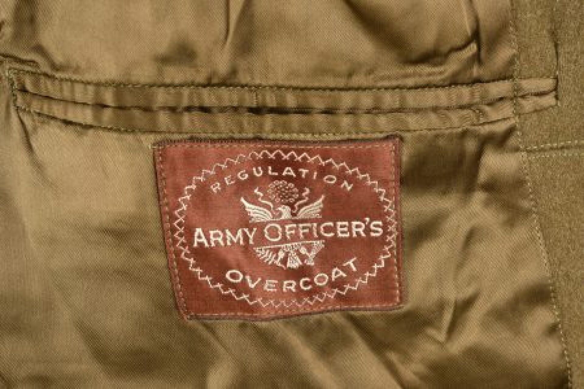 US officer 3/4 coat. In thick khaki cloth, all buttons are present. Some repairs to seams. Lined with brown silky fabric. Traces of insignia on left sleeve. Label marked Regulation Army Officer's Overcoat. Manufacturer's label Schloss Bros & Co INc, dated 2 May 1942. Some wear and patina, as well as moth marks and stains. Condition II+. 2+