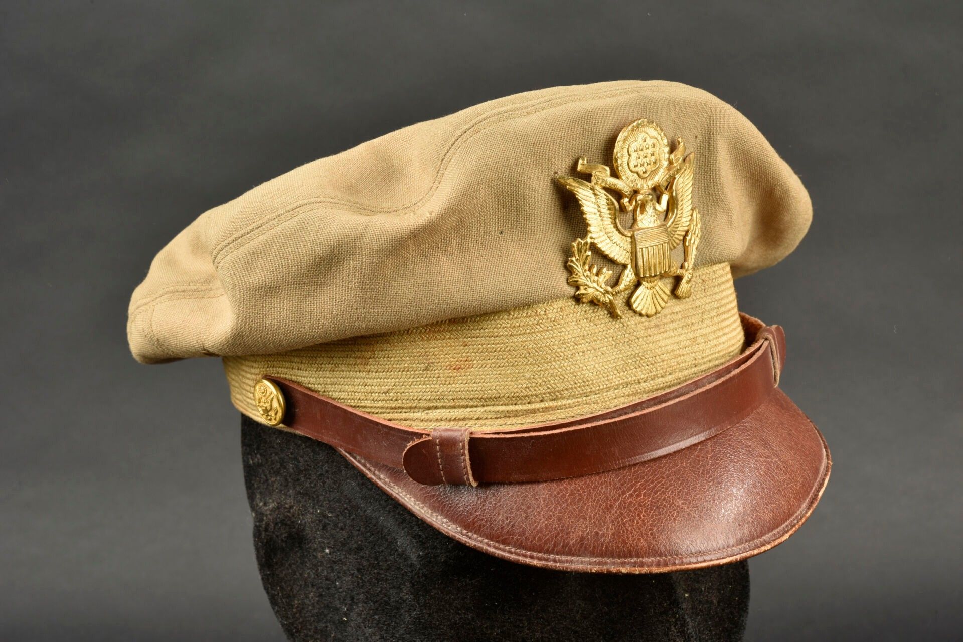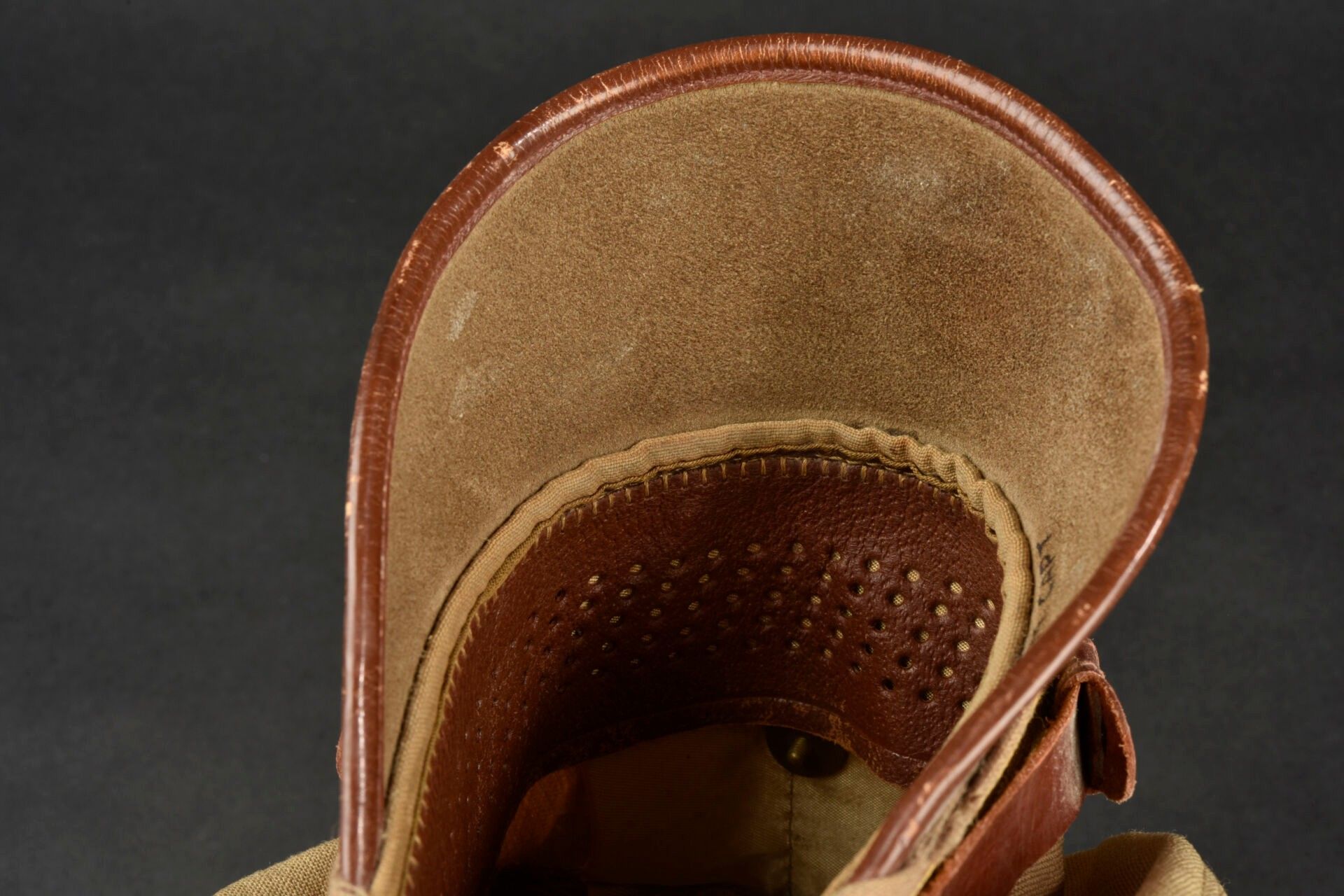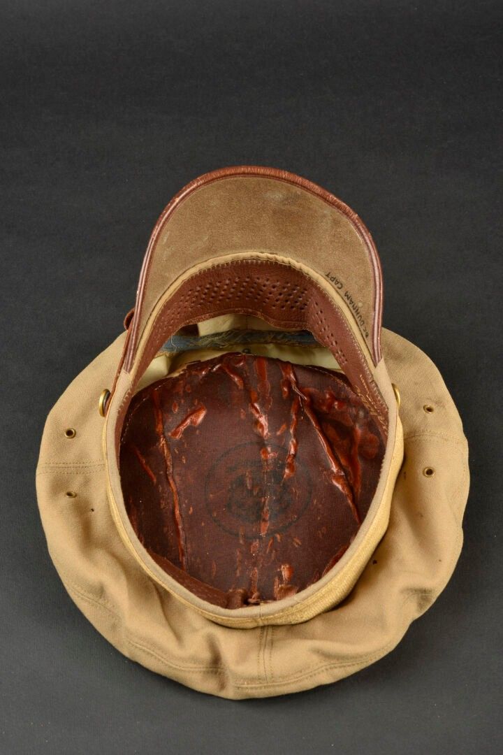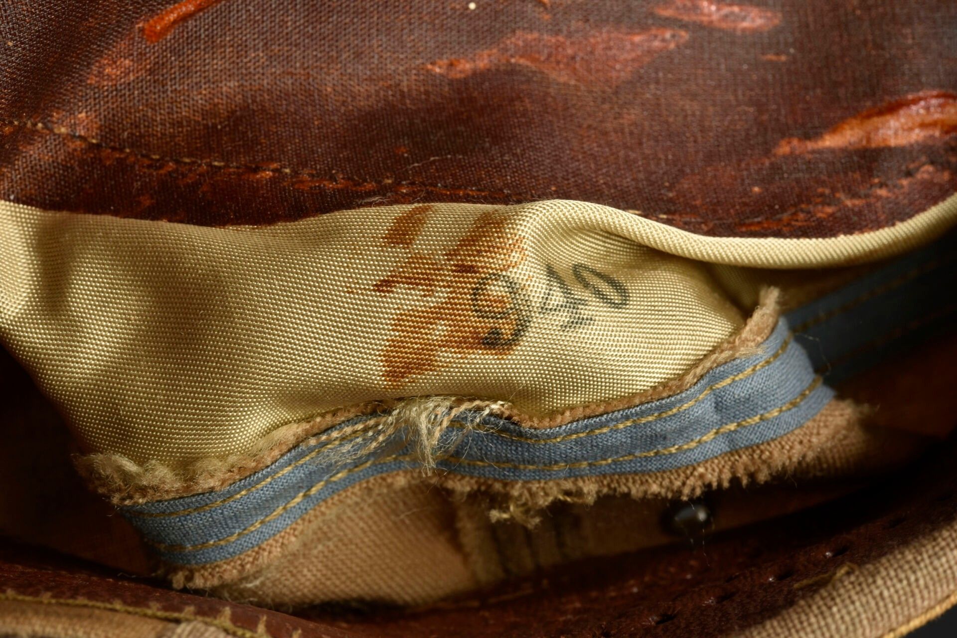US officer's cap. In chino fabric. Soft leather visor. Very nice broken shape. Gilt metal officer's badge. Brown leather chinstrap. Screw clasp. Beige mohair headband. Lined with brown waterproof fabric. Manufacturer's logo illegible. Nameplate under visor BC Dunnam Capt. Brown leather sweatband. Made by 7 Lighter Bancroft. Some wear and patina to be noted, as well as a few stains and tears. Condition II+. 2+