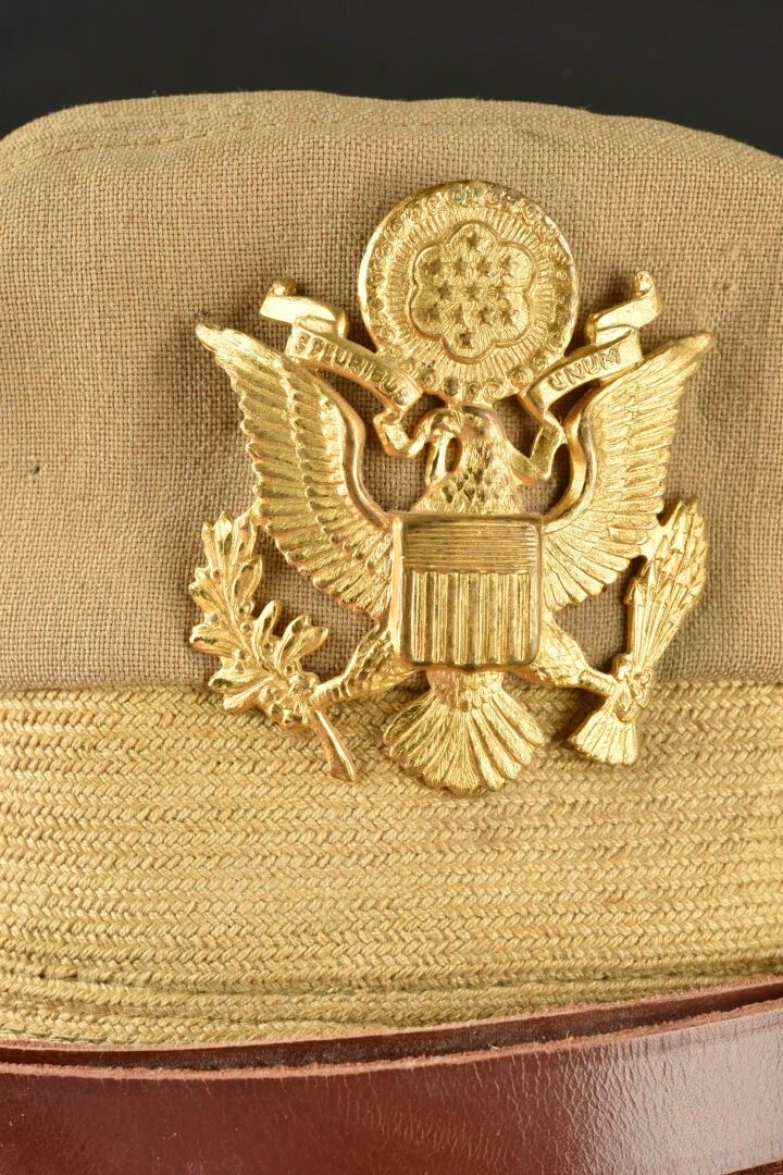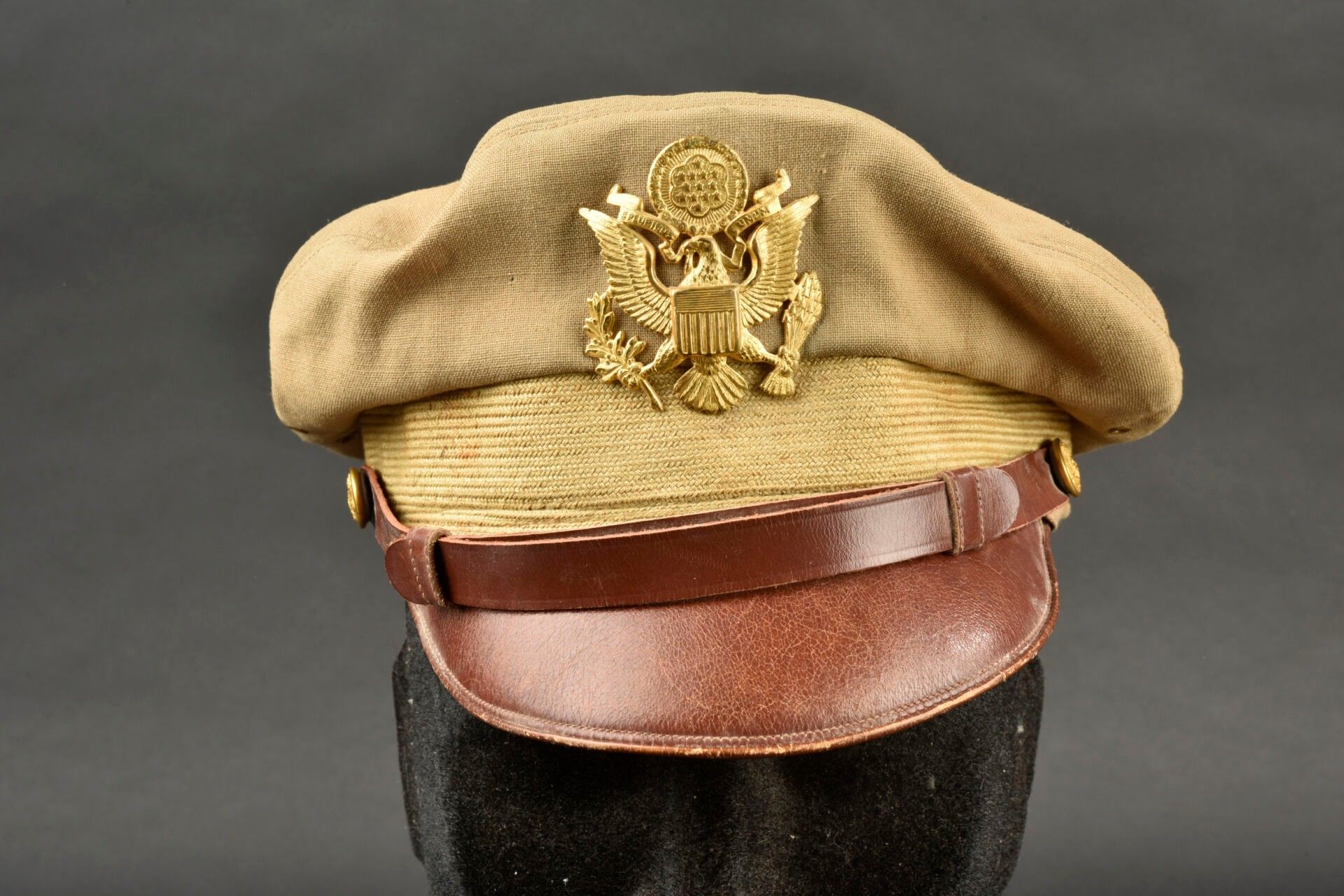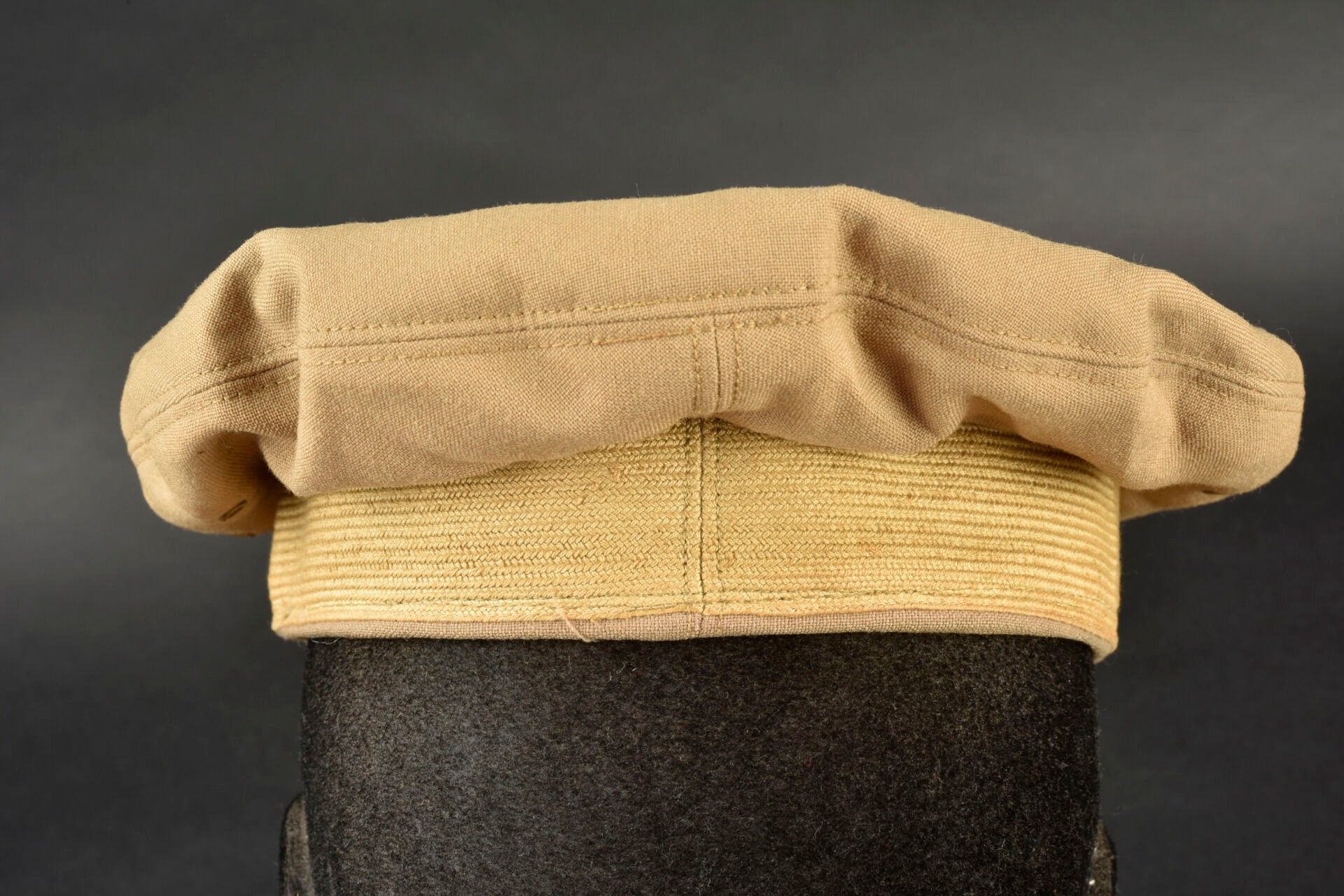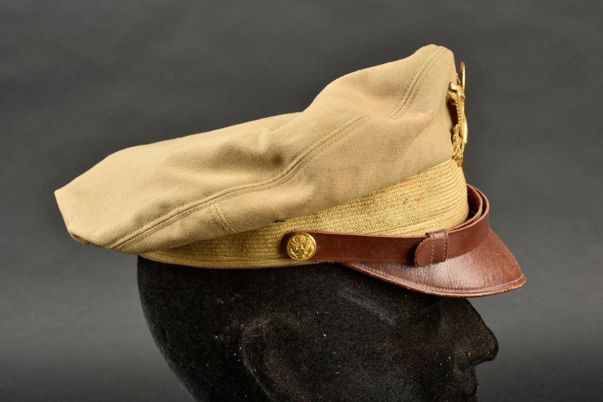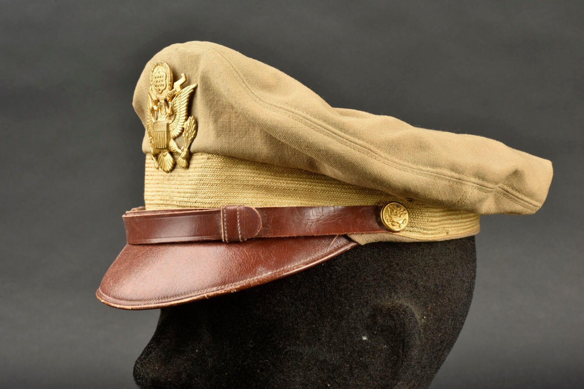 US officer's cap. In chino fabric. Soft leather visor. Very nice broken shape. Gilt metal officer's badge. Brown leather chinstrap. Screw clasp. Beige mohair headband. Lined with brown waterproof fabric. Manufacturer's logo illegible. Nameplate under visor BC Dunnam Capt. Brown leather sweatband. Made by 7 Lighter Bancroft. Some wear and patina to be noted, as well as a few stains and tears. Condition II+. 2+