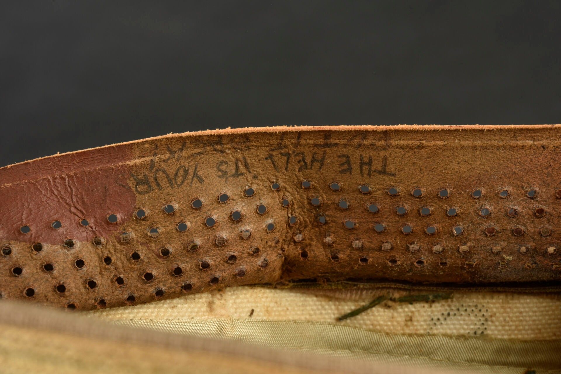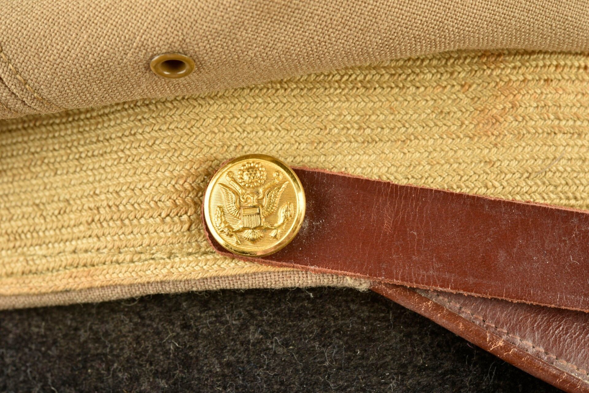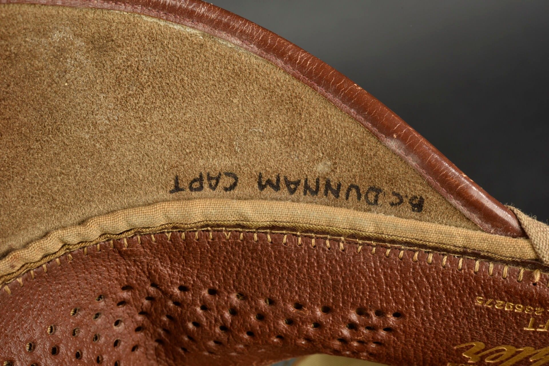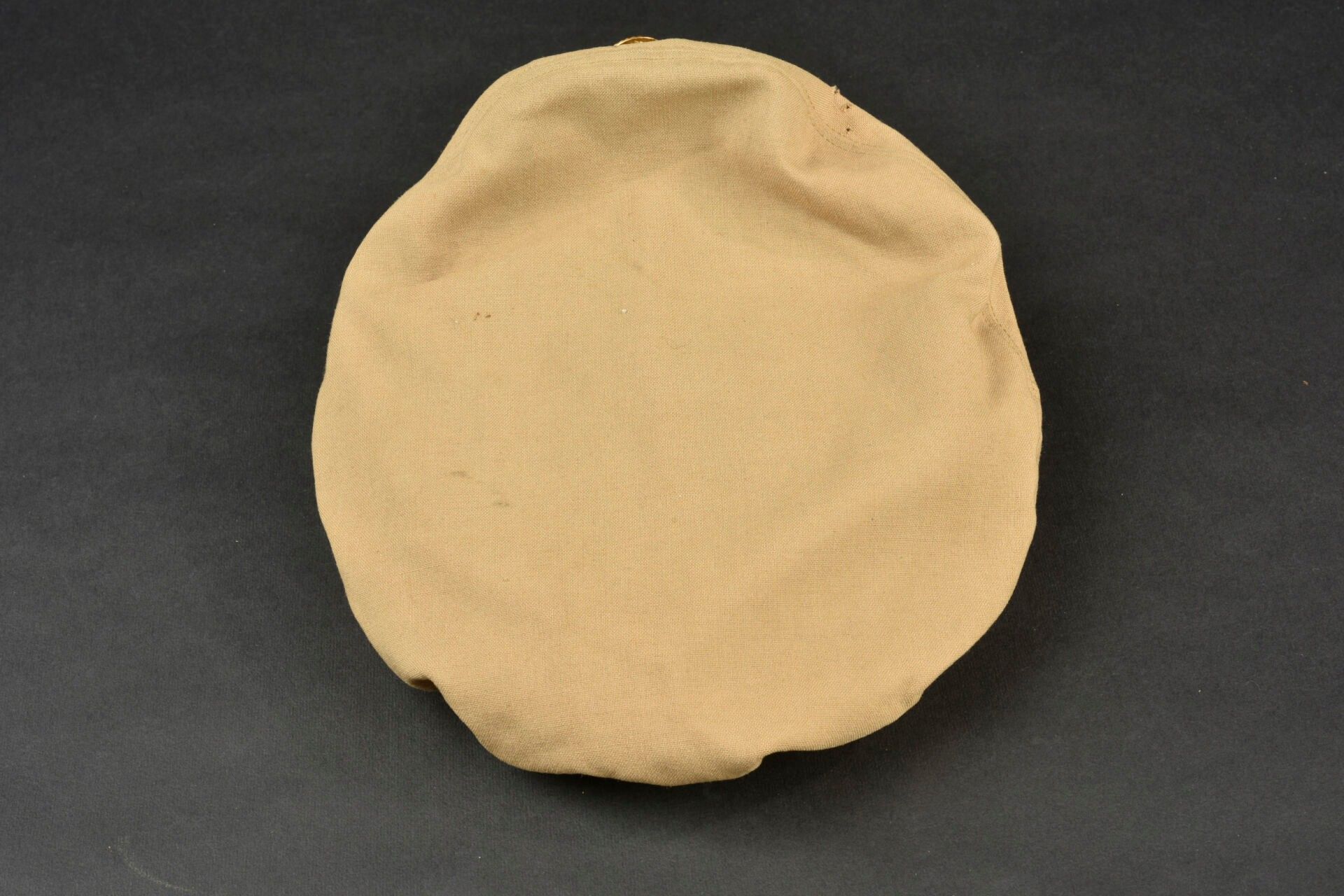 US officer's cap. In chino fabric. Soft leather visor. Very nice broken shape. Gilt metal officer's badge. Brown leather chinstrap. Screw clasp. Beige mohair headband. Lined with brown waterproof fabric. Manufacturer's logo illegible. Nameplate under visor BC Dunnam Capt. Brown leather sweatband. Made by 7 Lighter Bancroft. Some wear and patina to be noted, as well as a few stains and tears. Condition II+. 2+
