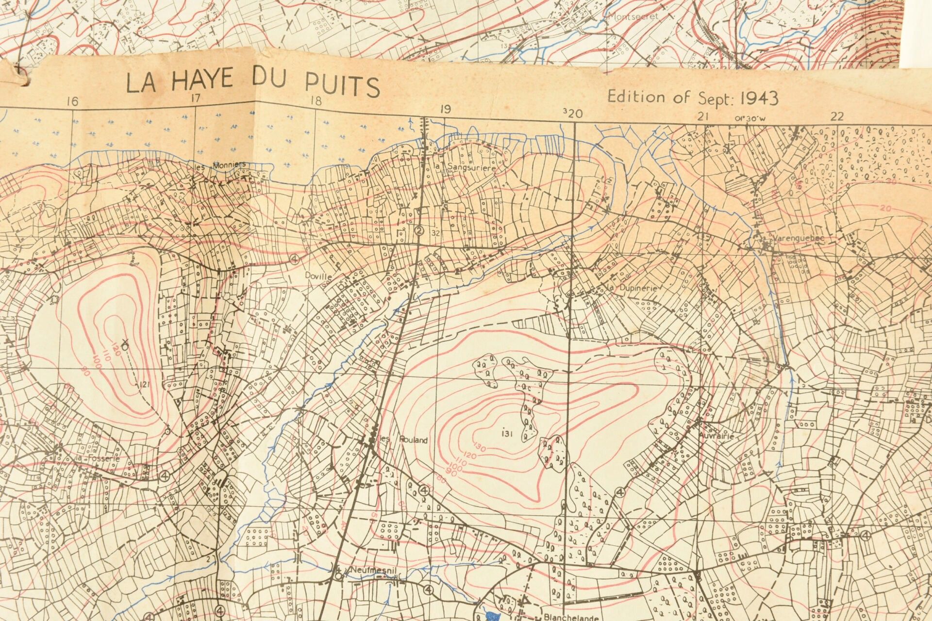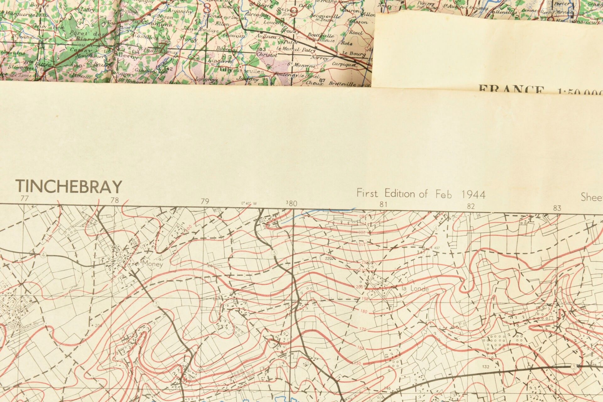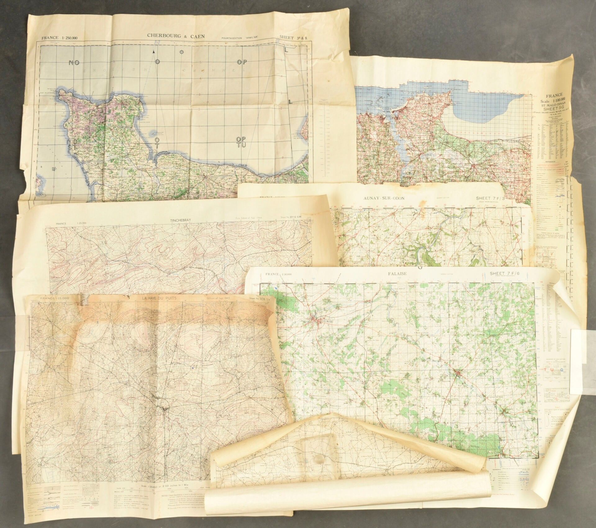 US maps. Including a Cherbourg/Caen map, 4th edition, dated 1943. A map of Falaise, dated 1943, second edition. A map of Aunay sur Odon, second edition, 1943. An English map of Iffendic, first edition, 1944. A map of La Haye Du Puit 1943. A map of Tinchebray 1944. A map of Saint Malo 1944. Some wear and patina to be noted, as well as stains, tears and missing items. Condition II+. 2+