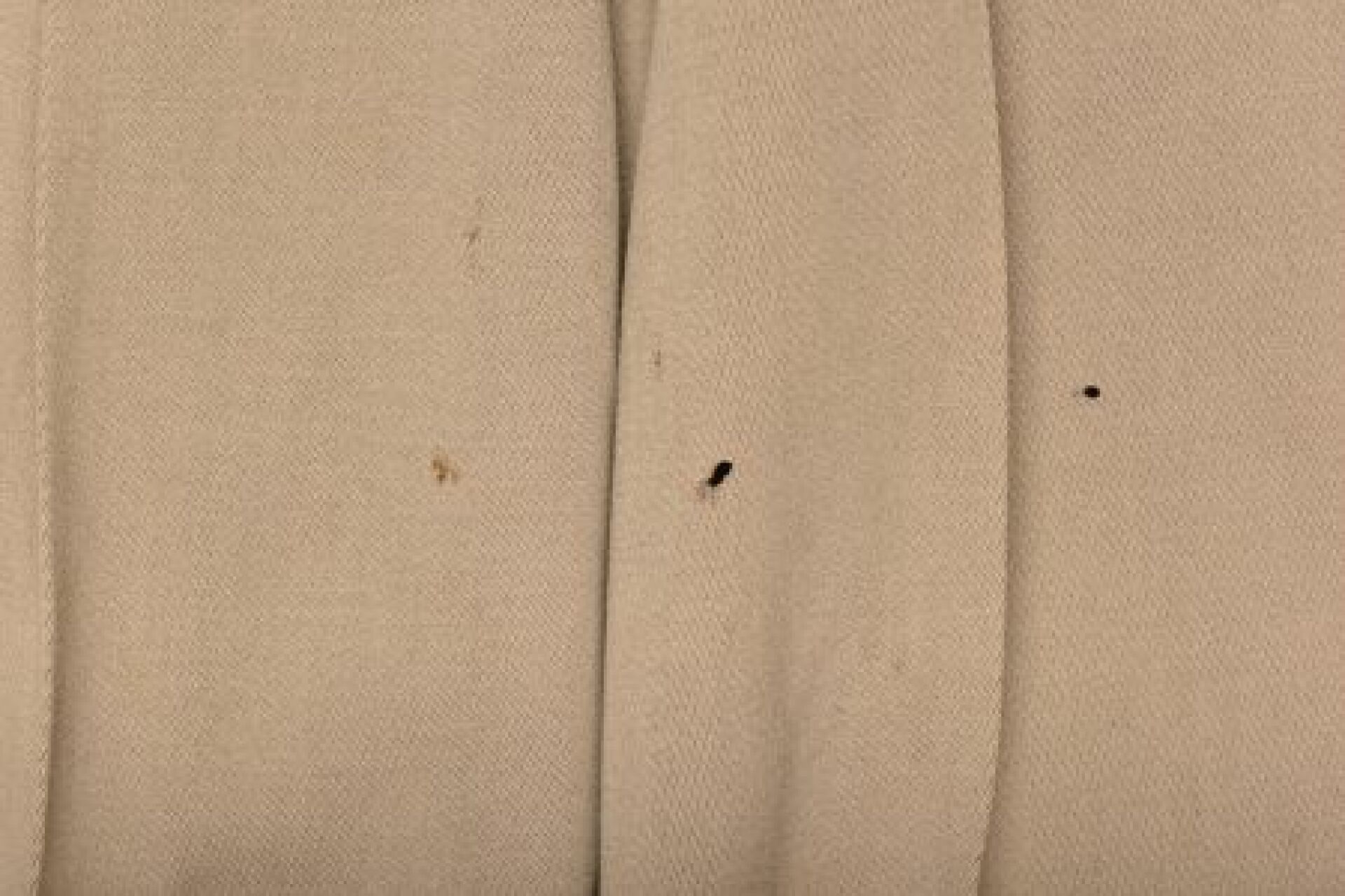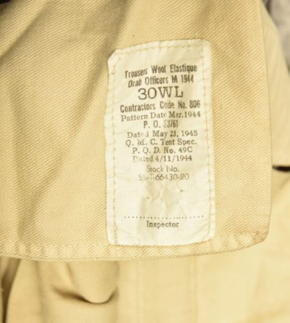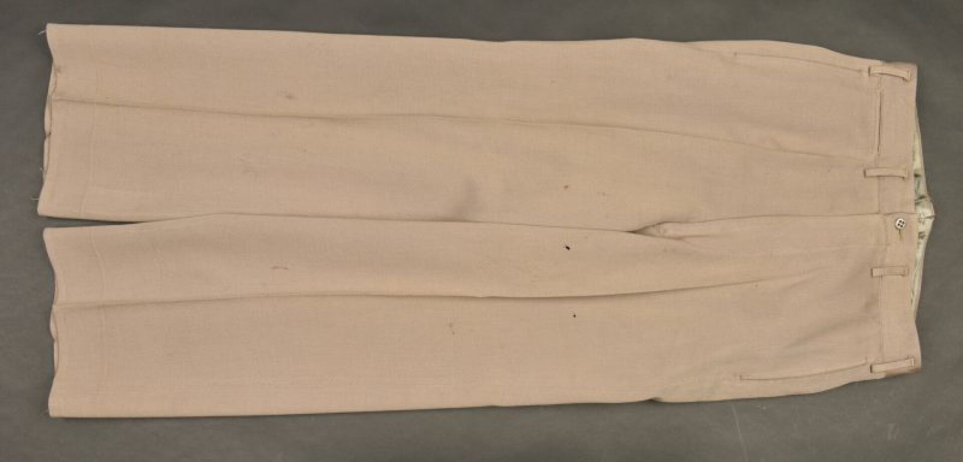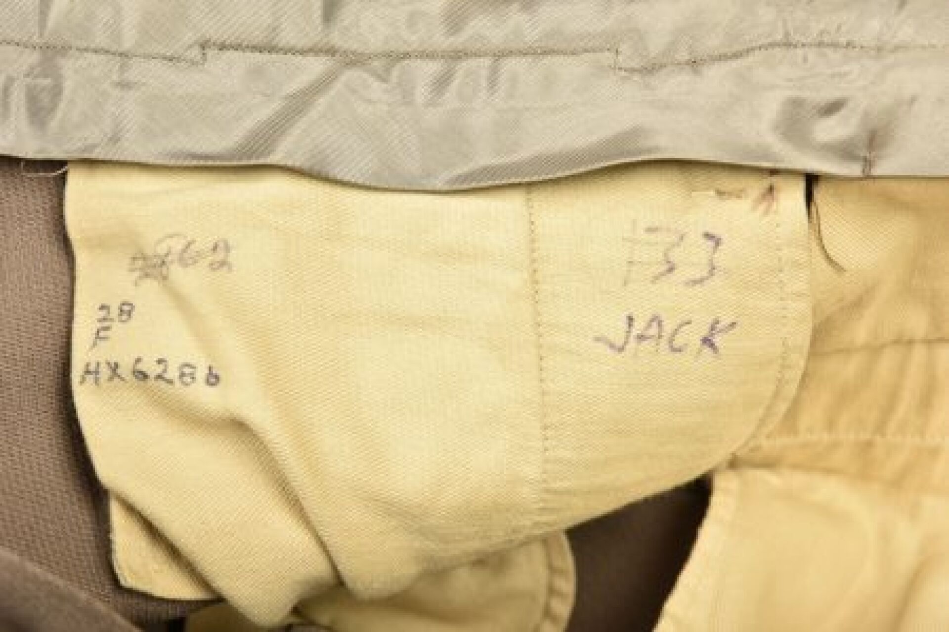 Pink officer's trousers. Grey/pink cotton fabric. All buttons present. Functional zip. Made by Talon. Lined in grey sateen and white cotton fabric. Label marked Regulation Army Officer's Trousers. Nameplate Jack. Slight wear and patina, as well as a few moth marks. Condition II+. 2+