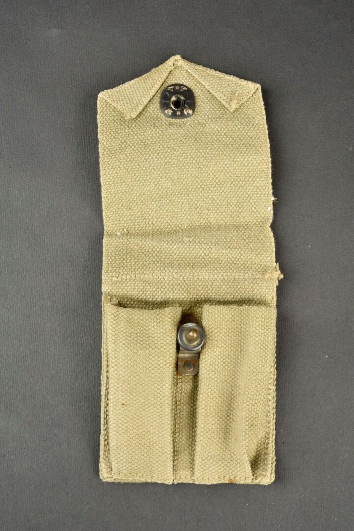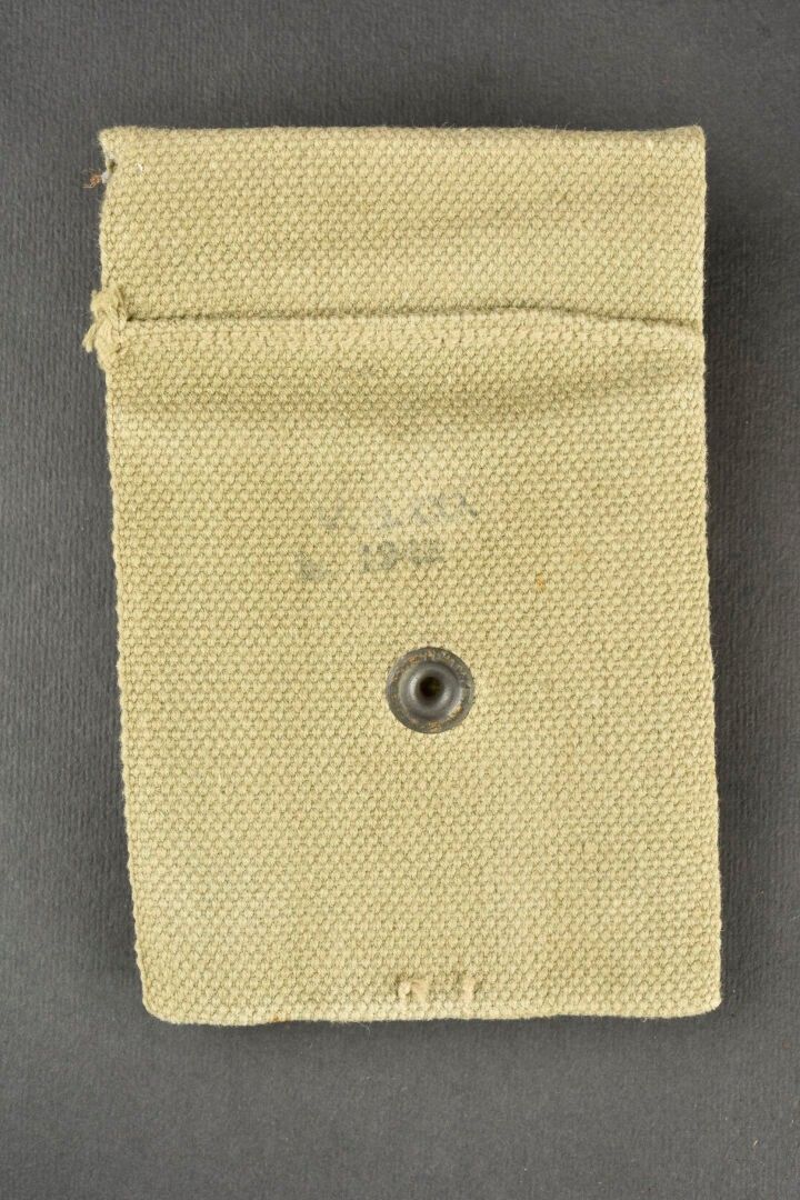 Colt 45 magazine holder. In heavy OD canvas faded by the sun. Nice US marking on the flap. Functional snap. Markings illegible. Some wear, patina and stains. Condition II+. 2+