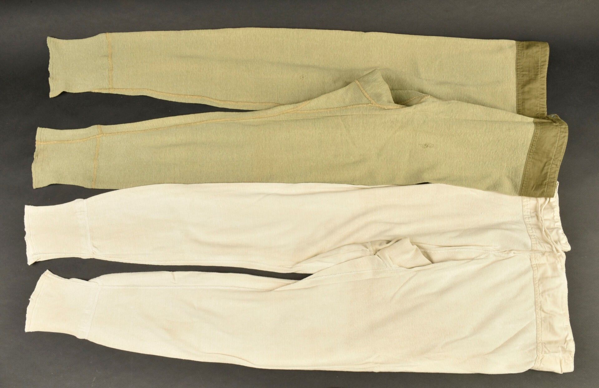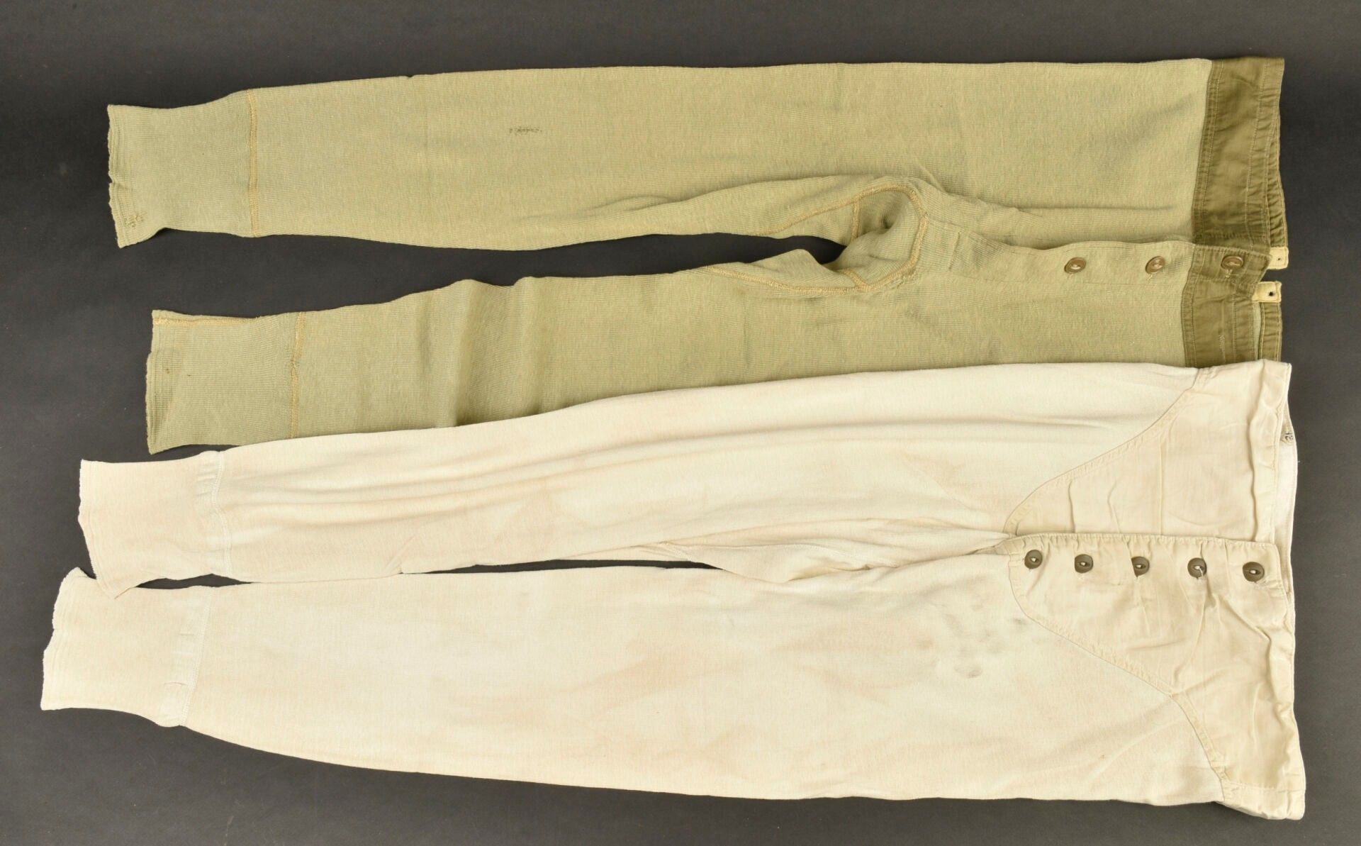 US boxer shorts. Comprising one pair of long johns in heavy white fabric, all buttons present, drawstring incomplete, no visible markings. One pair of long johns, khaki fabric, all buttons present, drawstring missing. The markings are illegible. Some wear, patina and stains. Condition II+. 2+
