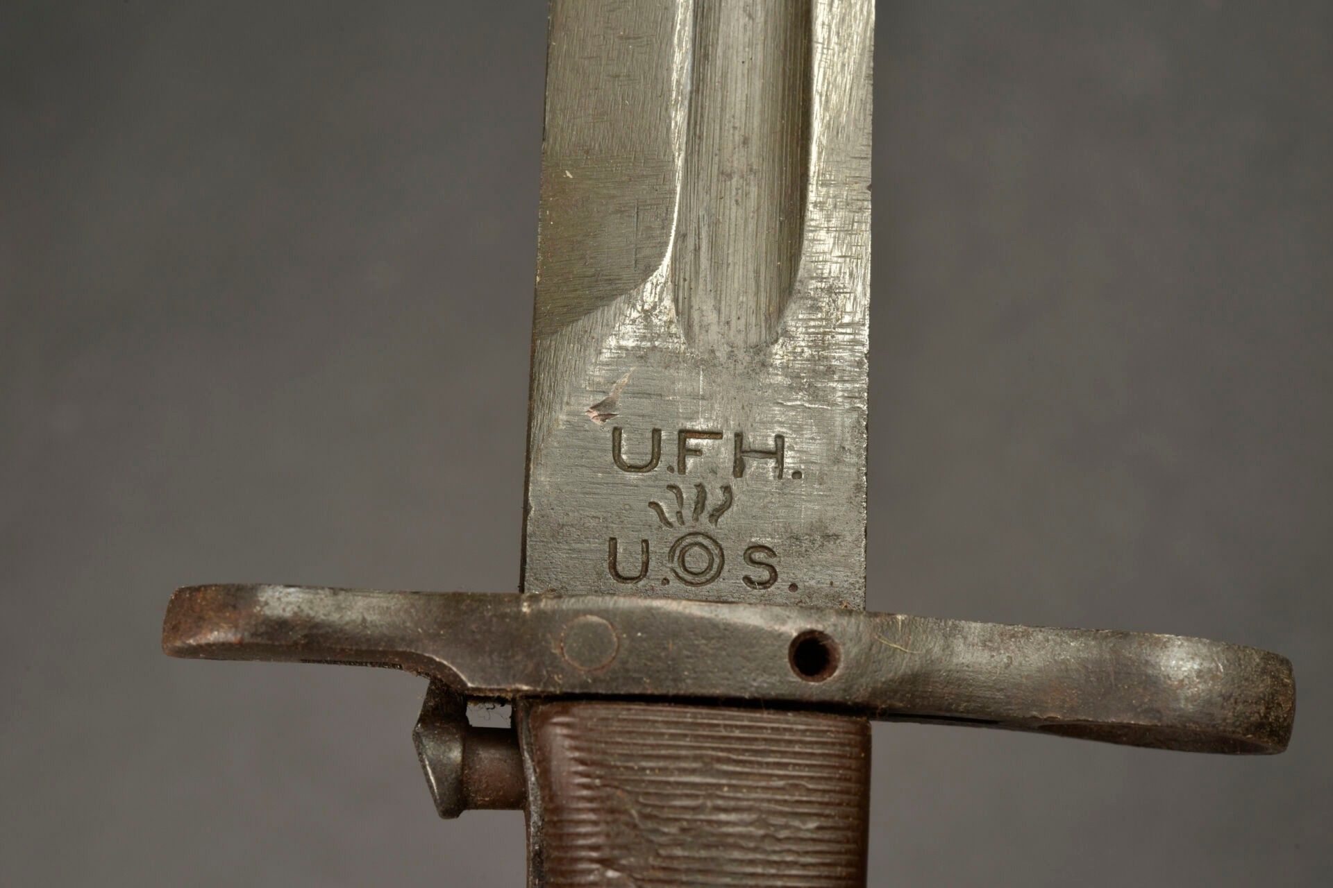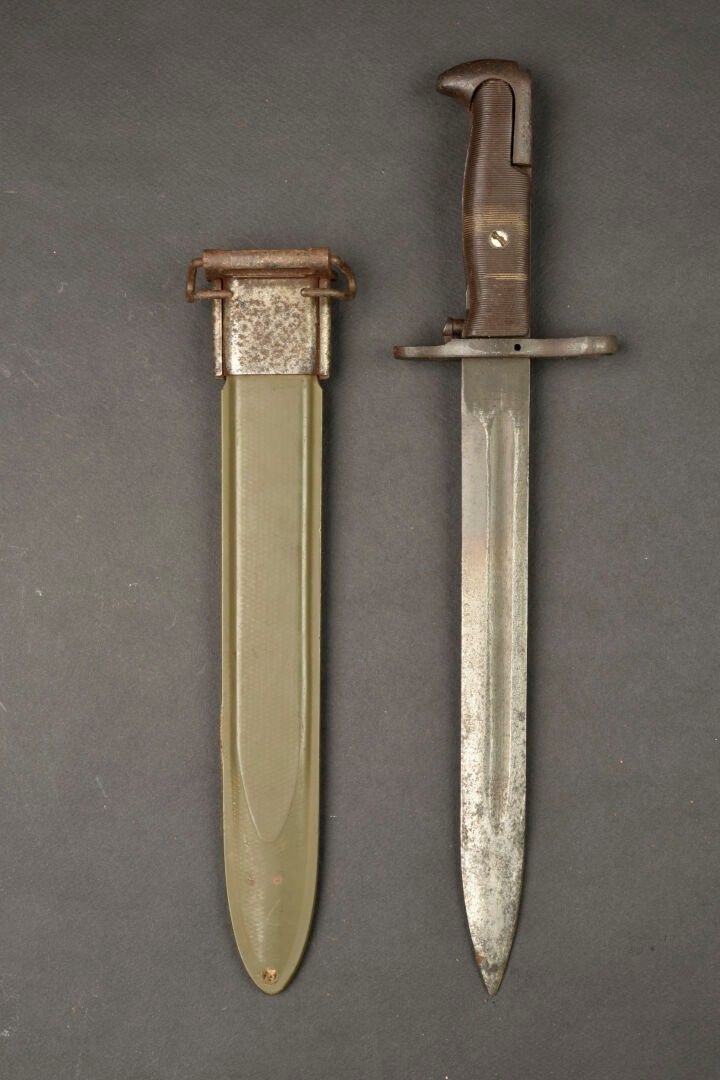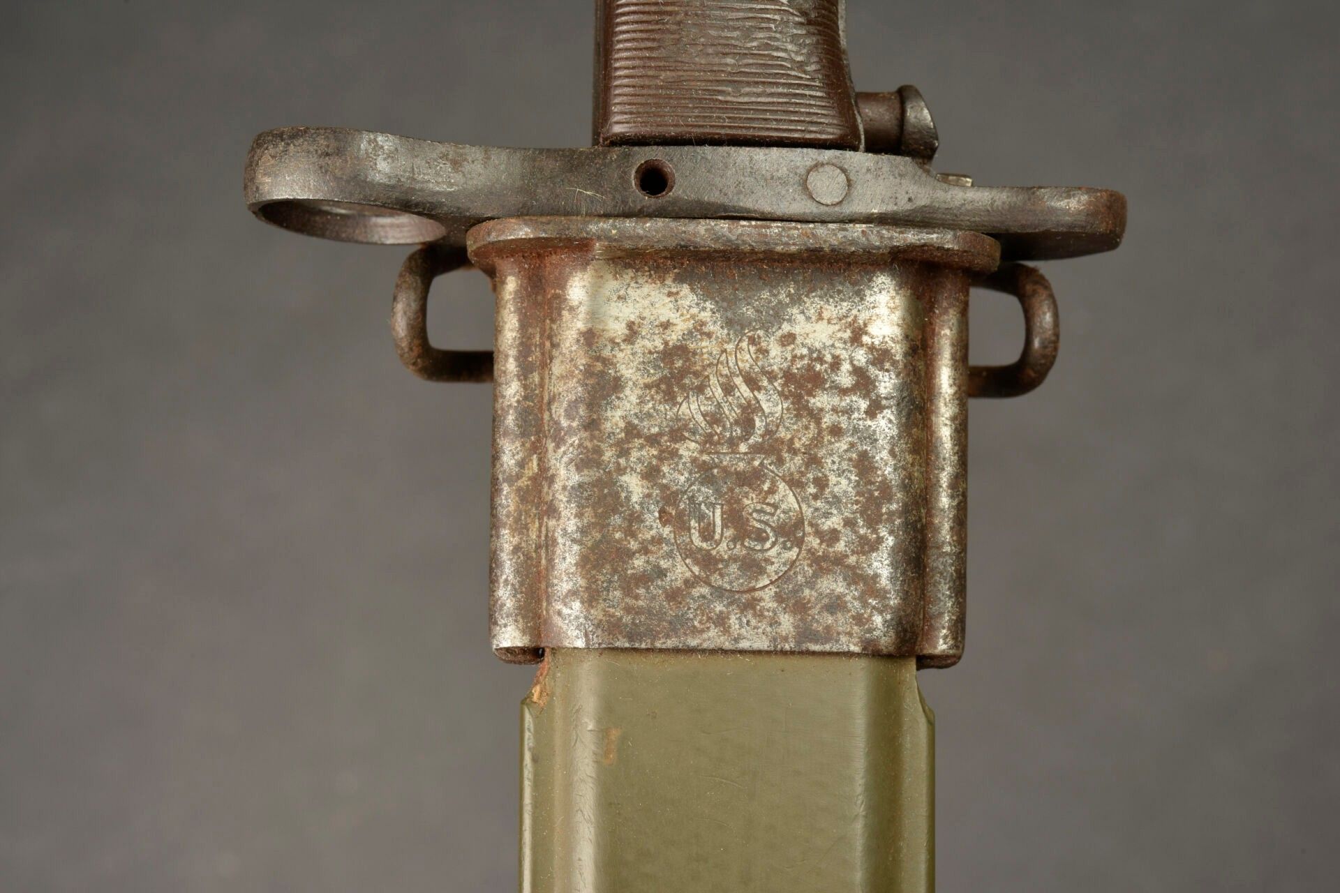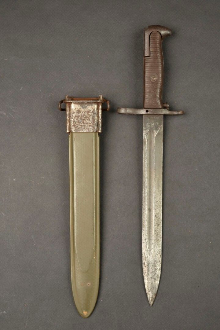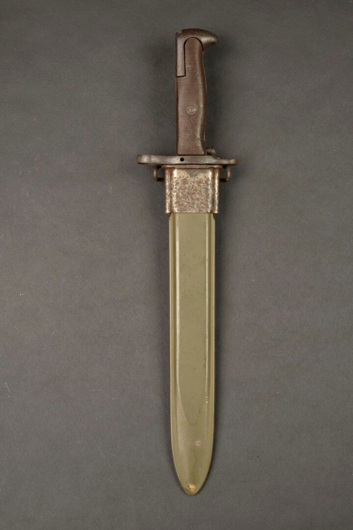 Garand bayonet. Short model. Bakelite grips. The metal fittings are partially oxidised. Blade in relatively good condition. UFH US made. Complete scabbard. The belt hook is present. 90% khaki paint. All metal fittings are oxidised. Some wear and patina. Condition II+. For adults only.