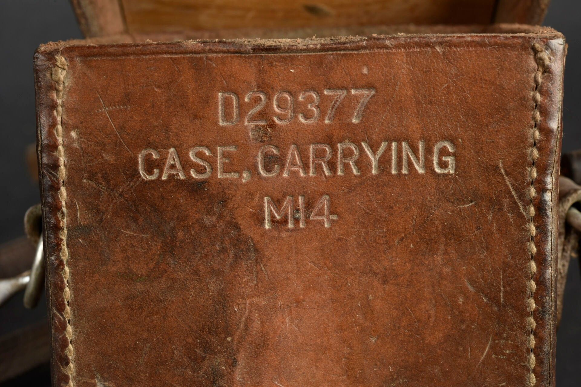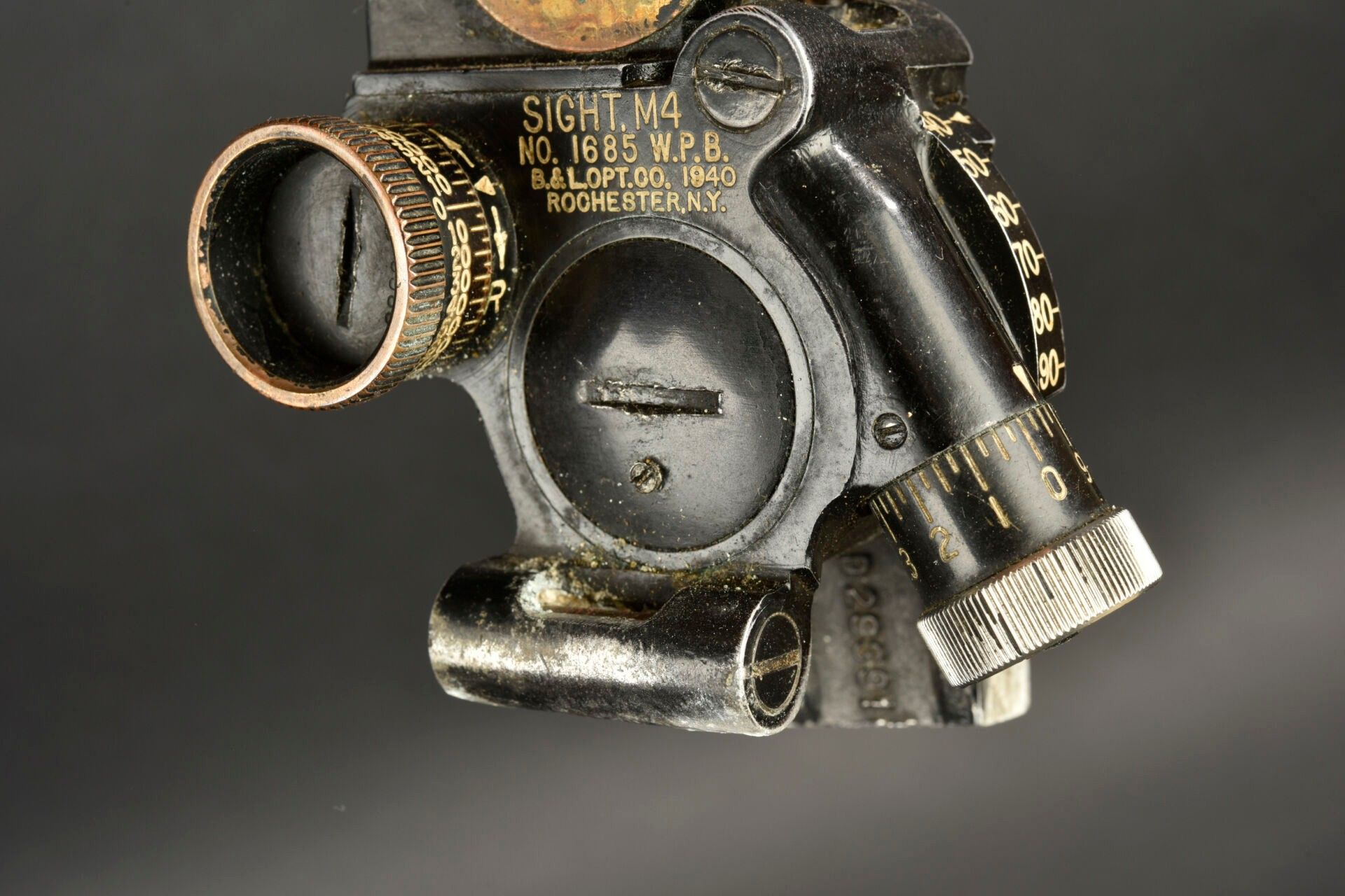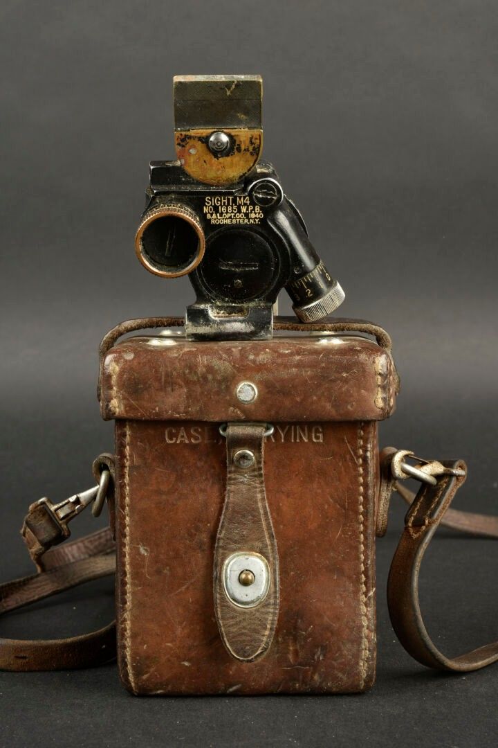 Sight M4. Metal, all moving parts are functional. Sight M4 NO 1685 WPB B&Lopt CO 1940 Rochester NY markings. Thick brown leather case. Closing strap and carrying strap are present. Markings D29377 Case Carrying M14. The internal racks are present. Some wear, patina and stains. Condition II+. 2+