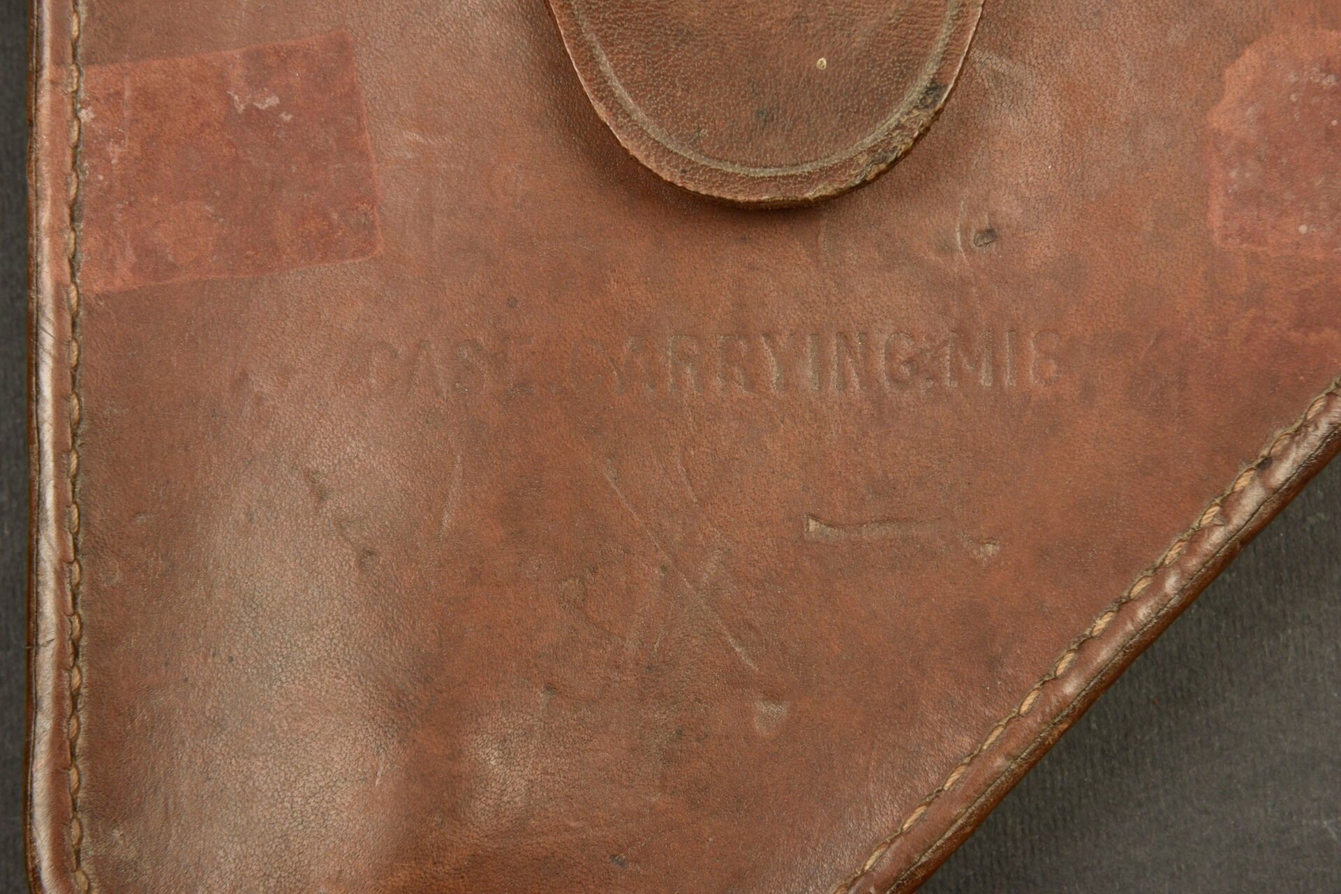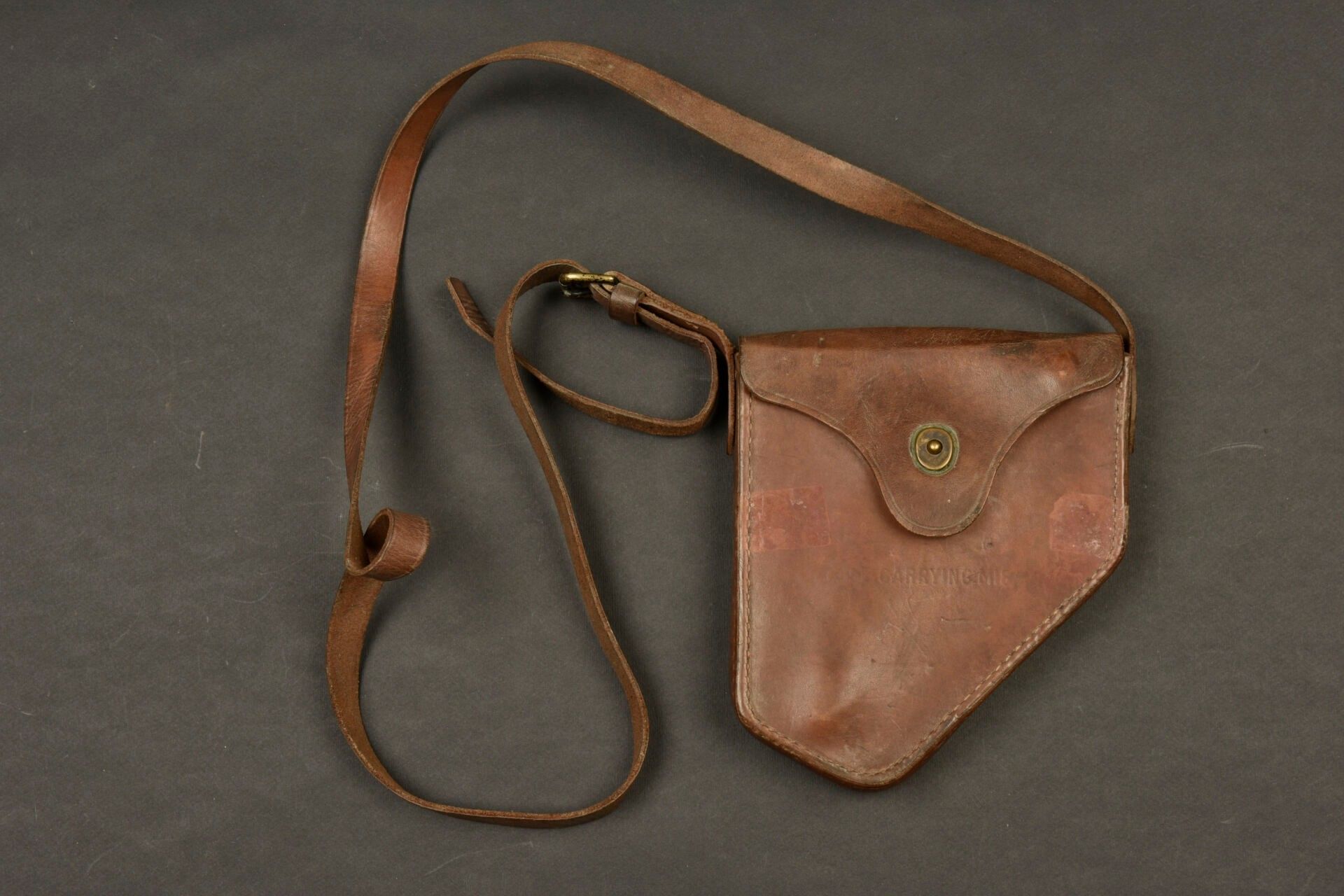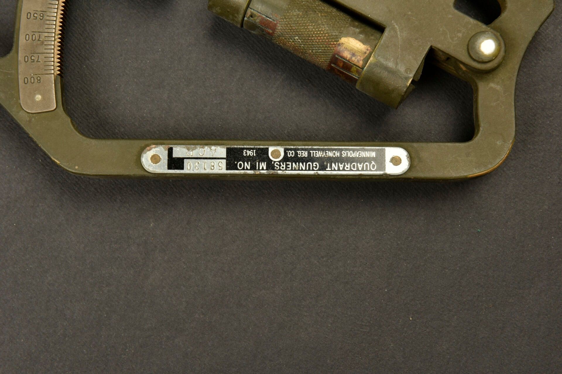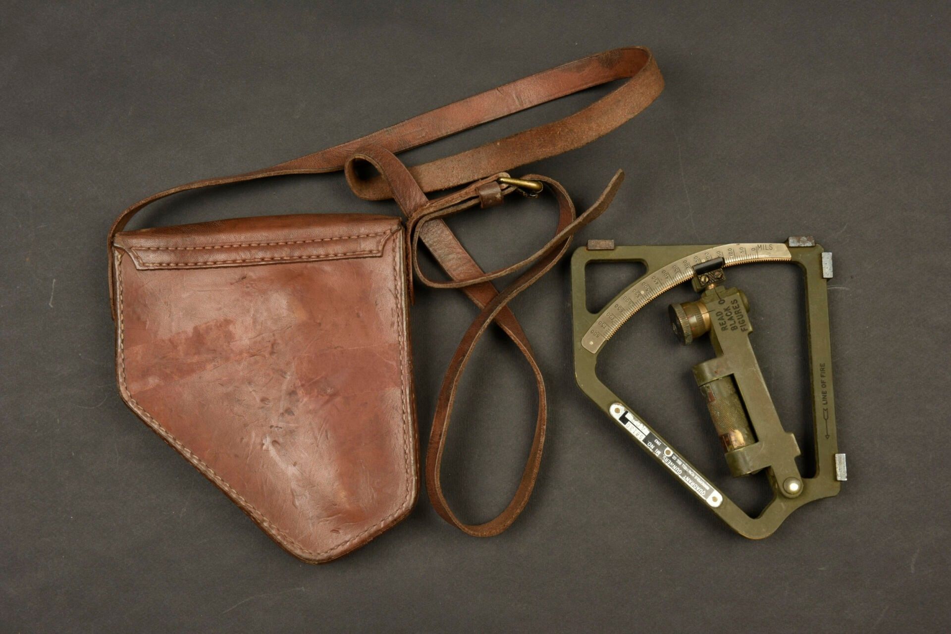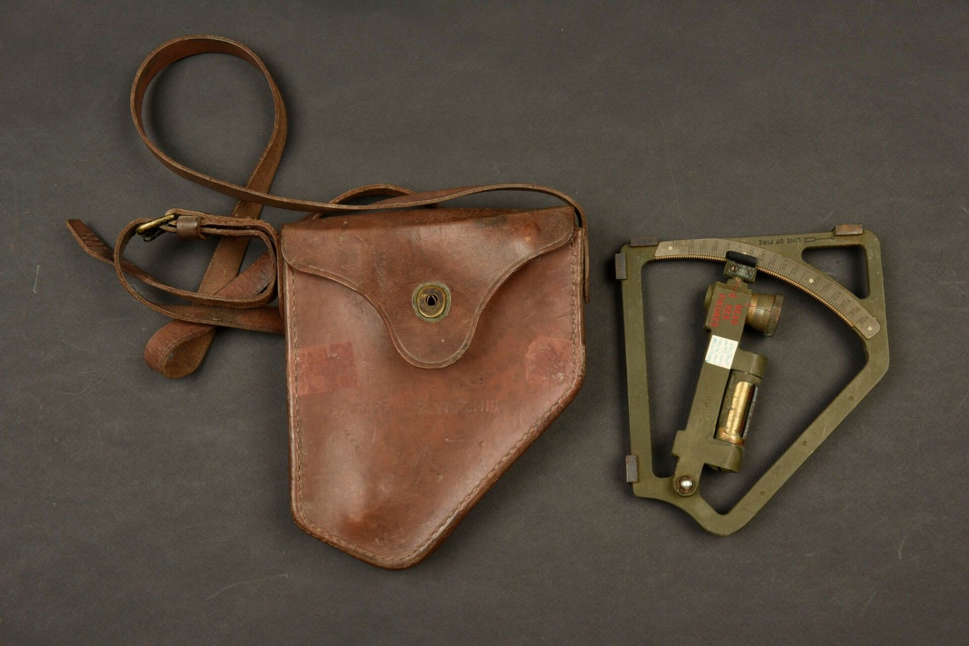 Quadrant Gunners M1. Metal instrument, 70% khaki paint. Label marked Quadrant Gunners M1, number 58130, Mineapolis Honeywell Reg Co 1943. Functional spirit level. Thick brown leather case. The snap is functional. Carrying strap present. Case Carrying M18 markings. Some wear and patina to be noted, as well as stains to the leather. Condition II+. 2+
