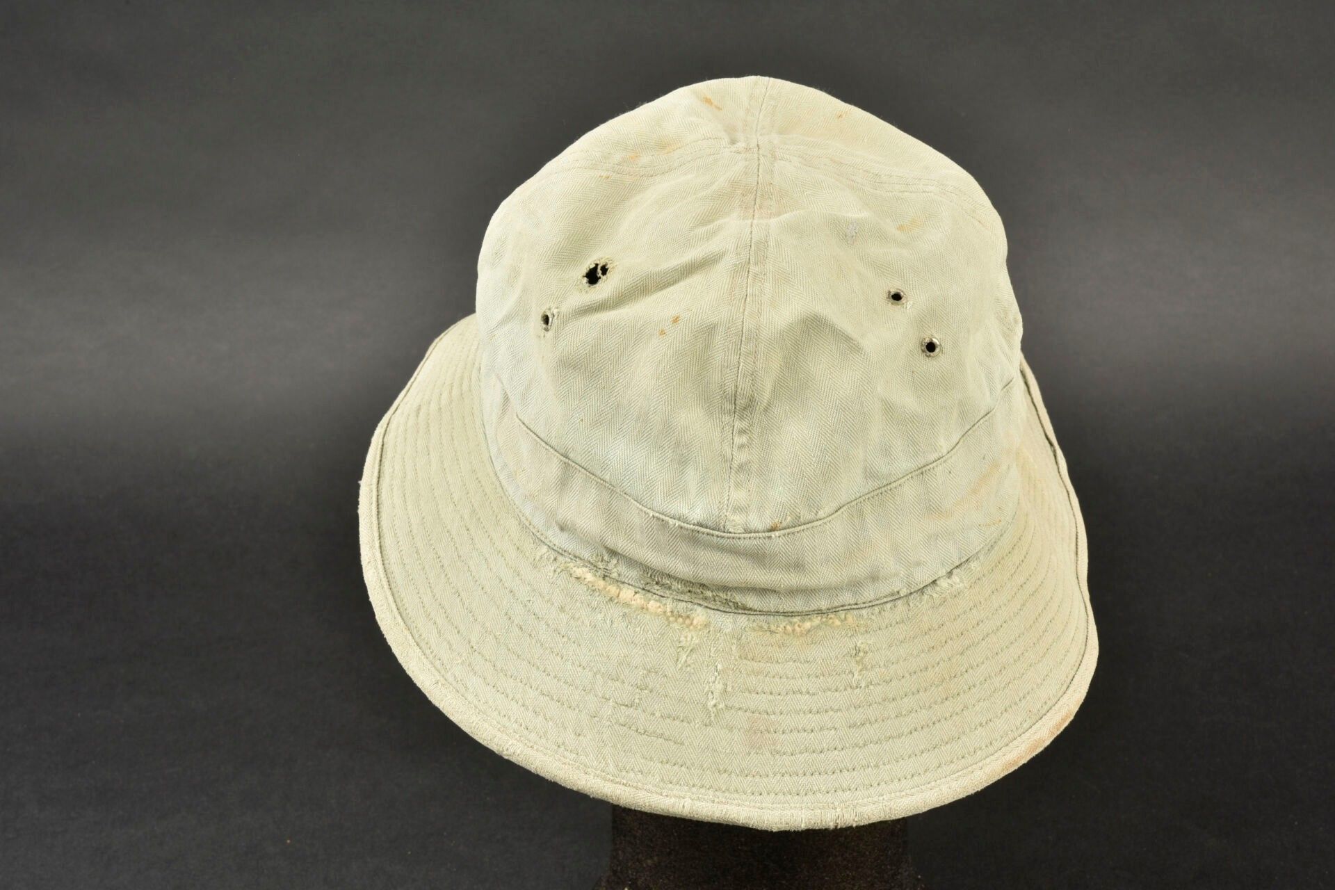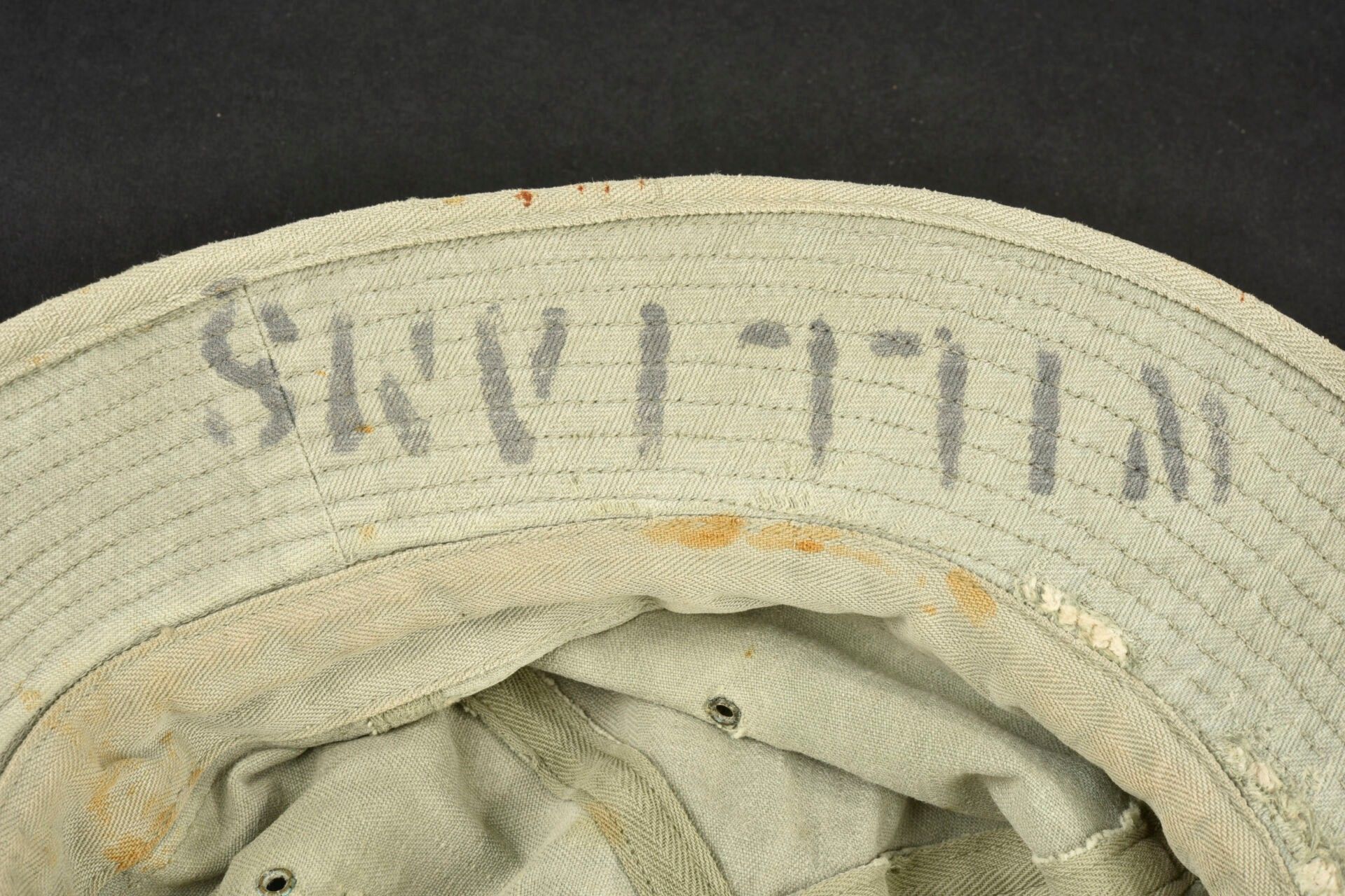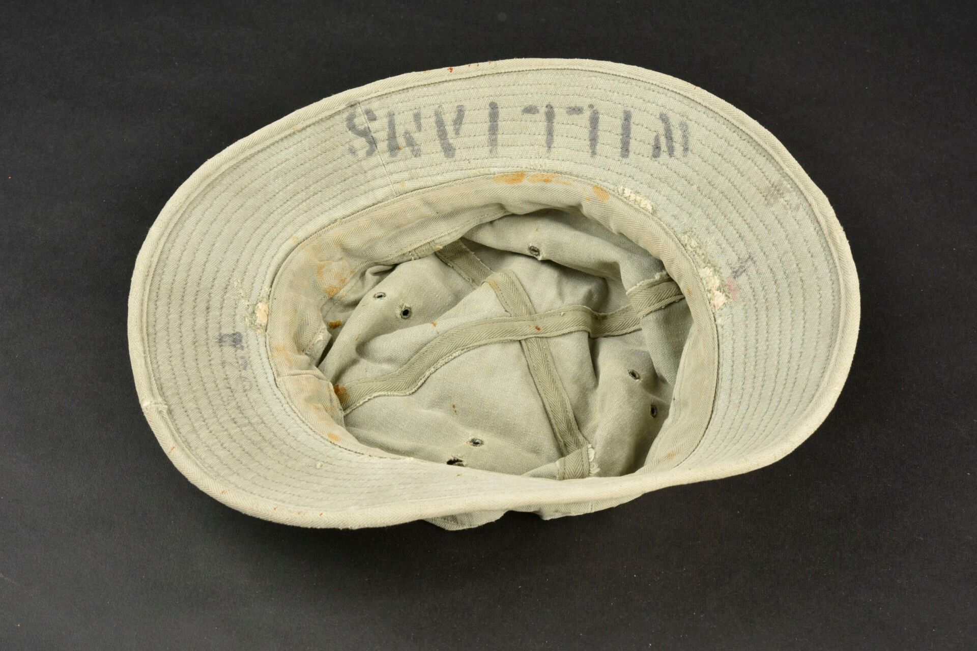 HBT hat. HBT fabric. Heavily sun-faded. Many wear marks. Four ventilation eyelets. Label missing. Stencilled name inscription, Williams. Laundry numbers partially illegible. Colour heavily sun-faded. Some wear and patina, as well as stains and tears. Condition II+. 2+