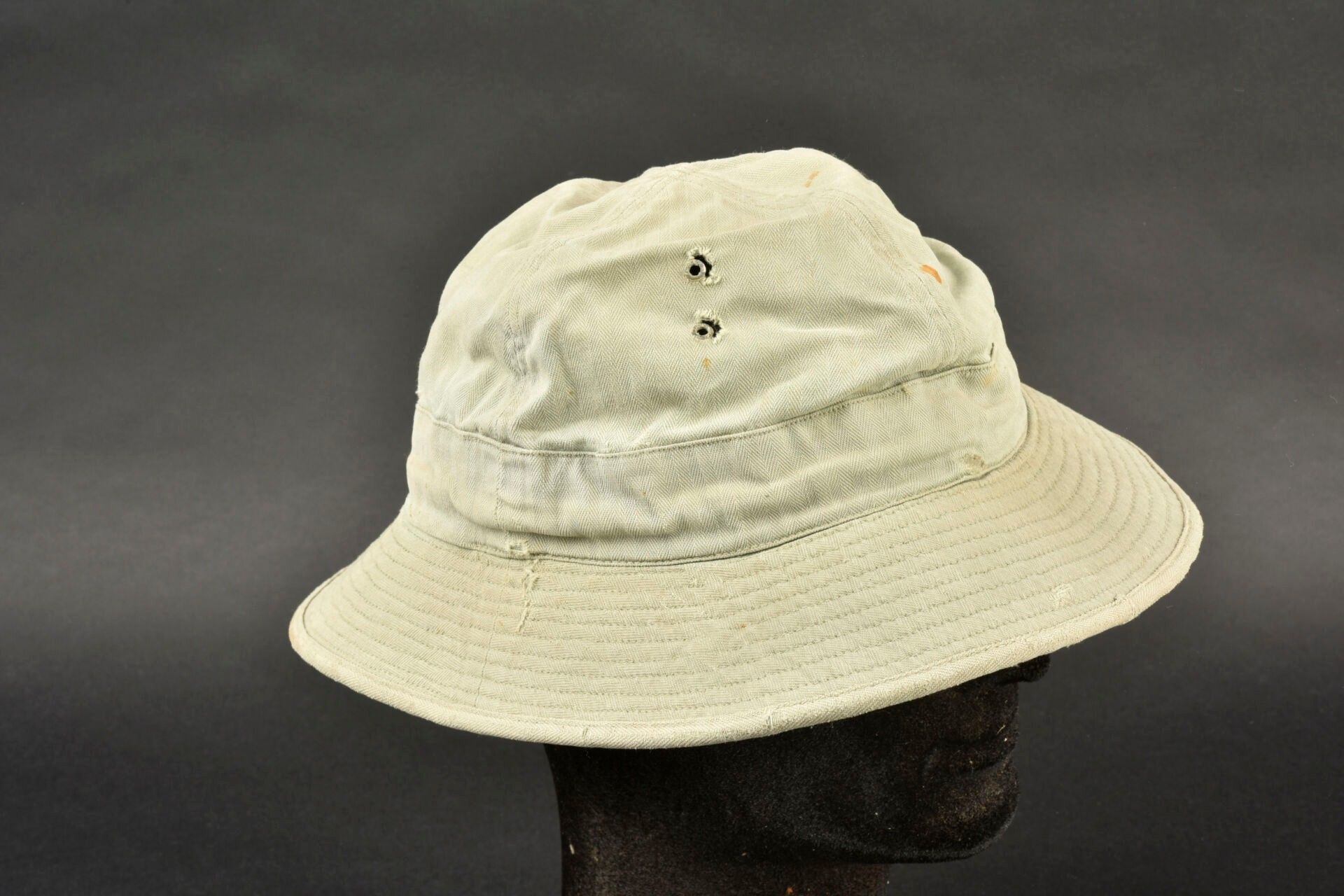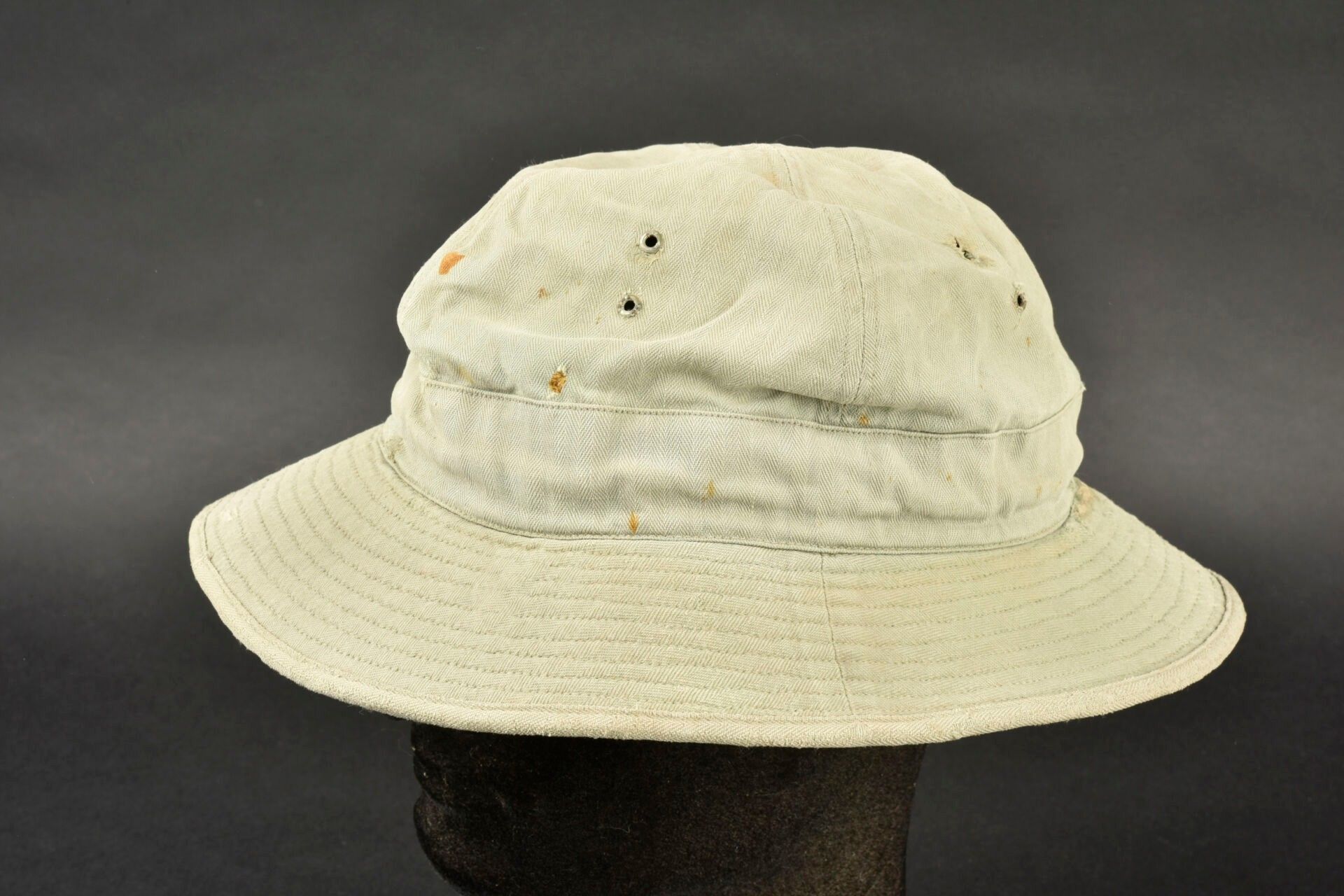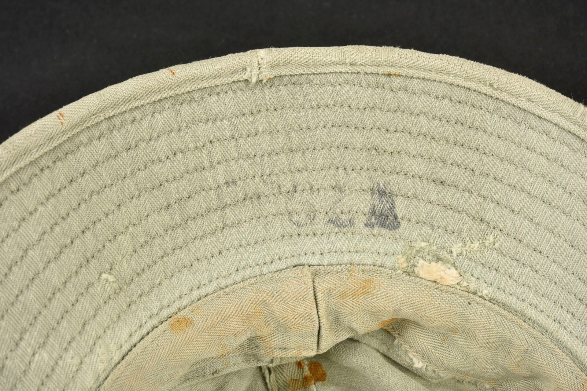 HBT hat. HBT fabric. Heavily sun-faded. Many wear marks. Four ventilation eyelets. Label missing. Stencilled name inscription, Williams. Laundry numbers partially illegible. Colour heavily sun-faded. Some wear and patina, as well as stains and tears. Condition II+. 2+
