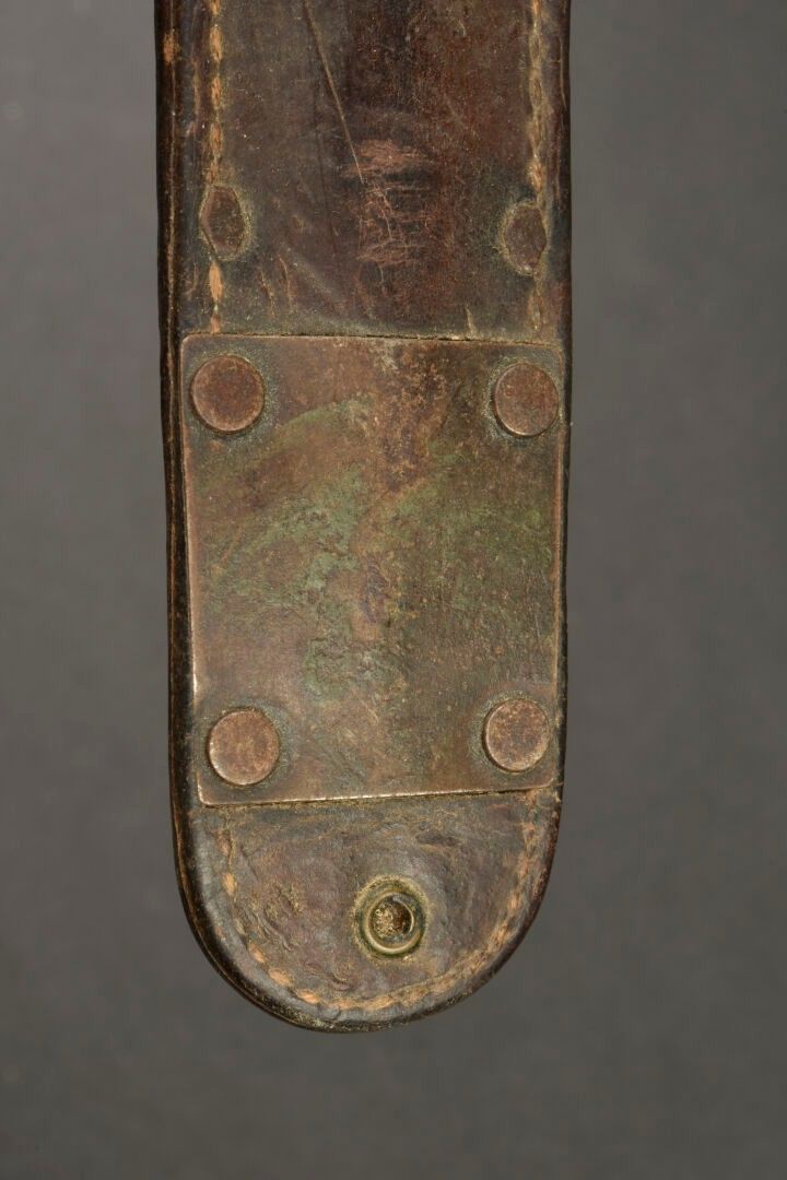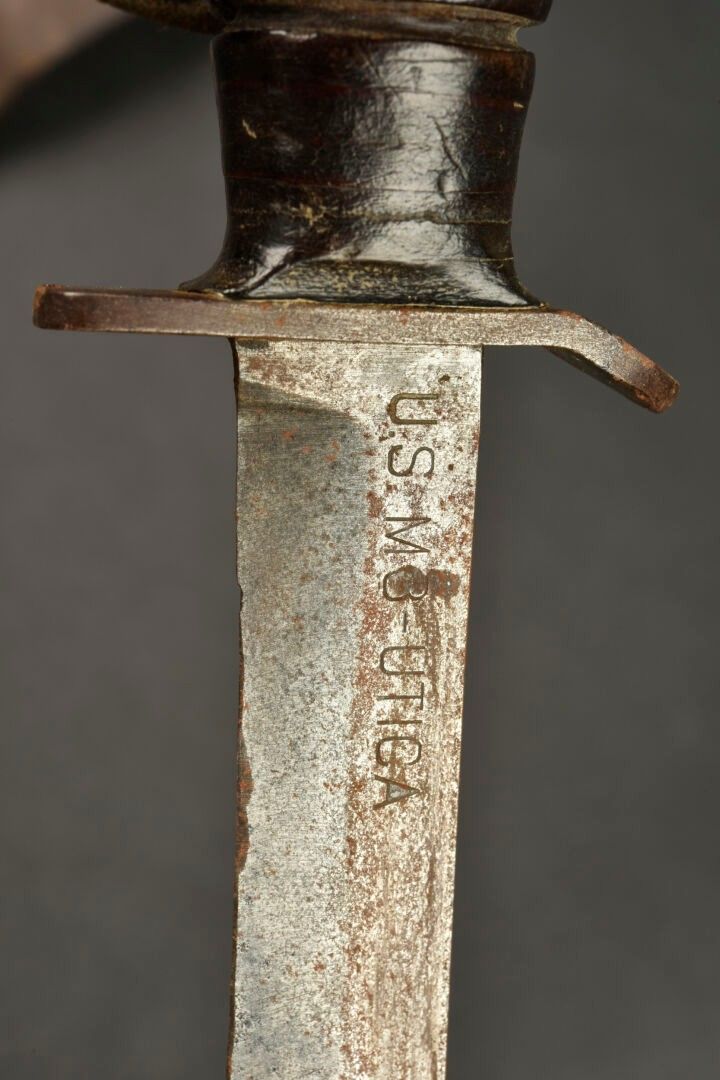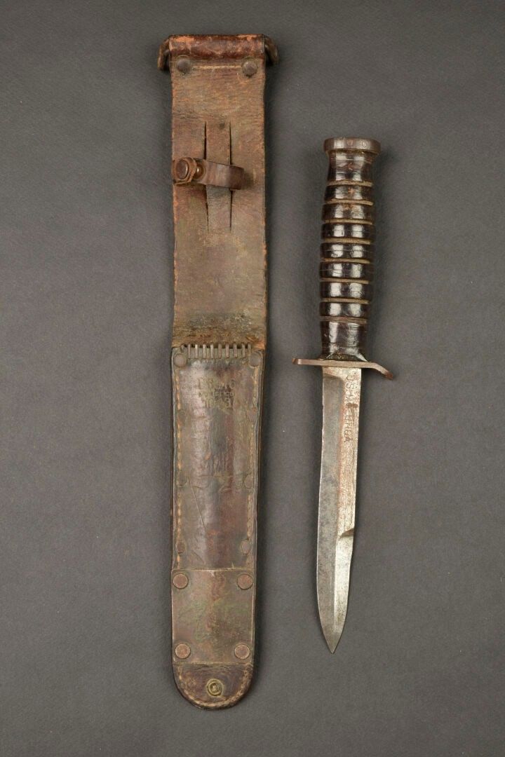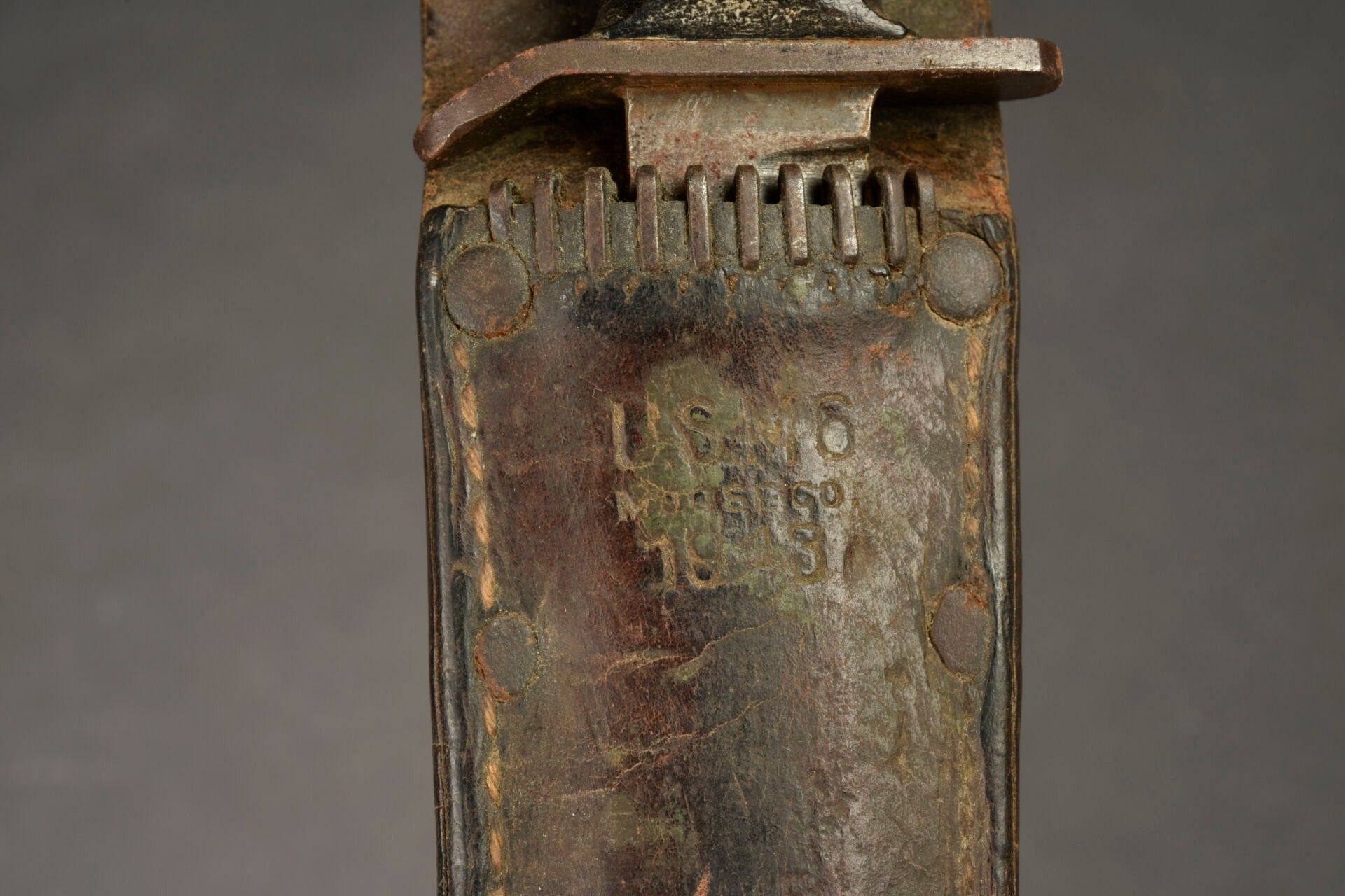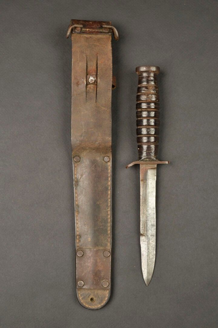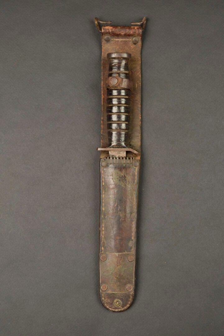 USM3 Utica combat knife with M6 scabbard. USM3 dagger, marked UTICA on blade, blade having been sharpened, wear, surface rust. Leather slab handle. In Moose M6 scabbard dated 1943. Brown leather, belt attachment hook and strap present, functional snap. Ten clips at the entrance to the scabbard. Metal plate, held in place by four rivets. Wear and patina II. For adults only.