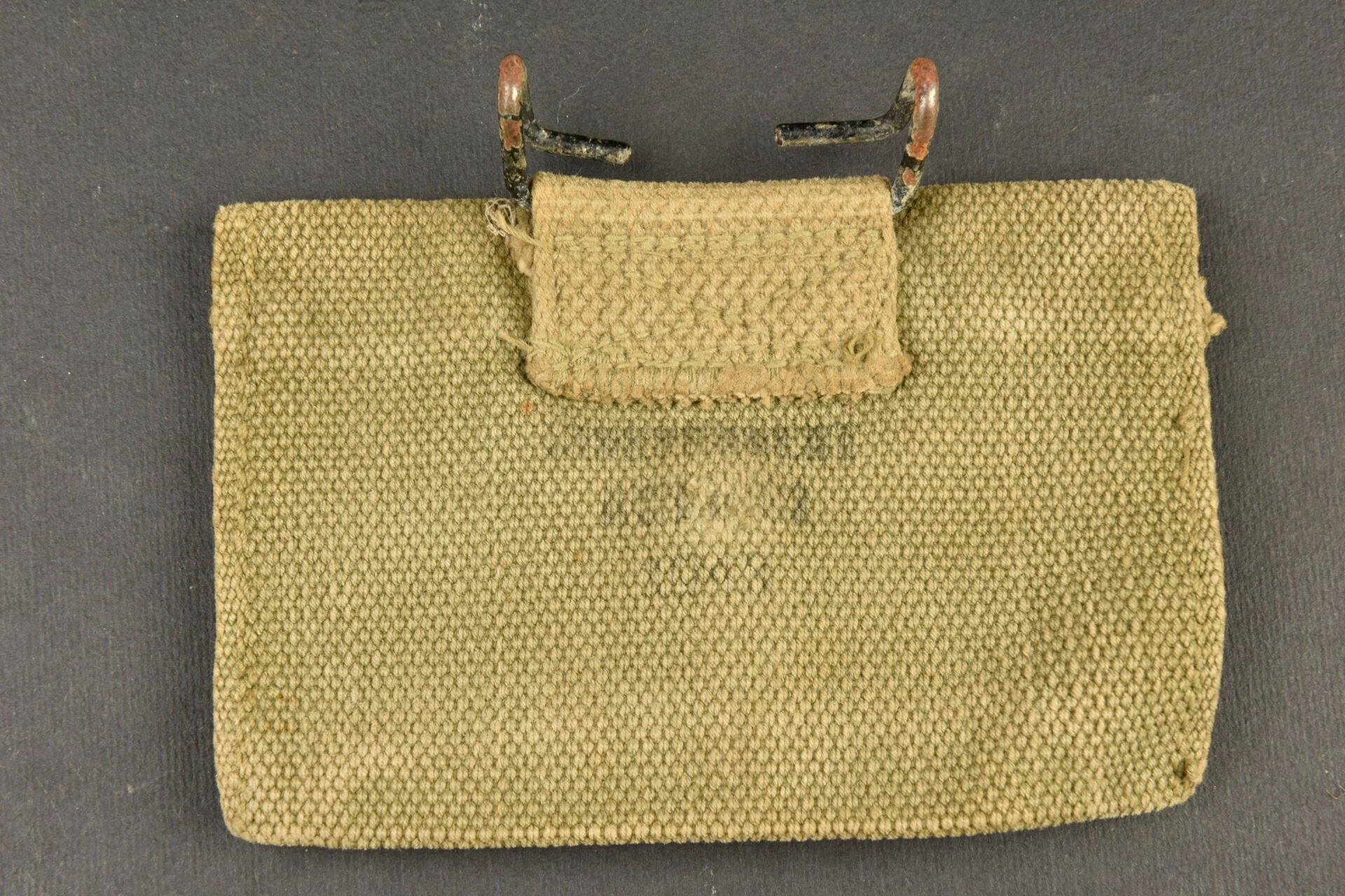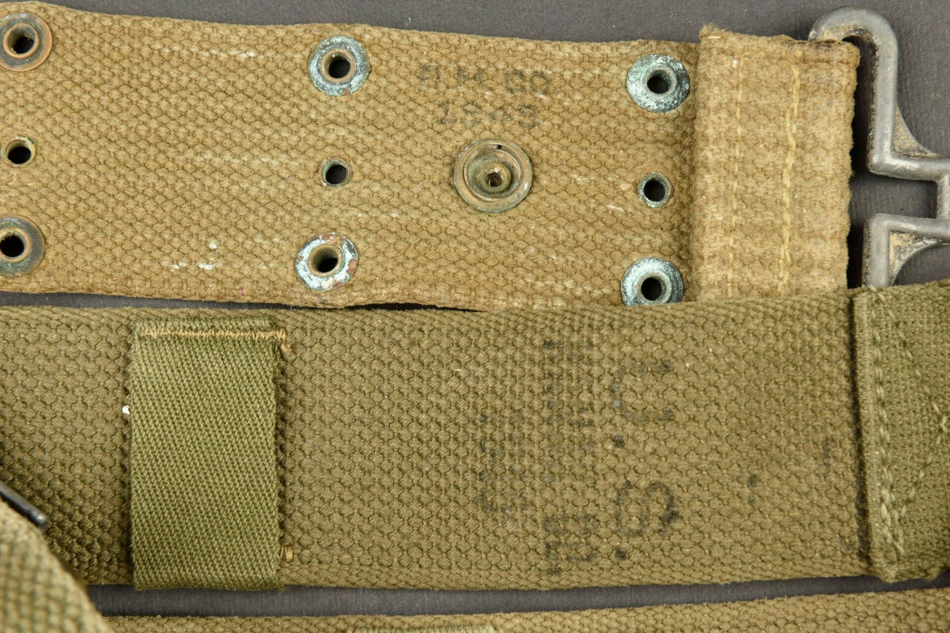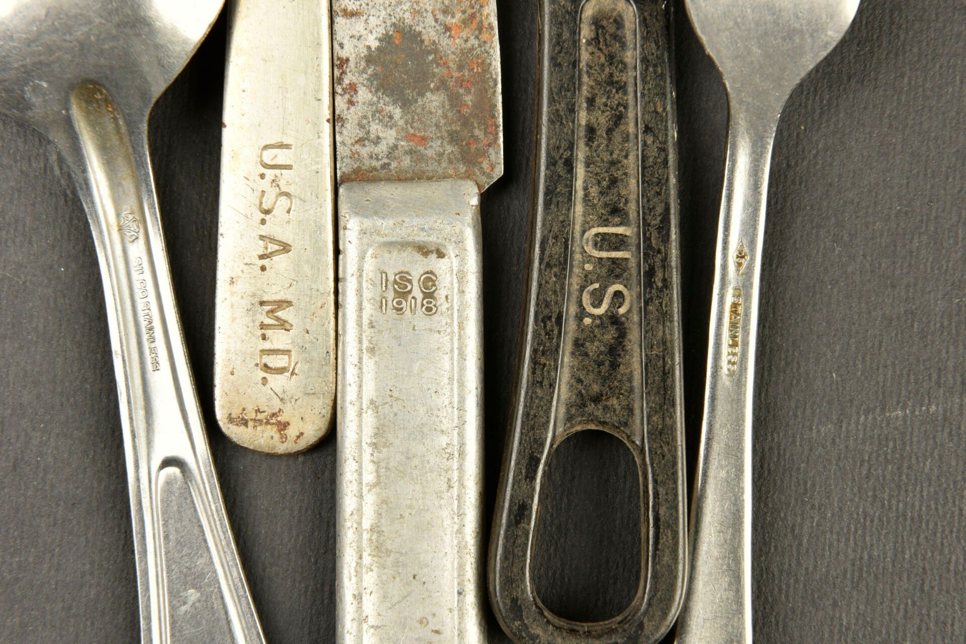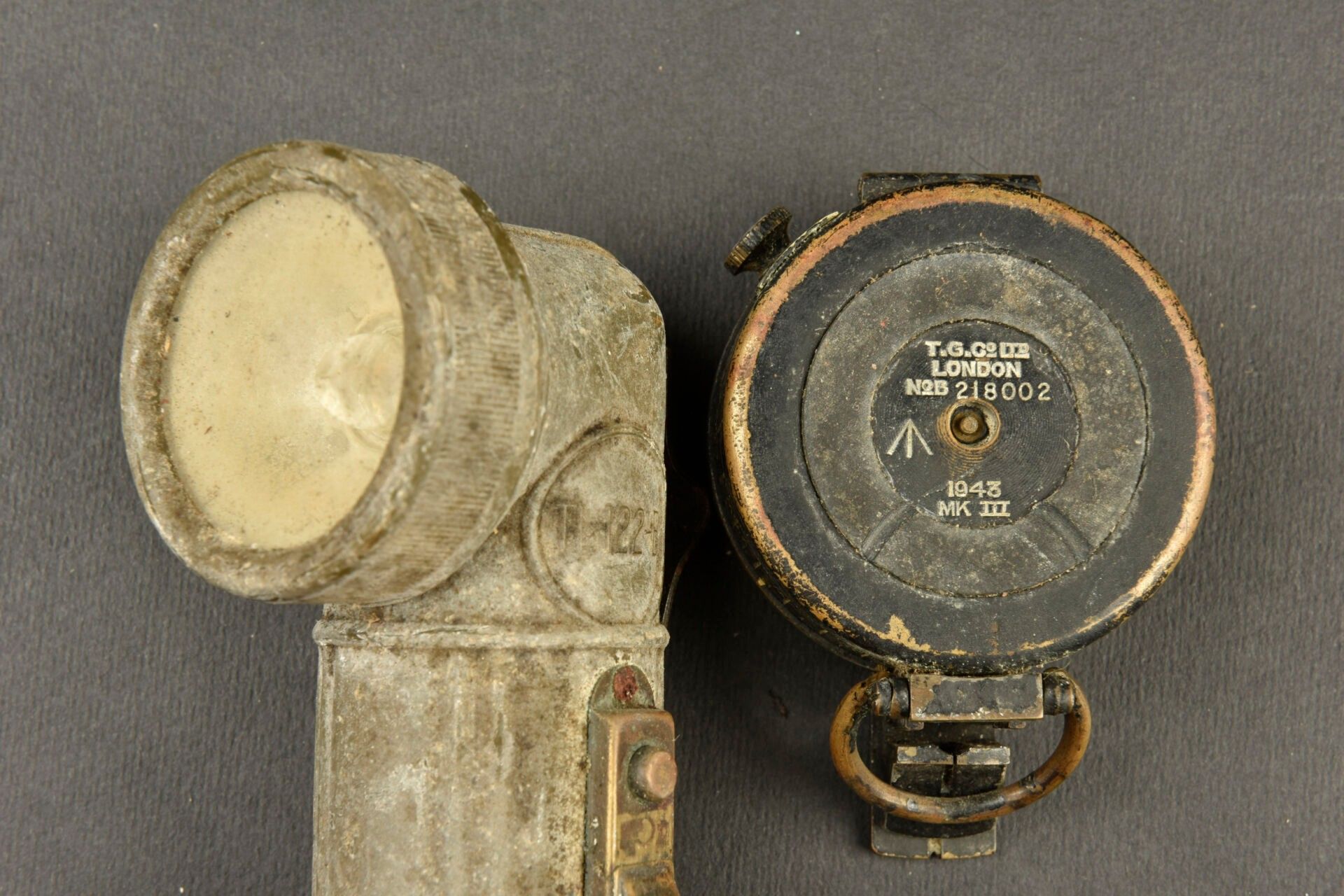 US equipment. Comprising one US mess knife dated 1918. Two mess knives with bakelite handles. One US mess fork and spoon. One fork marked USA MD. One TL122B torch, heavily moulded. A bandage in its original box. An empty Coca-Cola bottle, no visible date. A US dressing pouch, empty, heavily worn. An M-36 belt, no visible markings, the metal parts are oxidised. An M-44 shoulder strap, markings illegible. An M-36 belt, remains of illegible markings. A khaki honeycomb towel. An empty Stock NO 74-G-77 Goggles M 1944 box. A British-made metal compass, dated 1943. Some wear and patina to parts. Condition II+. For adults only.