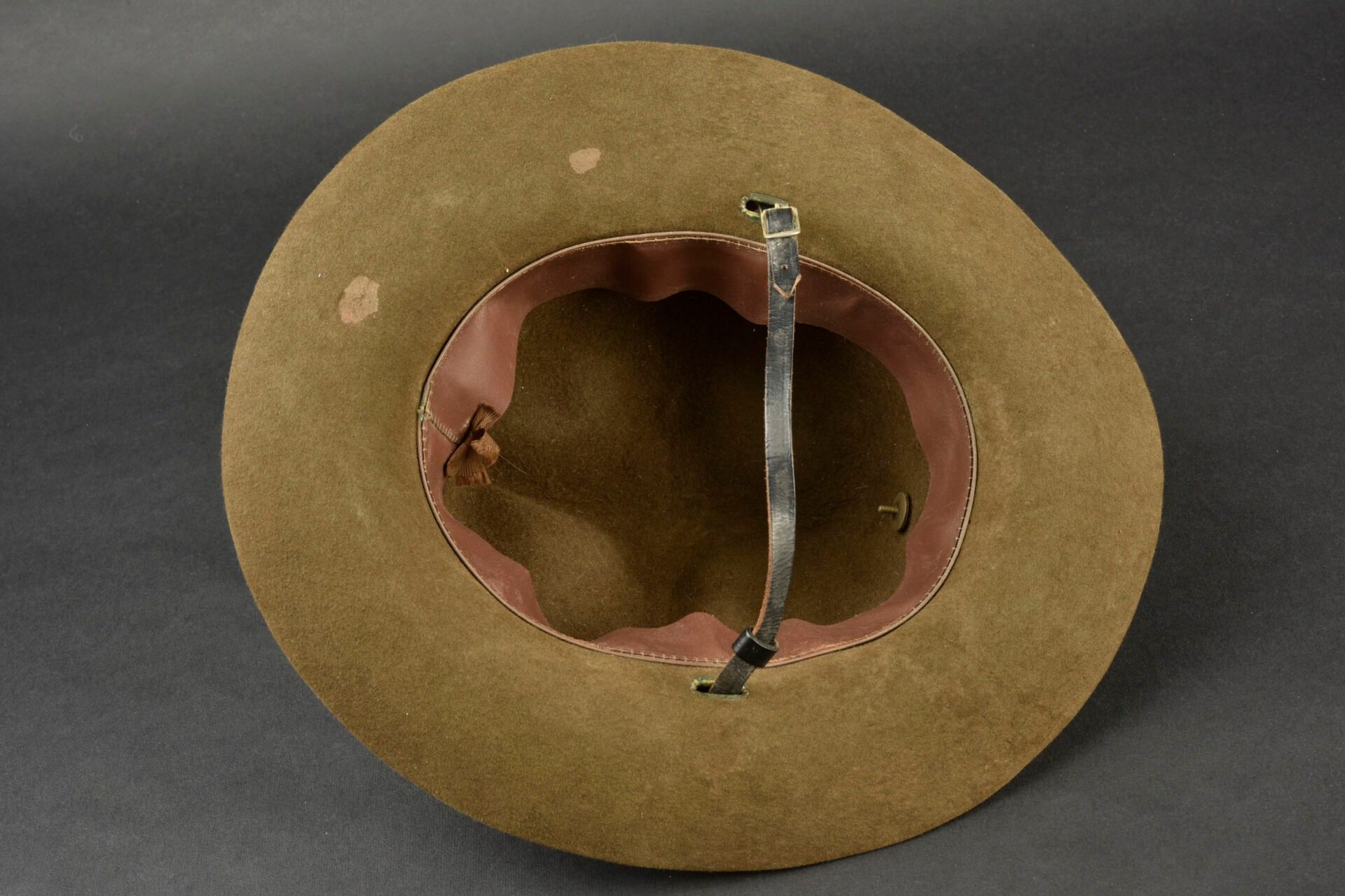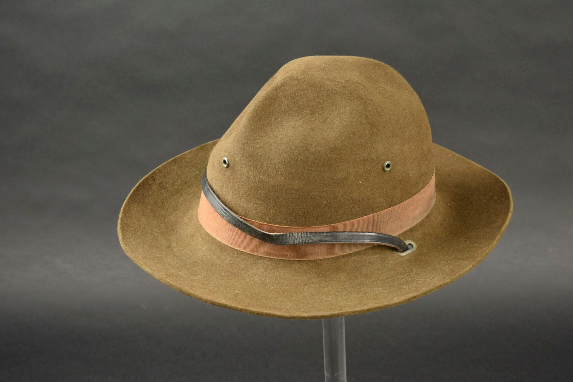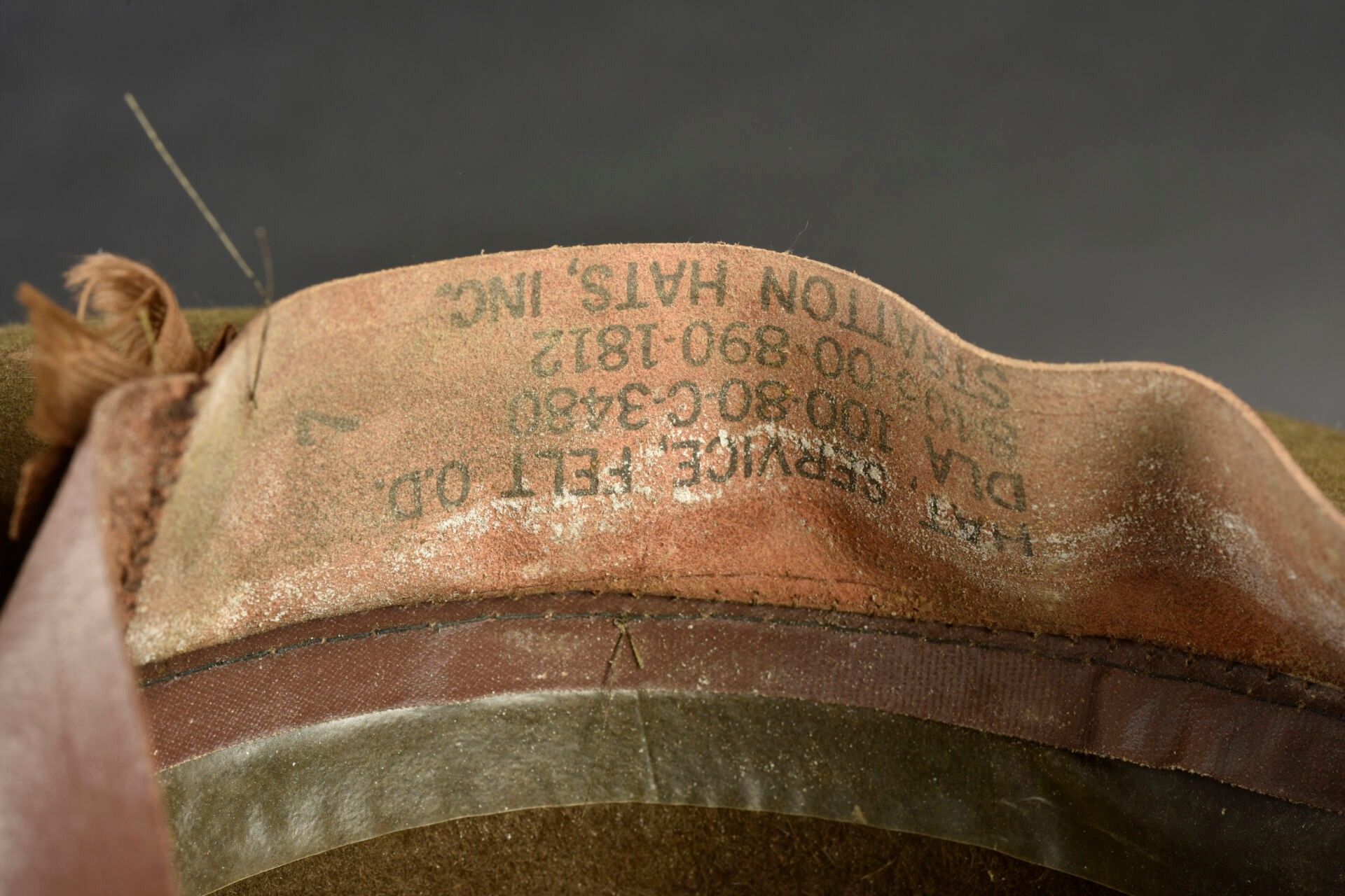 Campaign Hat. Khaki felt. Headband in brown cotton fabric. US troop badge in gilt metal, screw clasp. Full leather chinstrap. Brown imitation leather sweatband. Markings under the sweatband Hat Service Felt OD Dla 100-80-C-3480 8405-00-890-1812 Stratton Hats INc. Some wear and patina to the piece, as well as missing parts. Condition II+. 2+