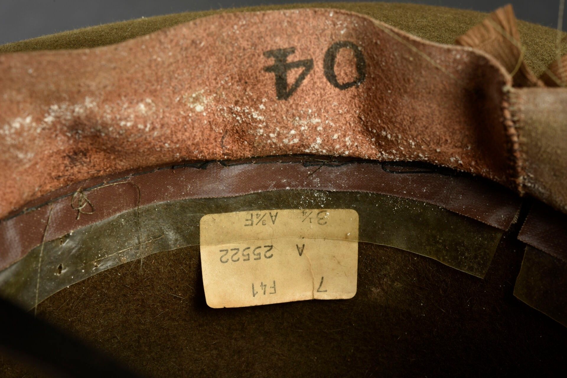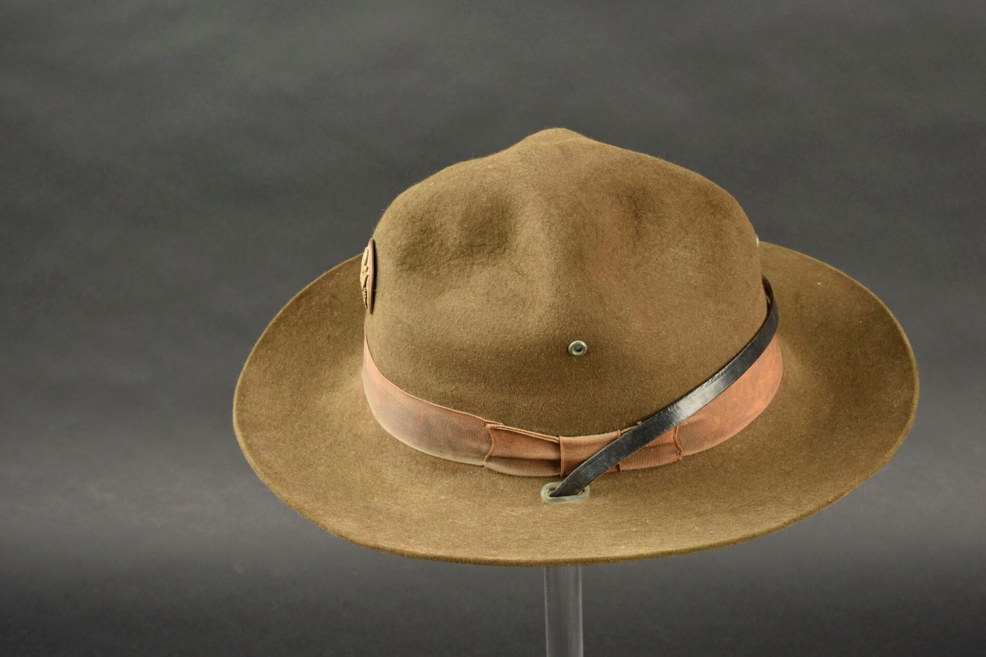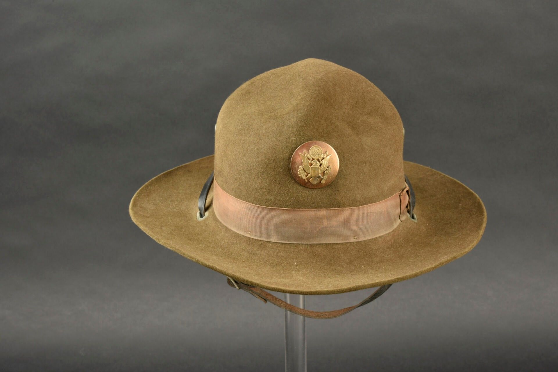 Campaign Hat. Khaki felt. Headband in brown cotton fabric. US troop badge in gilt metal, screw clasp. Full leather chinstrap. Brown imitation leather sweatband. Markings under the sweatband Hat Service Felt OD Dla 100-80-C-3480 8405-00-890-1812 Stratton Hats INc. Some wear and patina to the piece, as well as missing parts. Condition II+. 2+