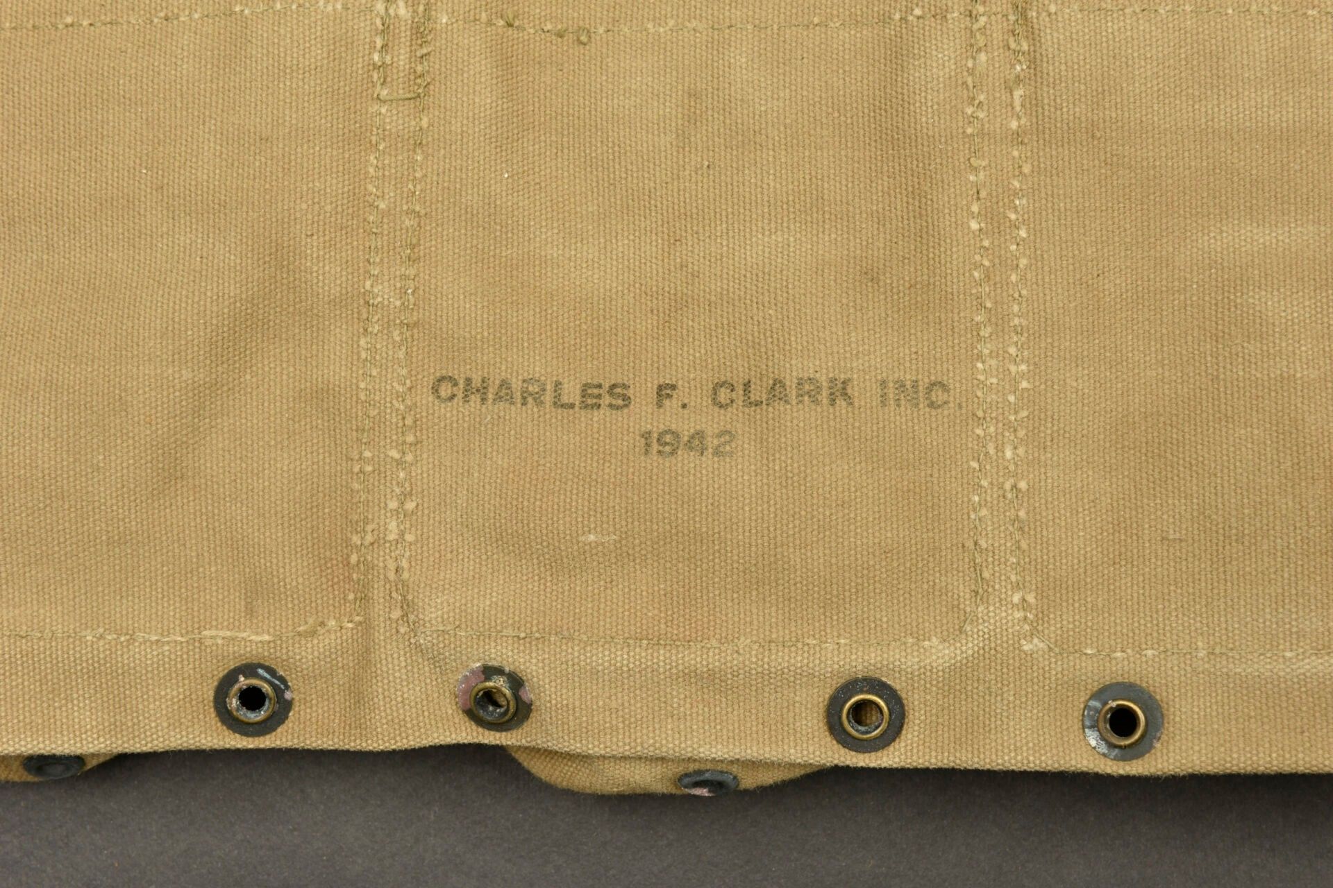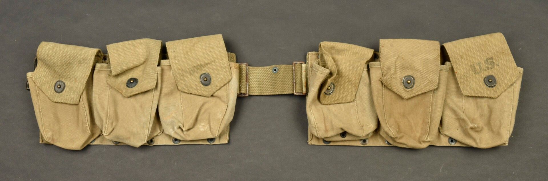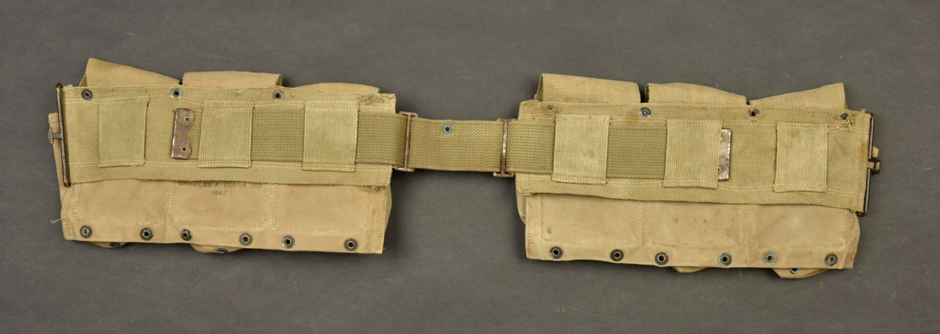 FM BAR magazine belt. Uniform set in OD canvas. Nice US marking on one flap. Hook closure is complete. Snaps are functional. Made by Charles F Clark Inc 1942. The metal parts are partially oxidised. Some wear and patina. Condition II+. 2+