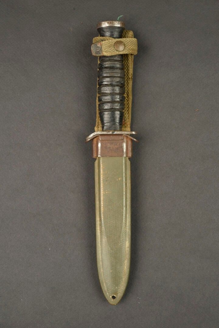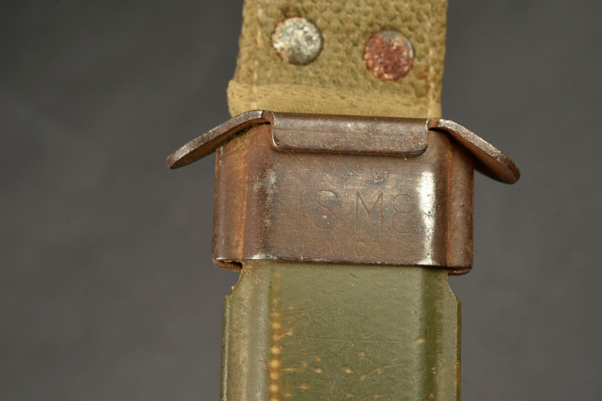 USM3 knife. Handle with numerous leather rings. These are badly worn. Oxidised pommel. Blade heavily sharpened and oxidised. USM3 Utica markings are almost illegible. USM8 scabbard. 80% khaki colour. The snap is functional. Heavy wear and patina. Condition II-. For adults only.