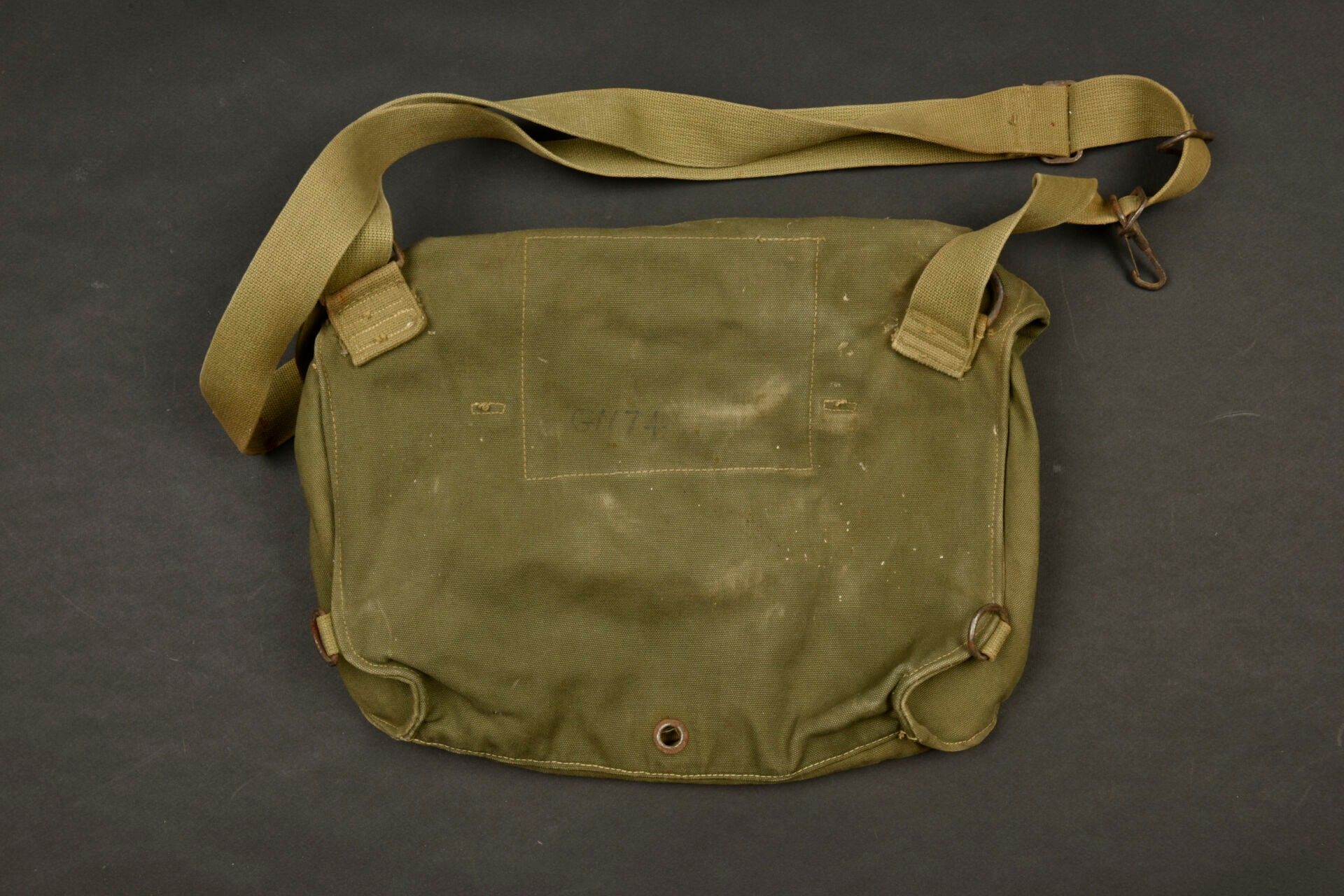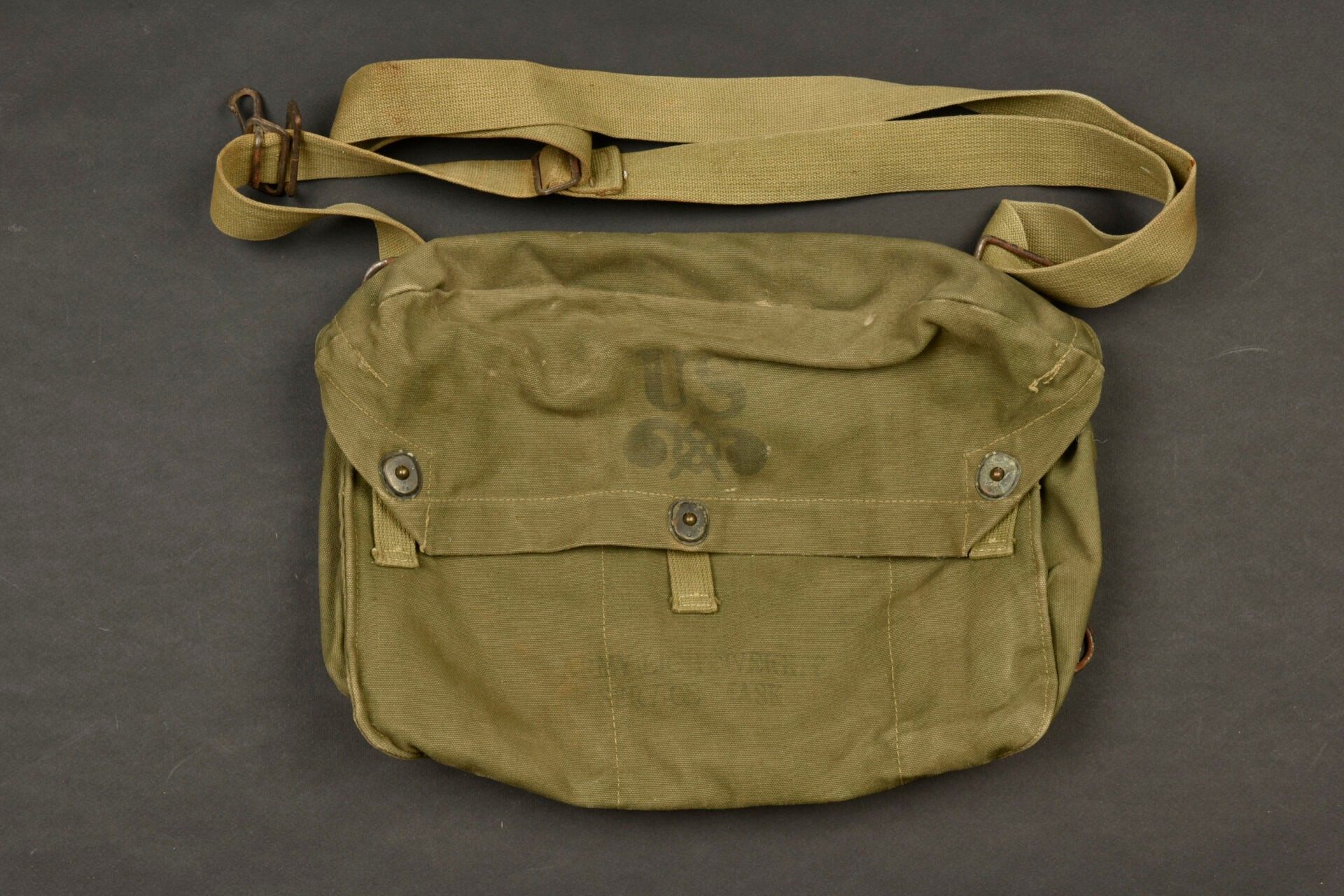 US anti-gas mask cover. Heavy OD canvas. Empty. All straps are present. Good US markings on flap. Markings partially illegible. Some wear and patina, as well as a few stains. Condition II+. 2+