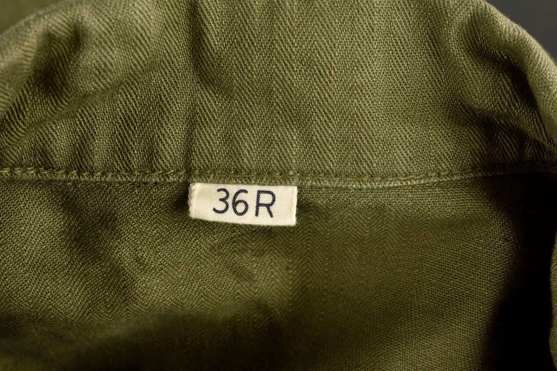 HBT jacket. OD7 cotton fabric. All buttons present and stamped with 13 stars. Label in collar indicating size 36R. Full gas flap. Manufacturer's label present, but illegible. Some wear, patina and stains. Condition II+. 2+