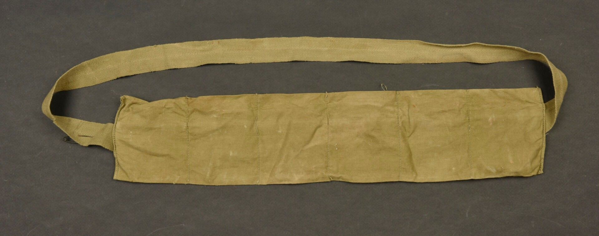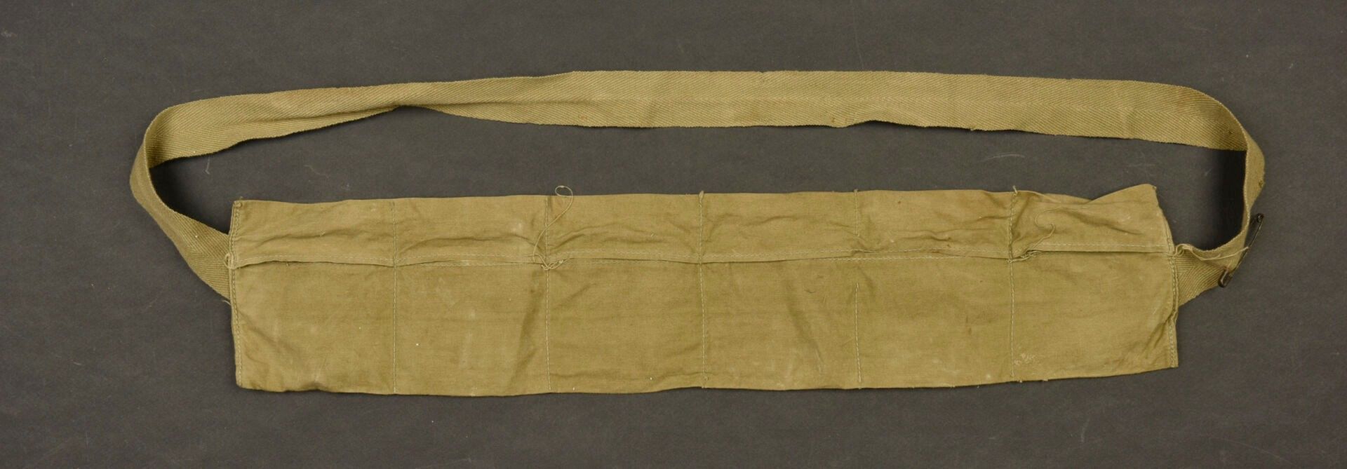 US bandoleer. Khaki canvas, six visible compartments. No visible markings. One safety pin present, and partially oxidised. Some wear, patina and stains. Condition II+. 2+