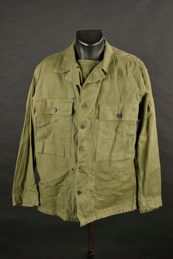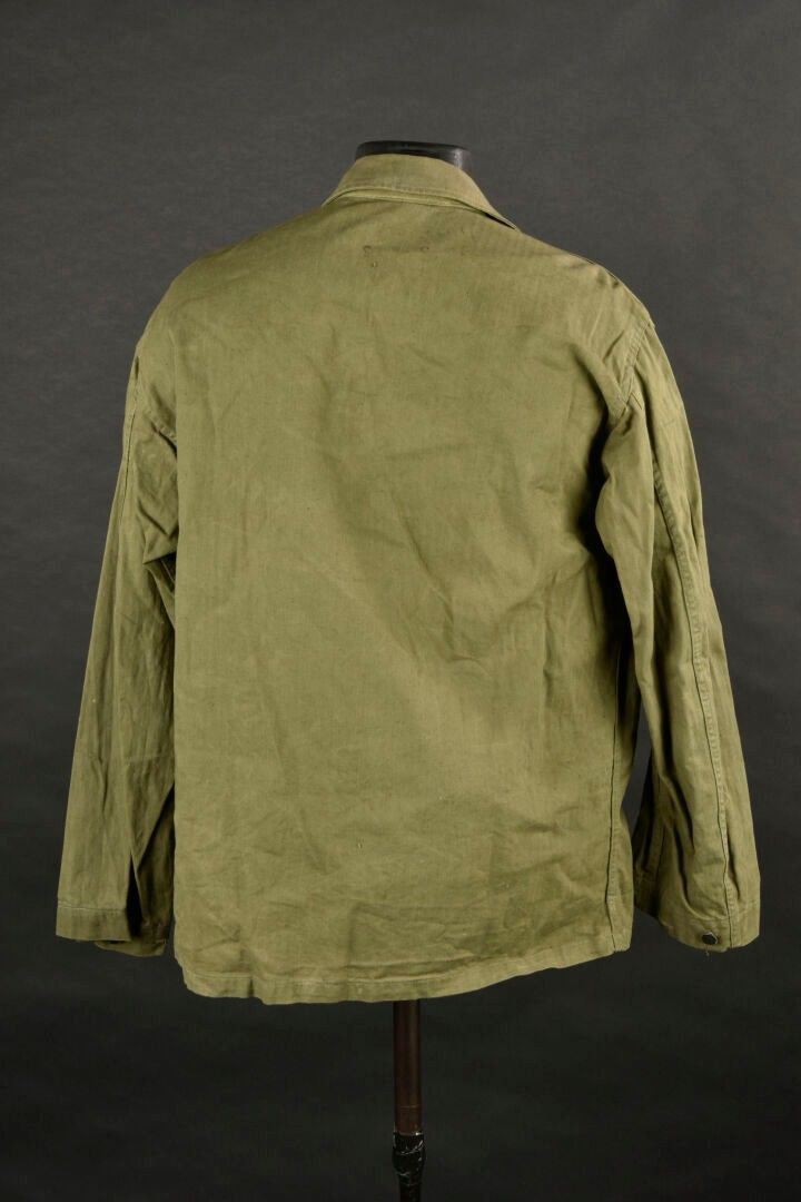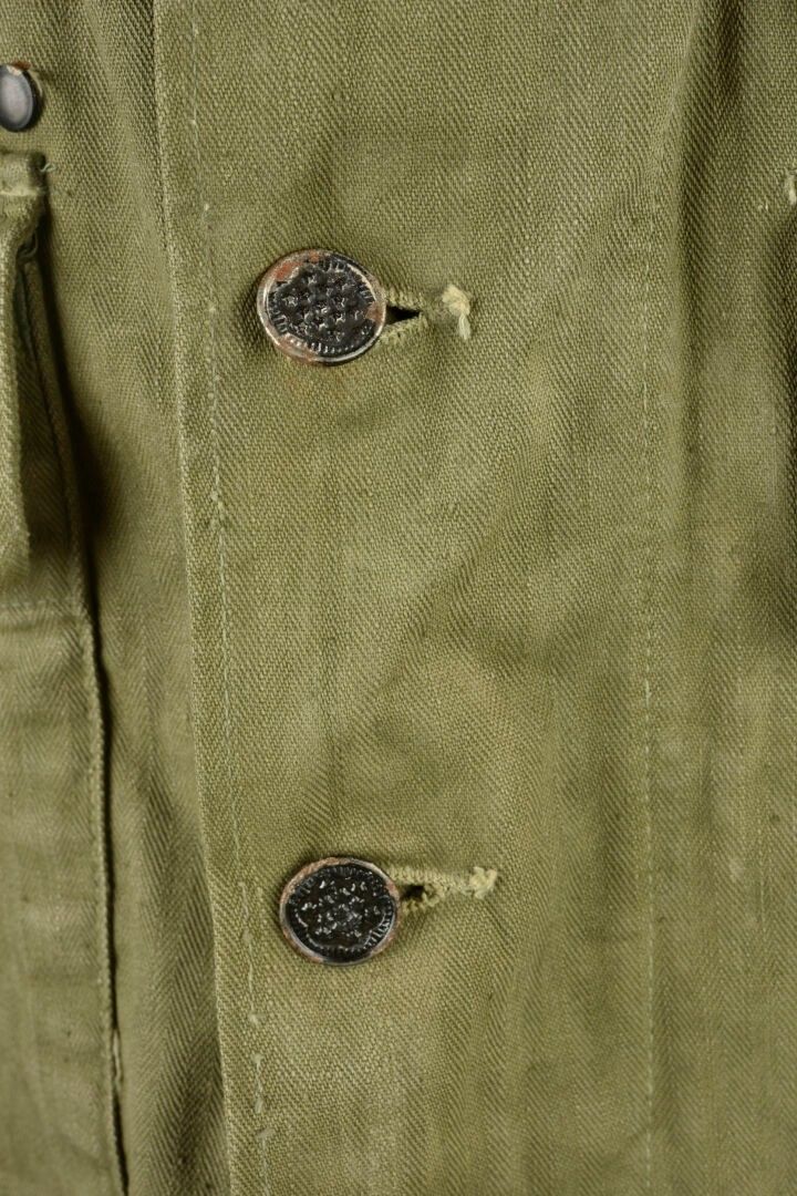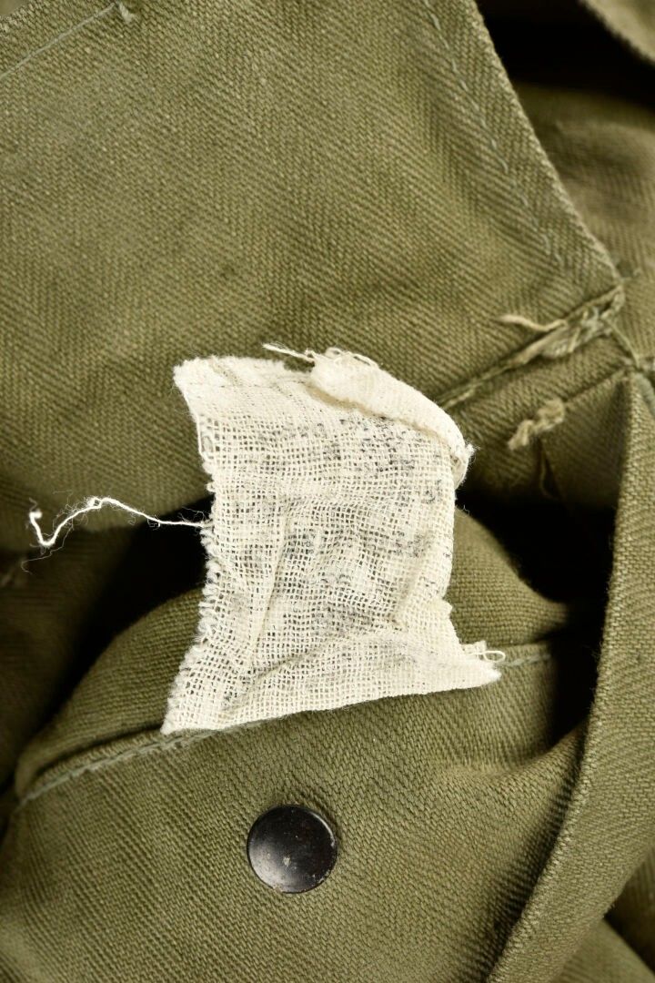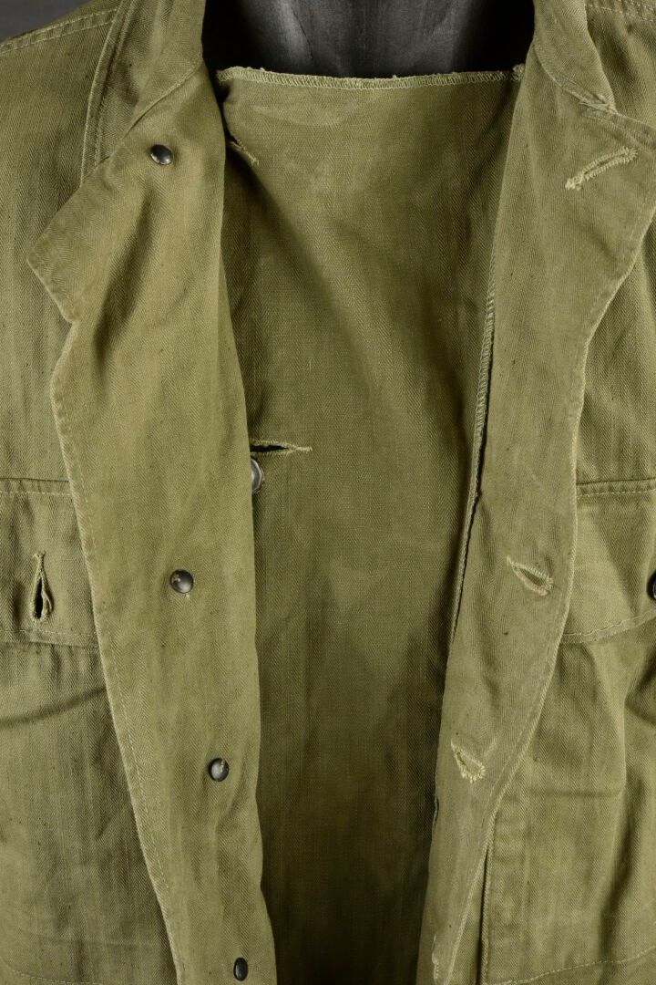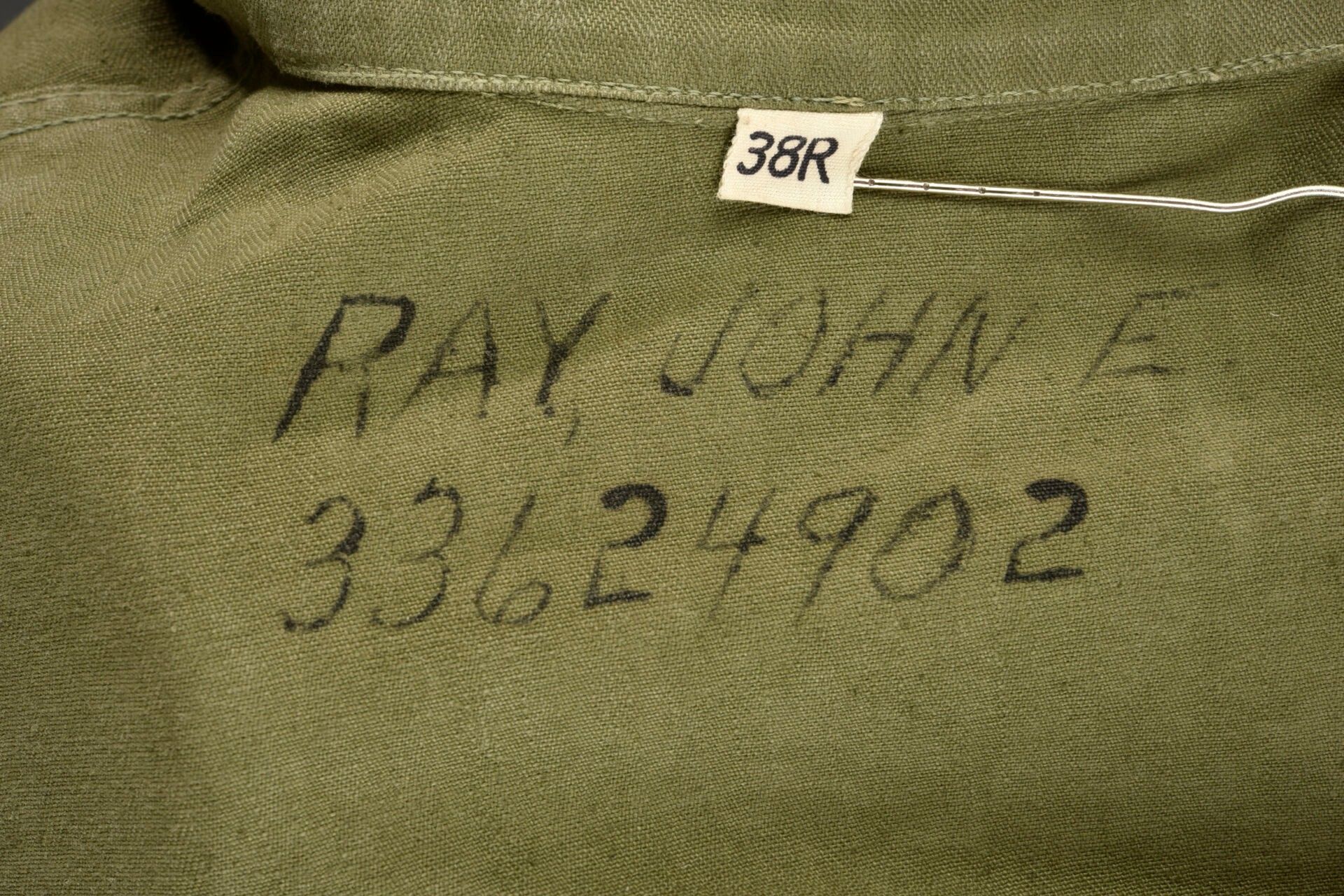 HBT name jacket. Made from OD7 HBT fabric. The texture of the fabric may suggest that it has been impregnated with an anti-gas product, in fact the fabric is sticky to the touch. All buttons are present and stamped with thirteen stars. Full anti-gas bib. Label in collar indicating size 38R. Name tag in collar Ray John E 33624902. Manufacturer's label present but illegible. According to our research Ray Joh, is a resident of Alaska, he was drafted on May 4th 1943 in Allentown Pennsylvania. Some wear, patina and stains. Condition II+. 2+