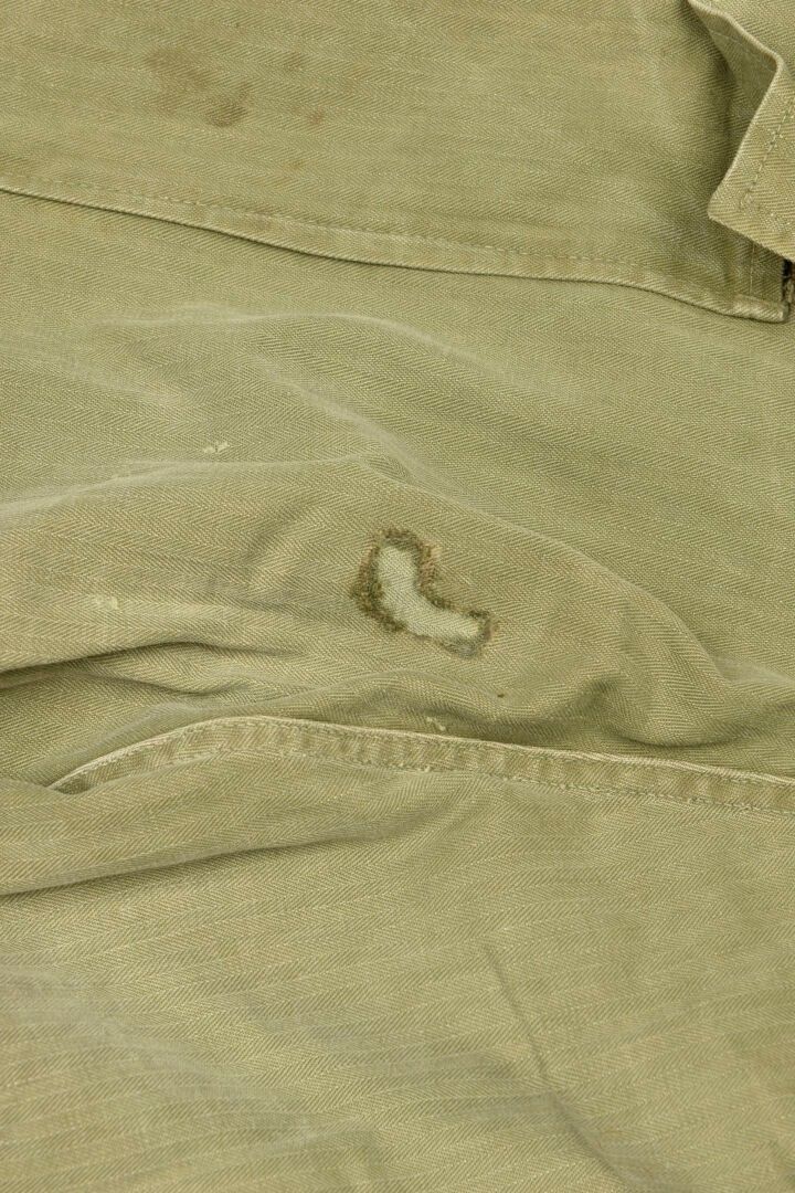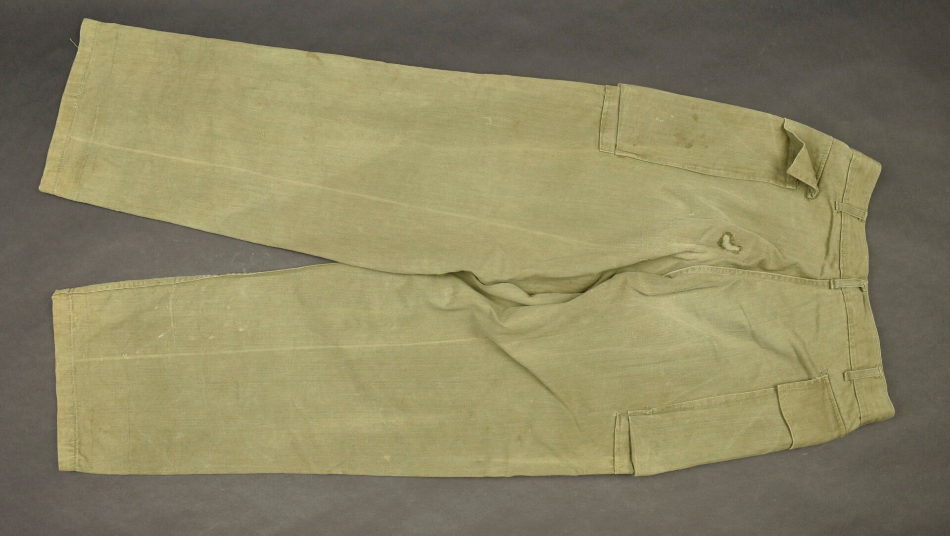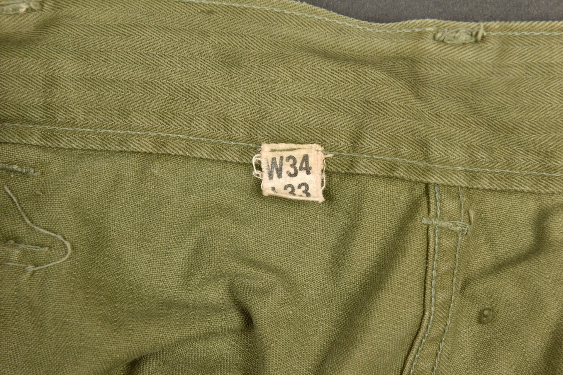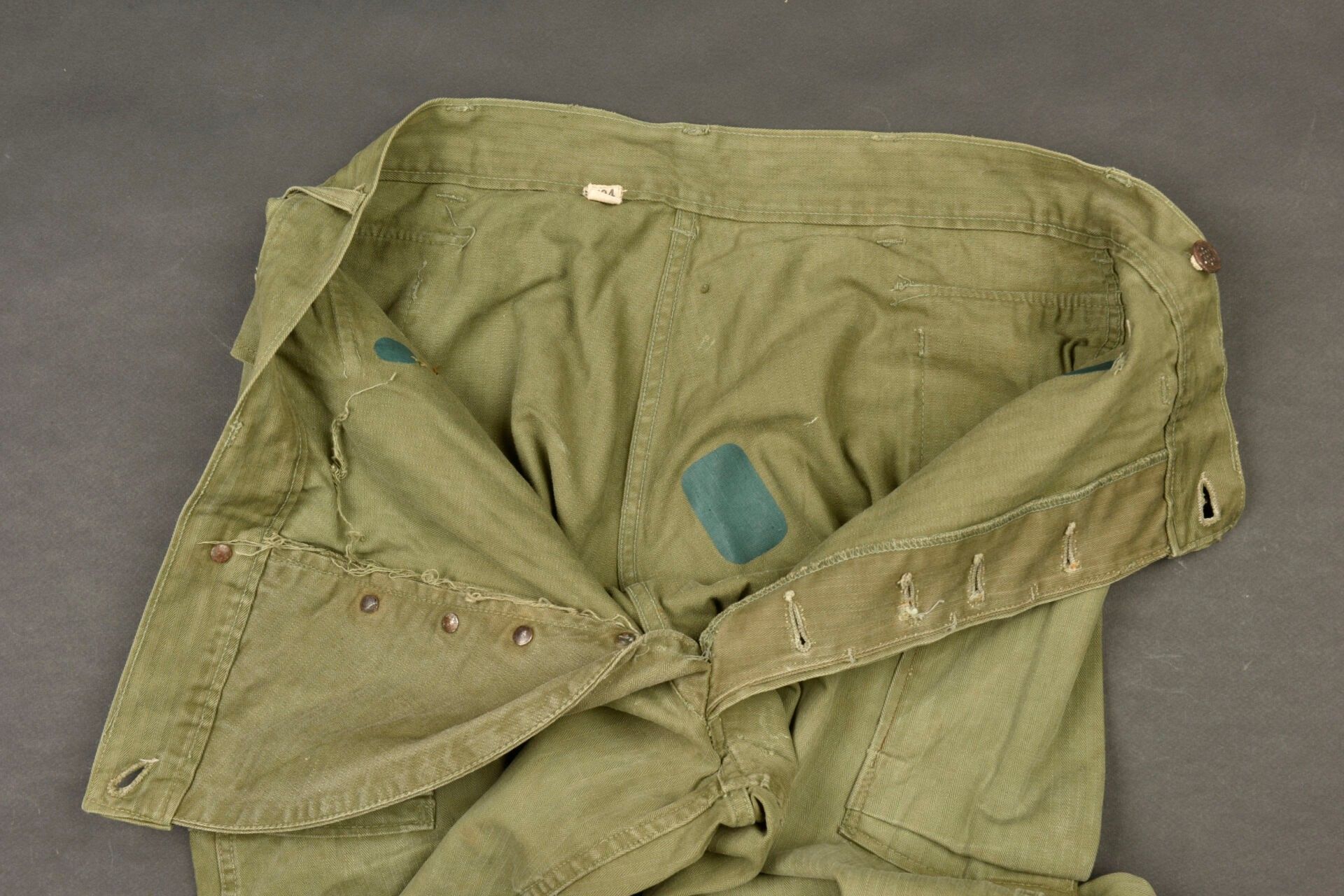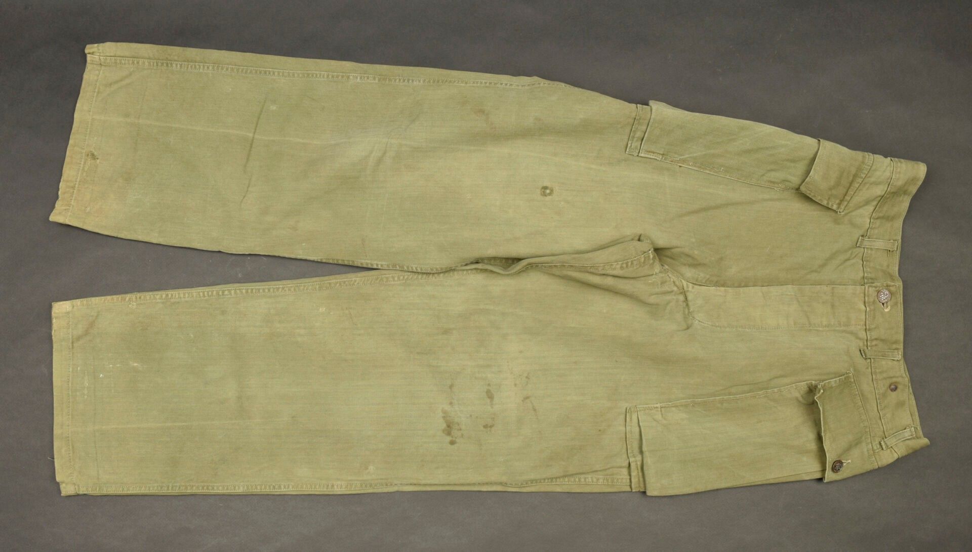 HBT trousers. HBT cotton fabric, OD colour, all buttons present and stamped with 13 stars. Full gas flap. Two hip cargo pockets. Label showing size W34 L33. Manufacturer's label missing. Some patch repairs visible on trouser lining. Some wear and patina to be noted, as well as a few repairs. Condition II+. 2+