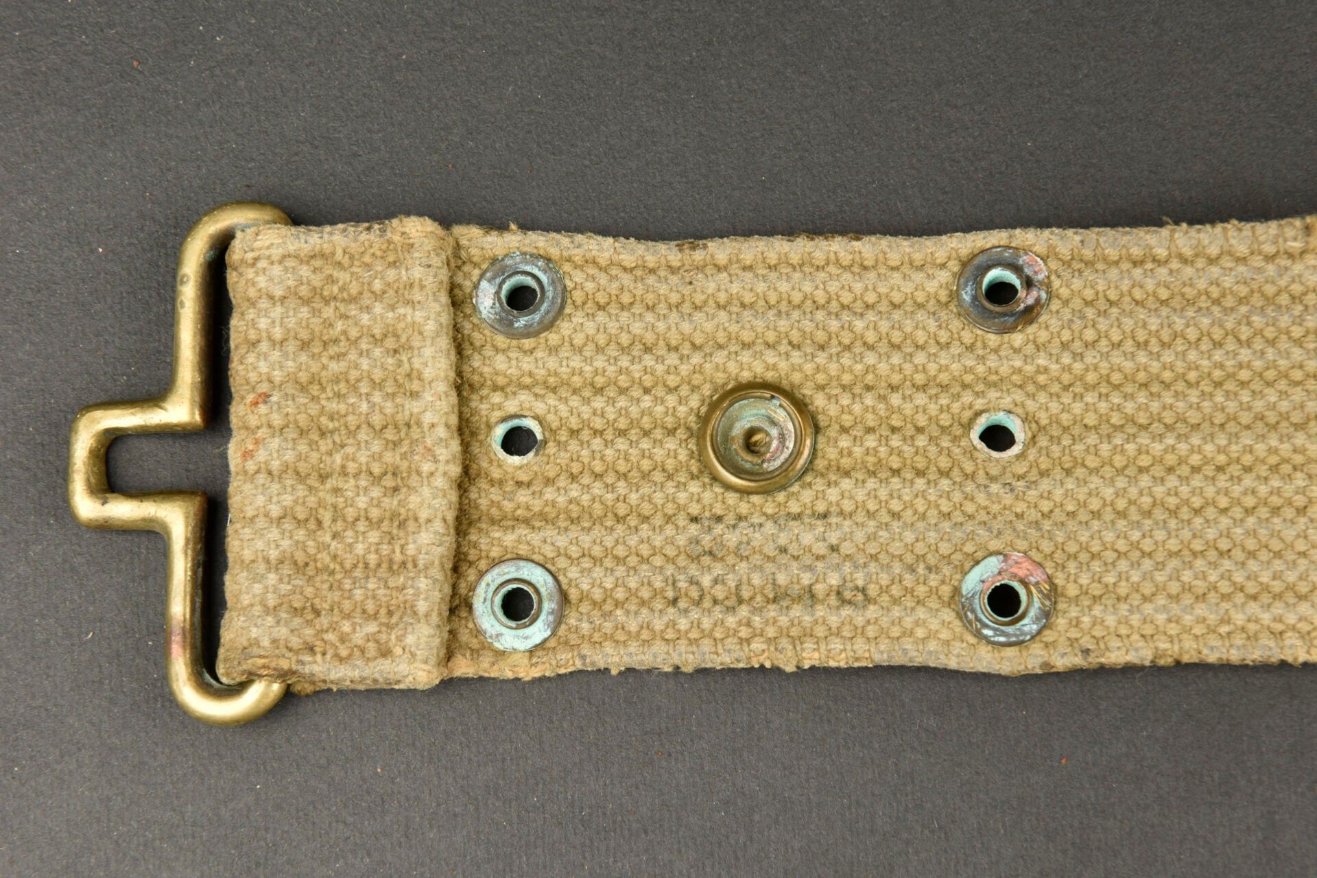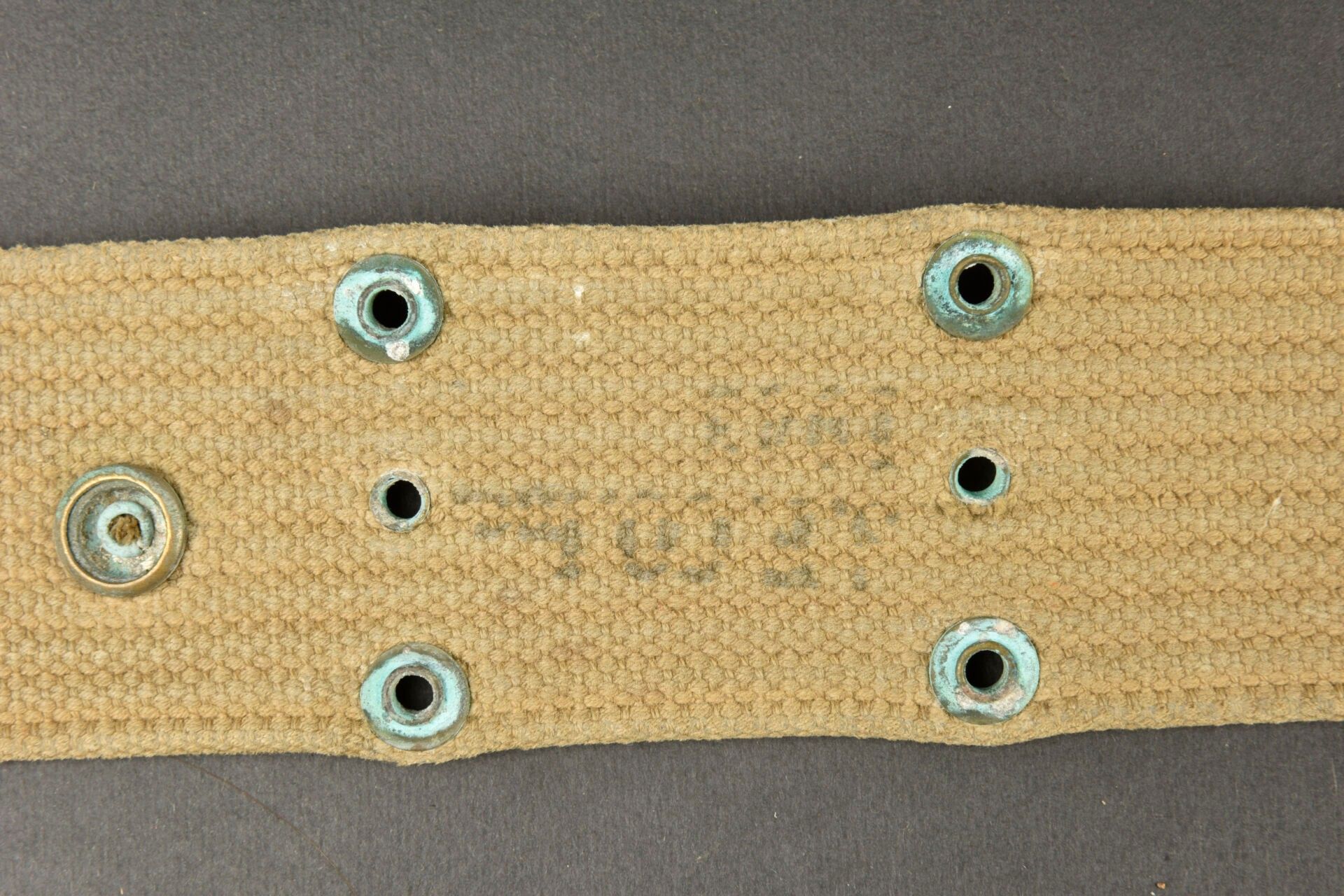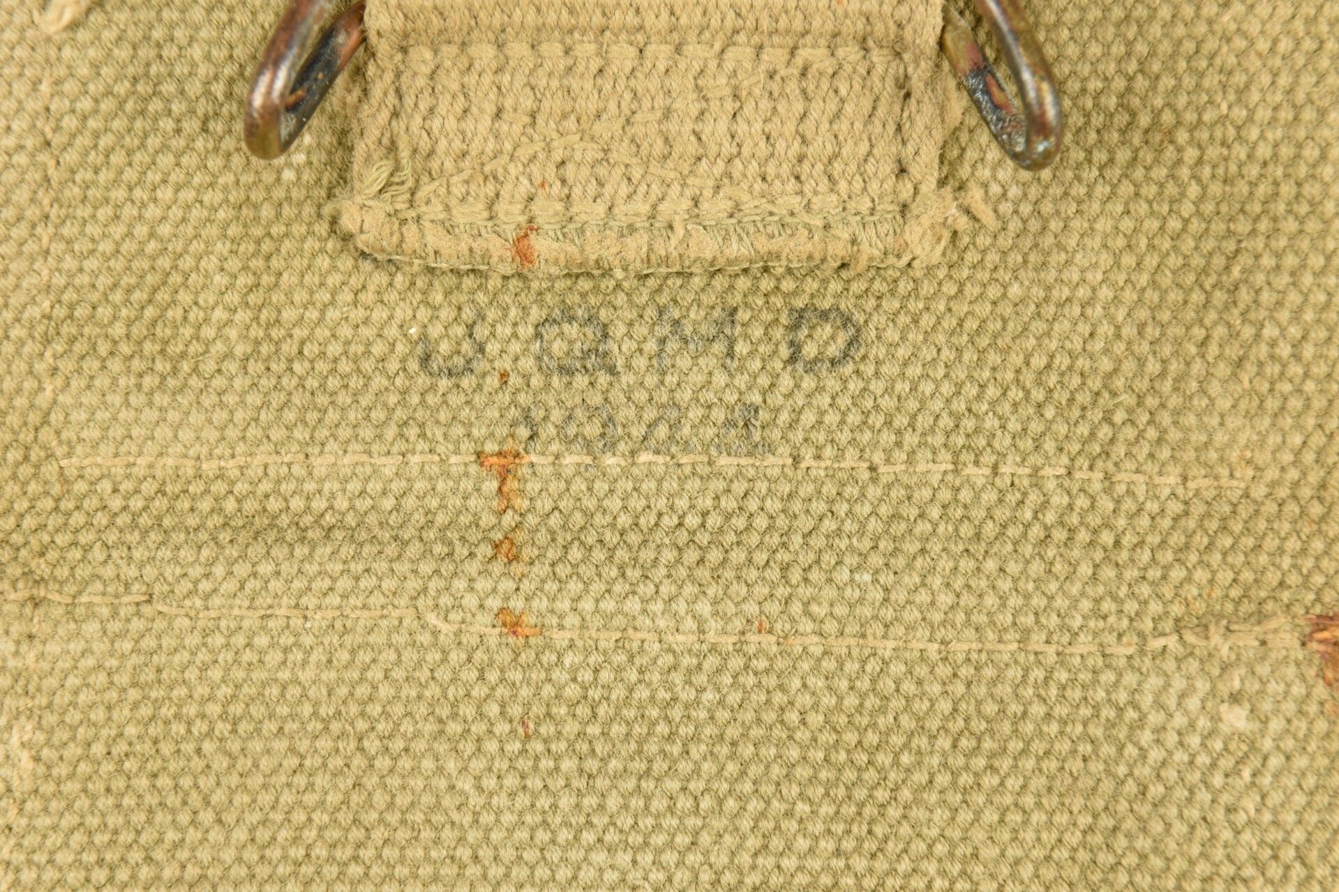 US M-36 belts. Two OD canvas belts. Brass and metal buckles. The markings are illegible. Attached is a heavy OD canvas grenade pouch with three compartments. The press studs are functional. Nice US marking on one flap. Made by JQMD 1944. The thigh straps are incomplete. Some wear, patina and stains. Condition II+. 2+