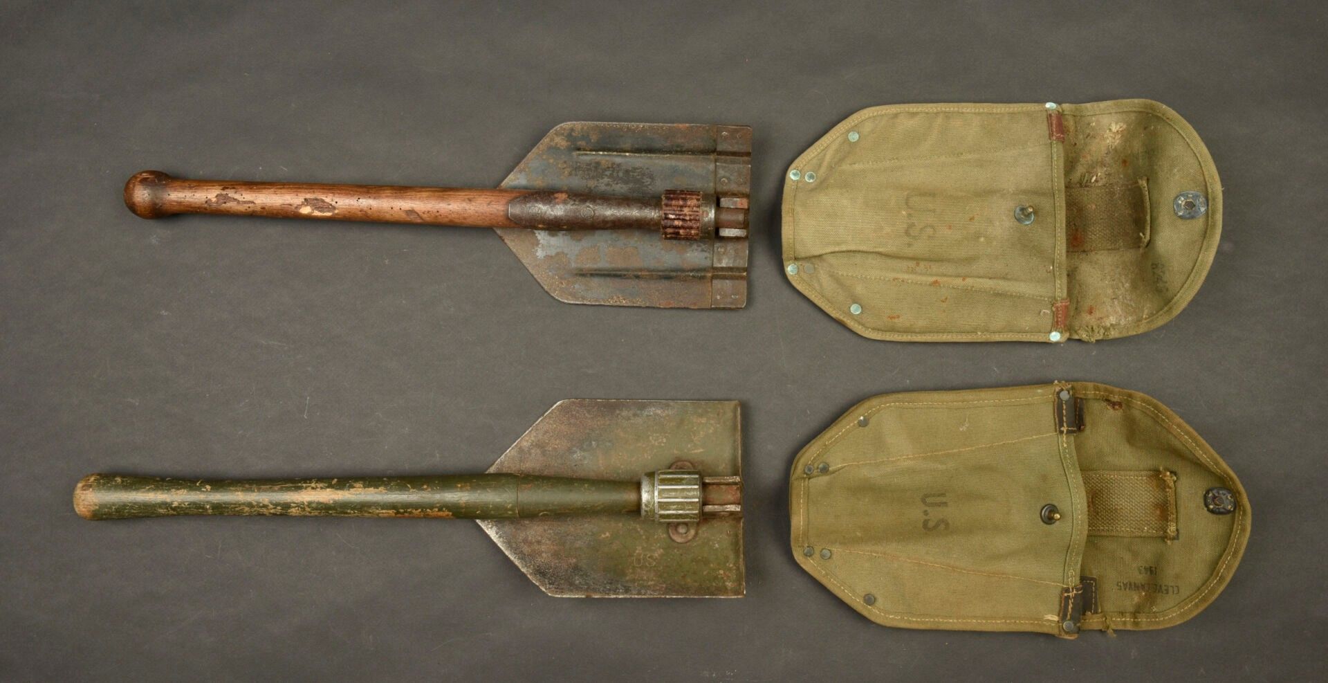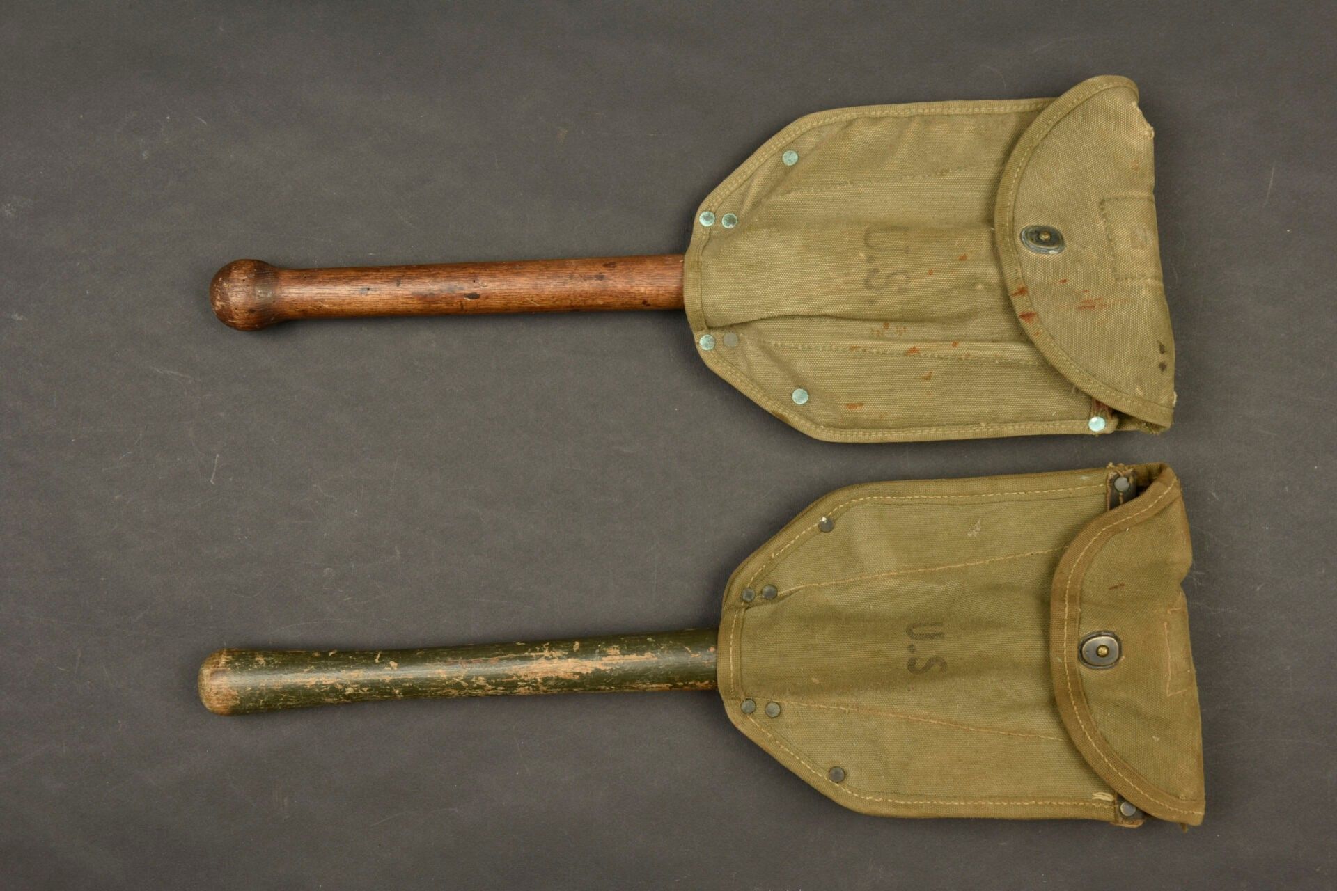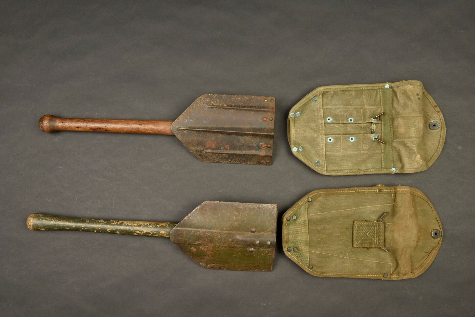 US shovels. Comprising two M-43 shovels. One wooden handle has 60% khaki paint, the second is completely unpainted, it is also eaten by worms. The metal parts are oxidised, only one part is marked AMES. Heavy OD canvas covers, the press studs are functional. The belt attachment hooks are present. One is adjustable, the other is not. The manufacturer's markings are partially illegible. There is some wear and patina to the parts, as well as stains and tears. Condition II+. 2+