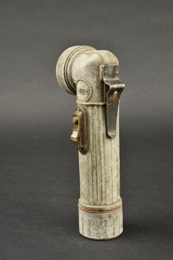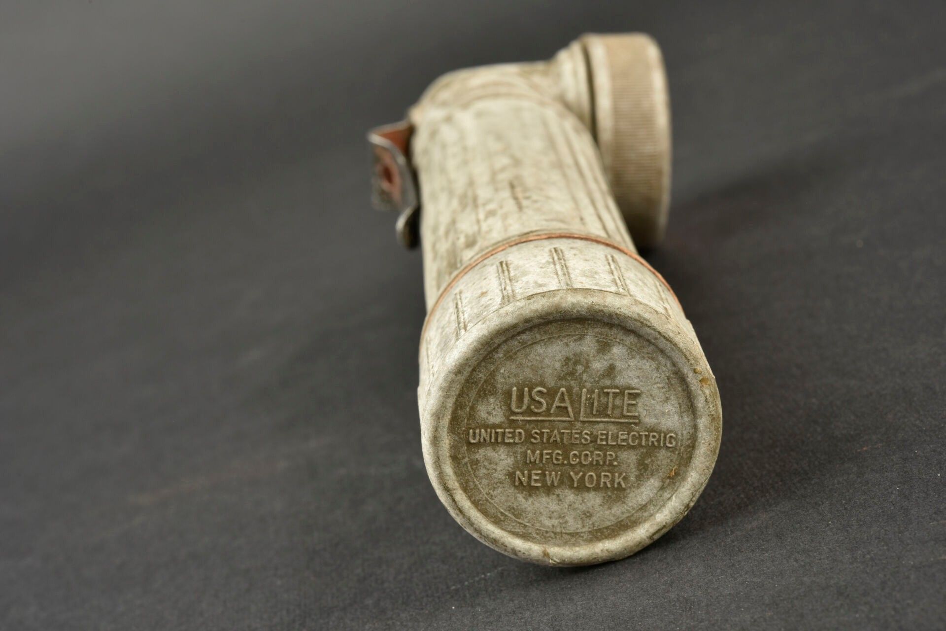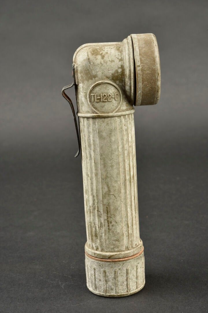 TL 122-C flashlight. In khaki bakelite. The battery compartment is present, as is the bulb. Plastic lens is complete but has become opaque over time. The plastic has also turned white. The mounting hook is complete. TL-122-C markings. All moving parts are functional. USA Lite manufacture. Some wear and patina, as well as stains and scratches. Condition II+. 2+