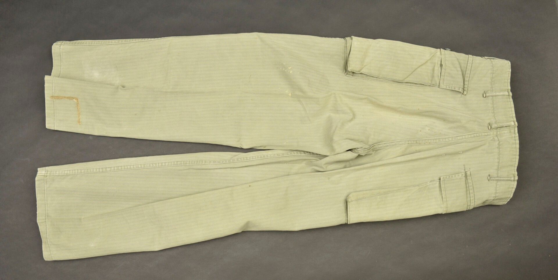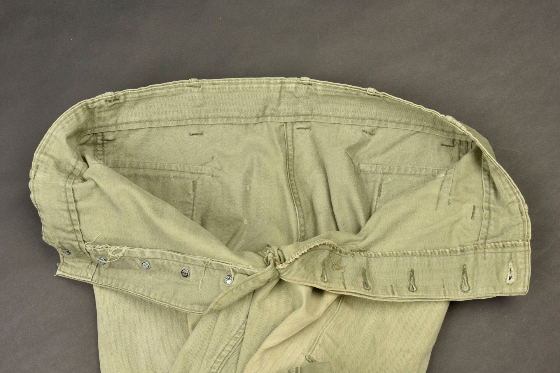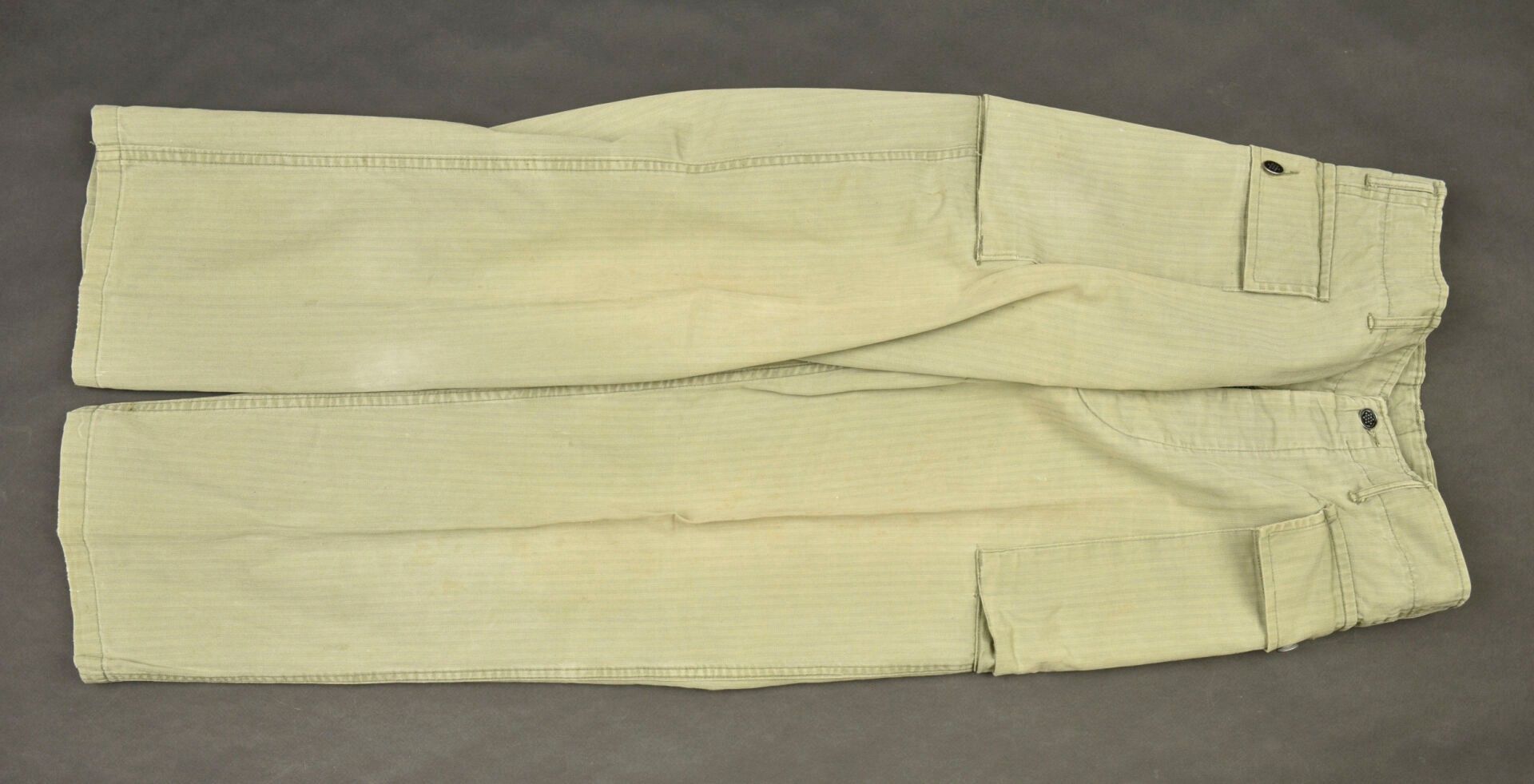 HBT trousers. HBT OD cotton fabric. The outer colour is heavily sun faded. All buttons are present and stamped with thirteen stars. Model without gas flap. Manufacturer's label is missing. Some wear and patina, as well as stains and tears. Condition II+. 2+