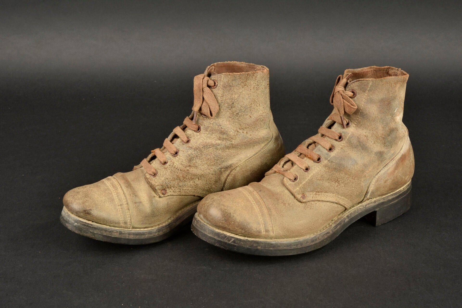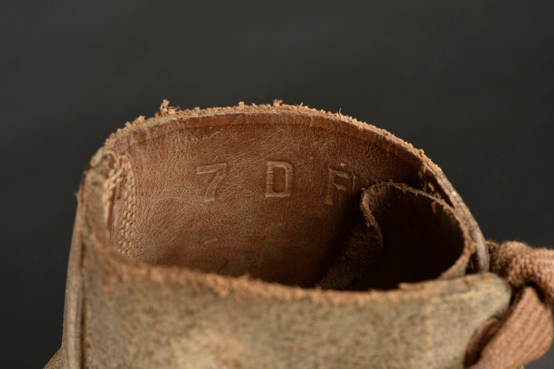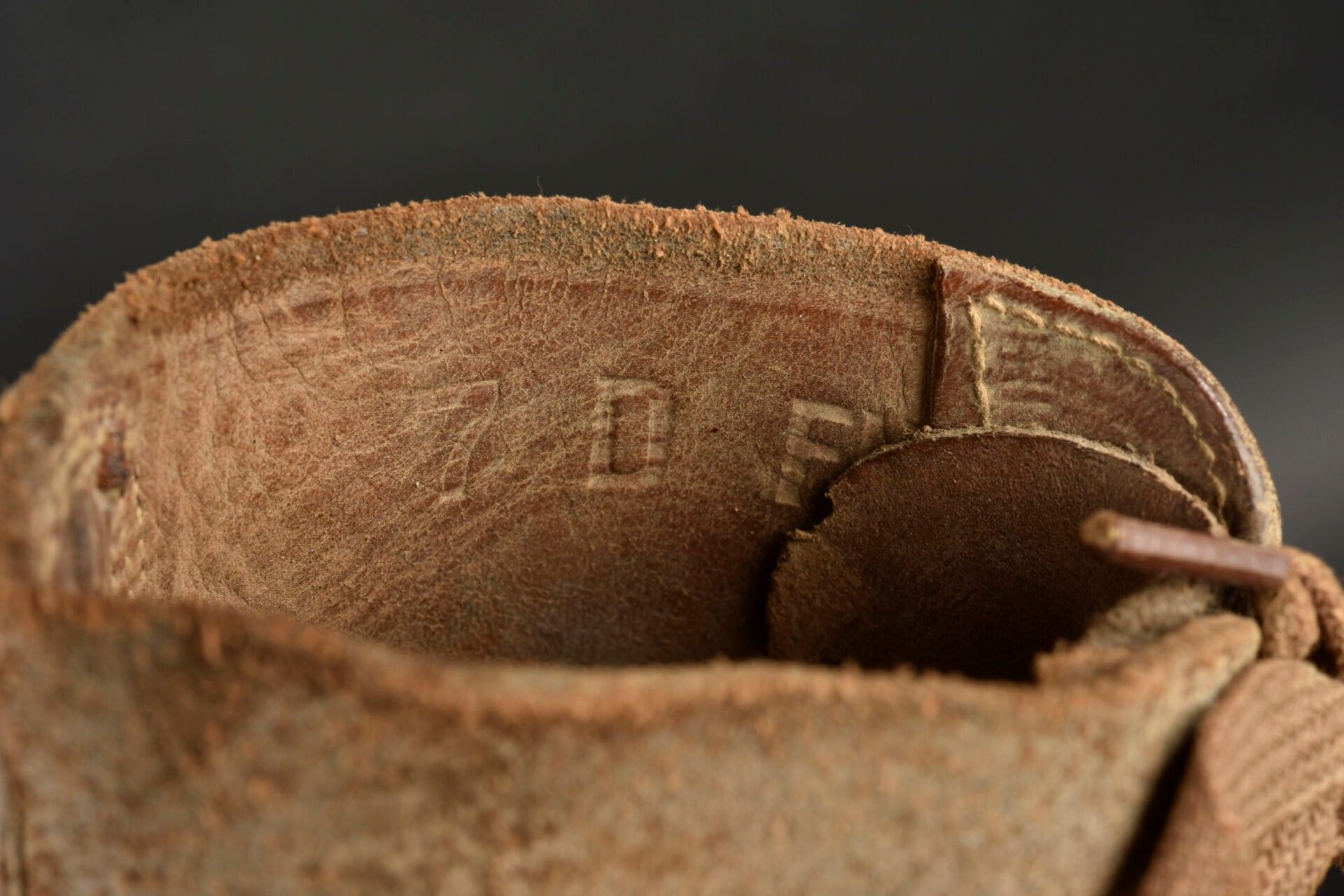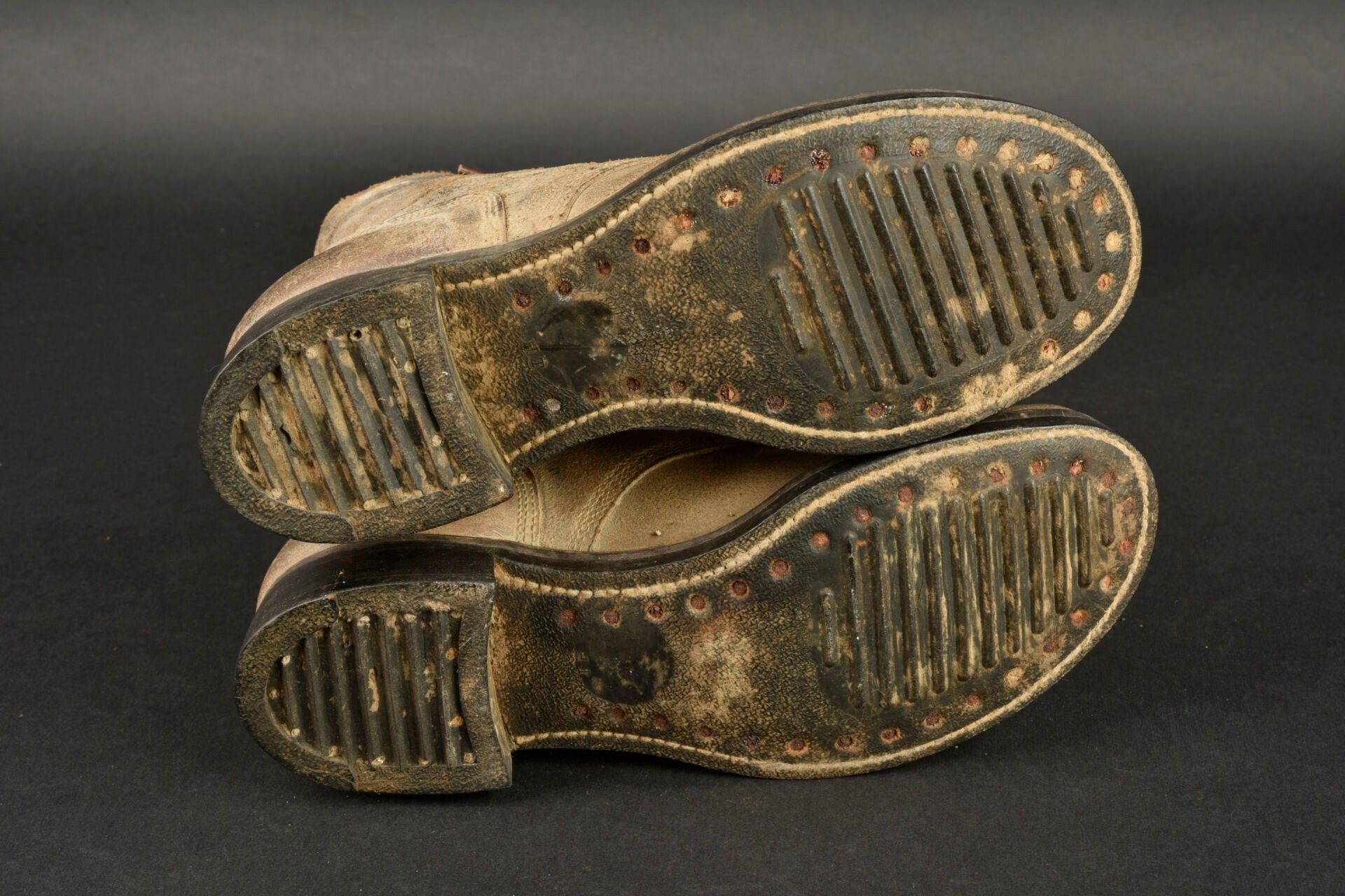 US Brodequins. Homogeneous pair of leather boots. Toe caps. Laces are complete. Markings on the side 7 D FN. Rubber soles and heels, marked HB. Internal markings partially illegible, but dated 30 January 1943. The lacing eyelets are partially oxidised. Some wear and patina. Condition II+. 2+