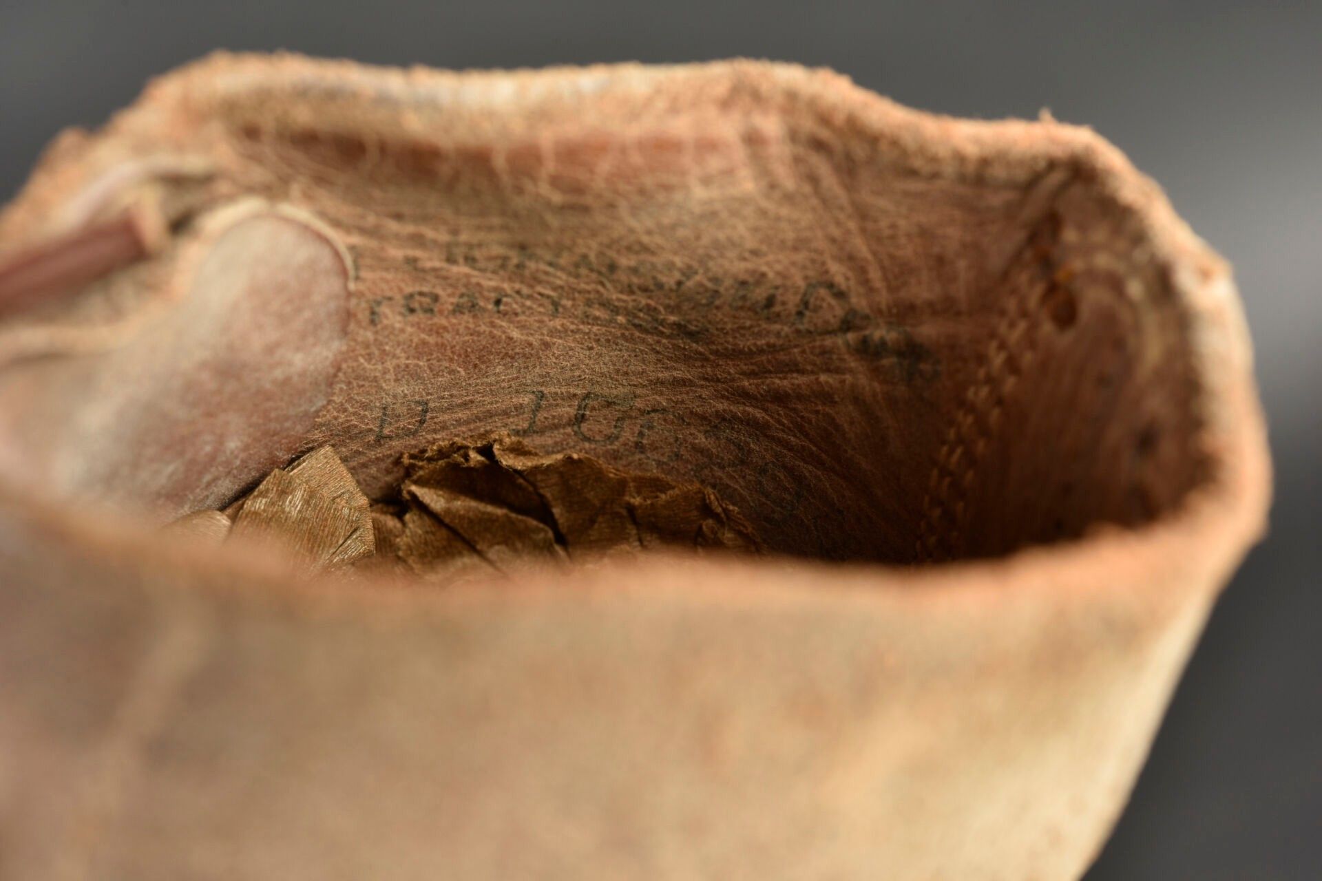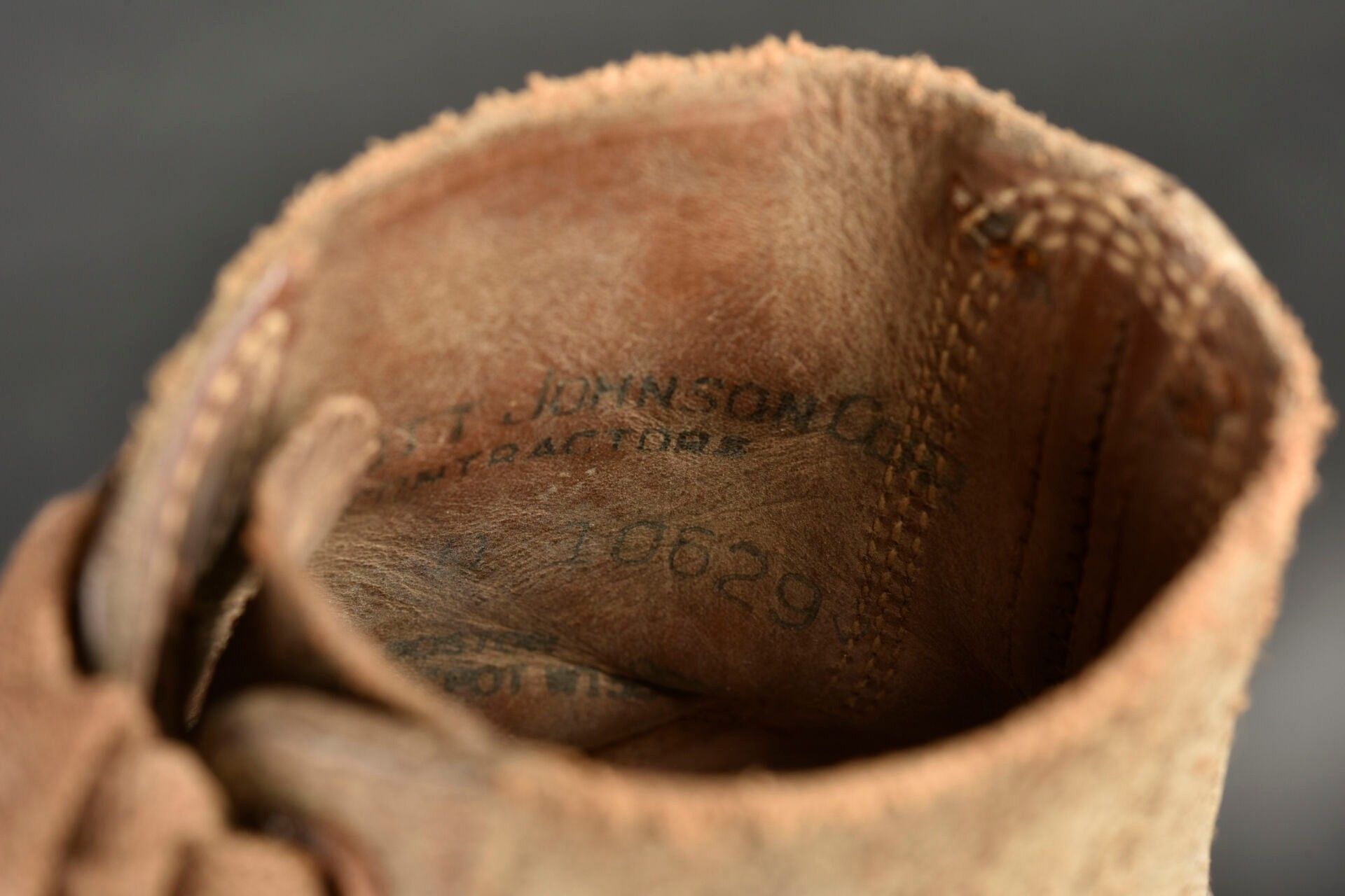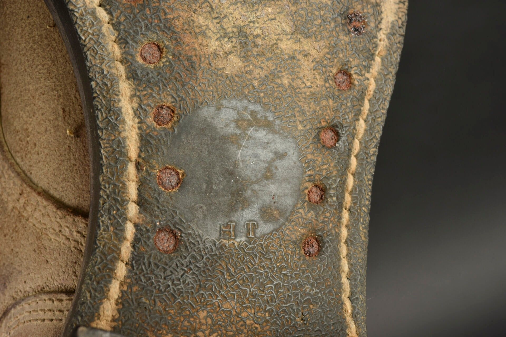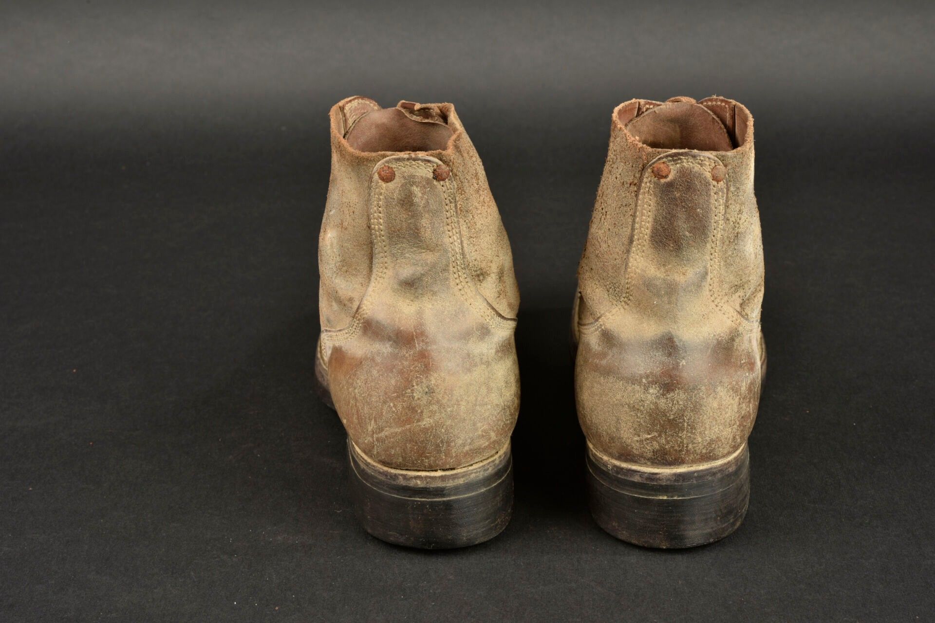 US Brodequins. Homogeneous pair of leather boots. Toe caps. Laces are complete. Markings on the side 7 D FN. Rubber soles and heels, marked HB. Internal markings partially illegible, but dated 30 January 1943. The lacing eyelets are partially oxidised. Some wear and patina. Condition II+. 2+