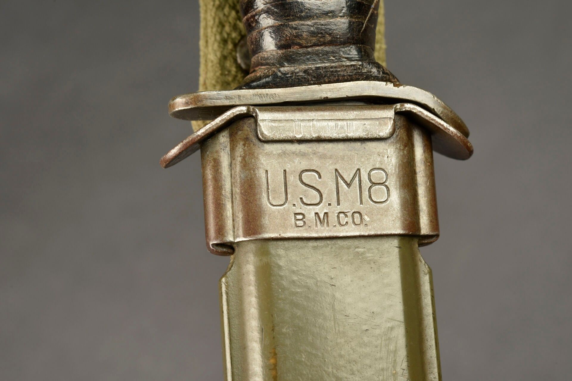 USM3 knife. Metal pommel with a fine US Ordnance Corps grenade. Handle with leather rings. Beautiful blade, 90% in its original colour. USM3 Utica hilt. USM8 BMCO scabbard, in its original 90% colour. Model with belt clip. The snap is functional. Some wear and patina. Condition II+. For adults only.